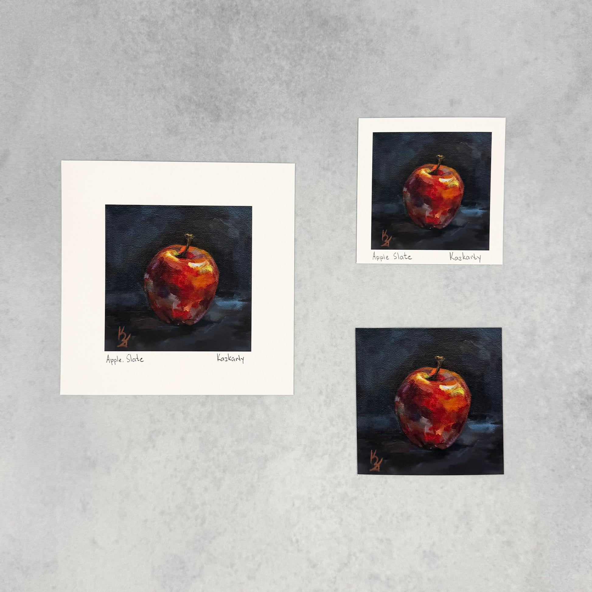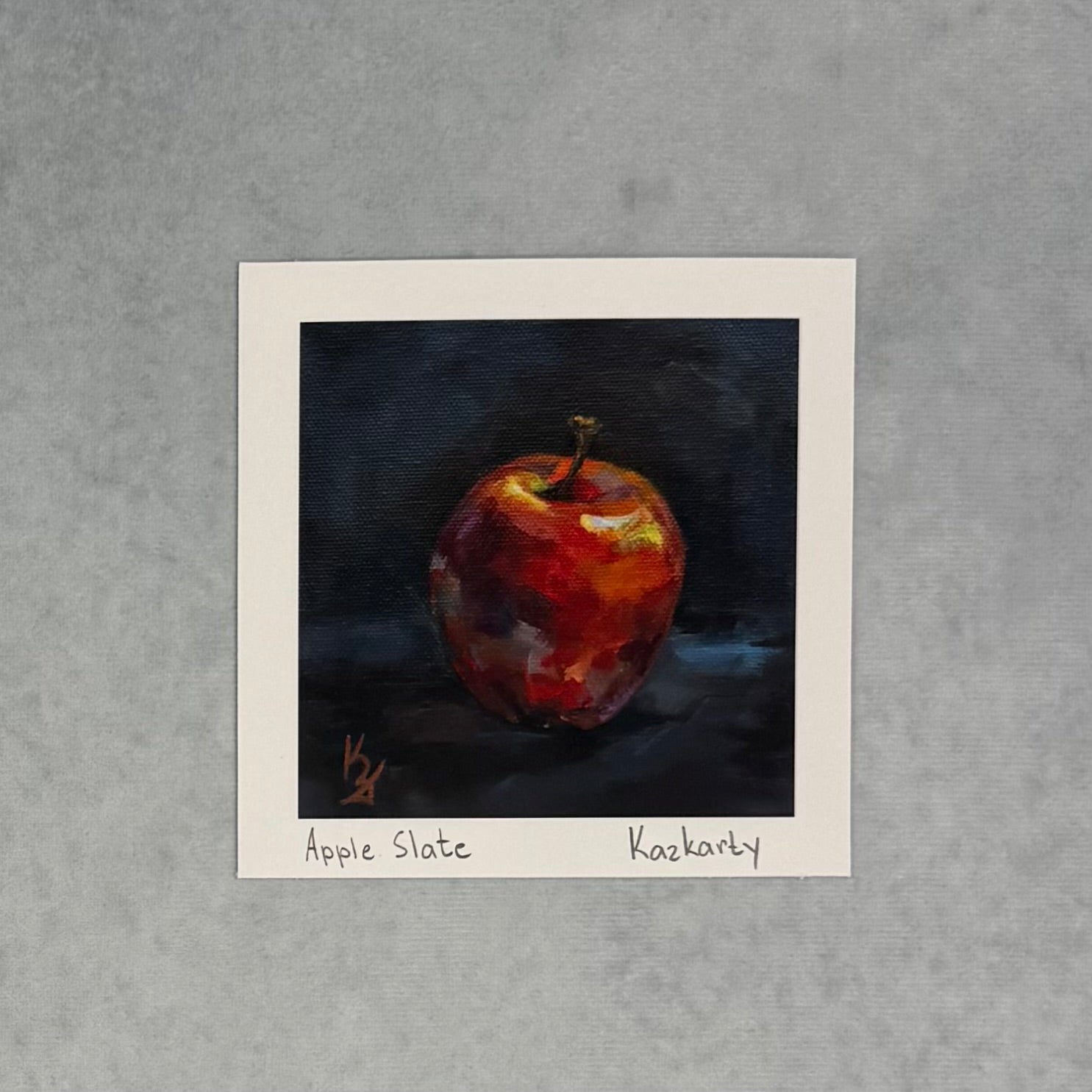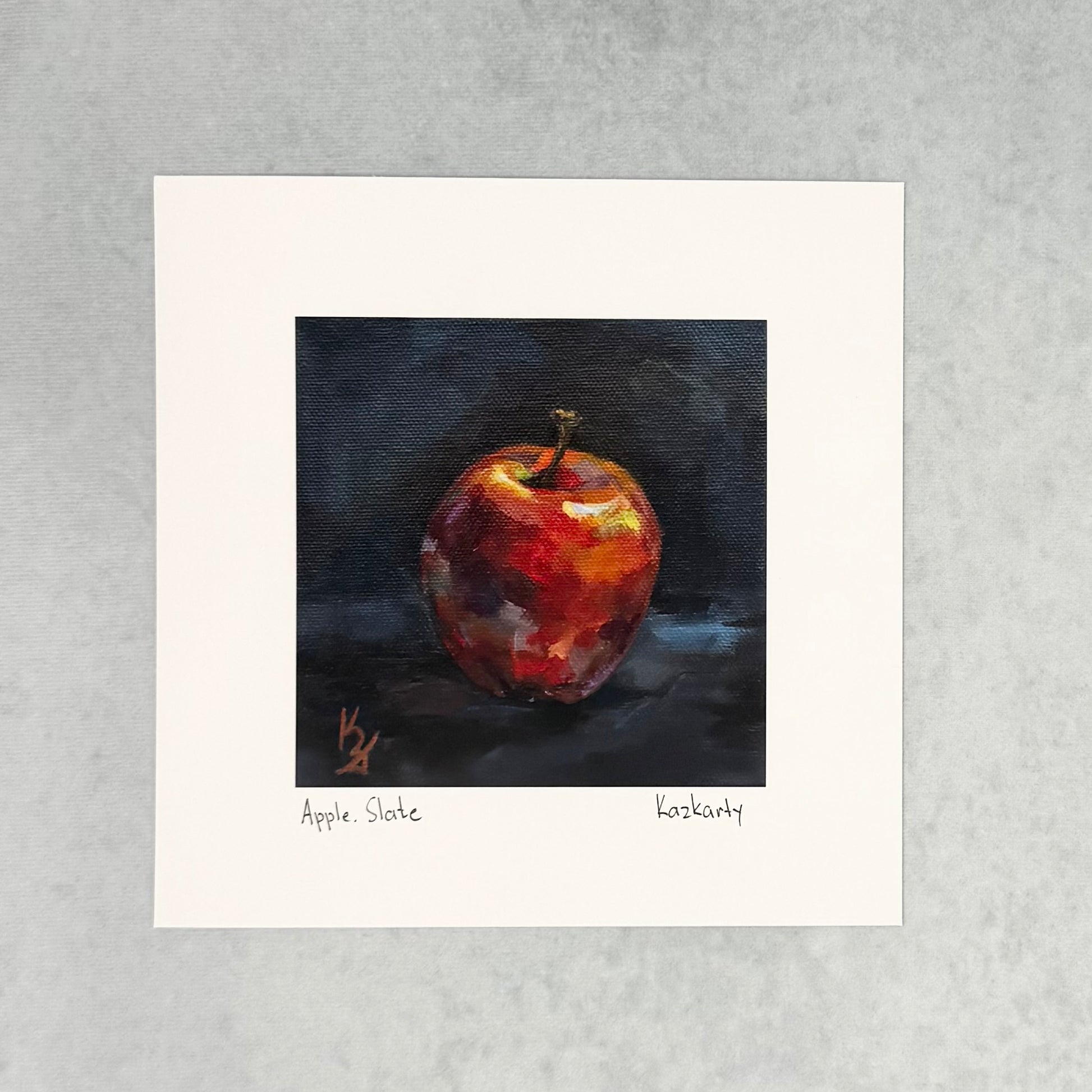 A vivid still life of a red apple set against a deep, dark background. The bold contrast enhances its freshness and form, creating a timeless and elegant piece of art.