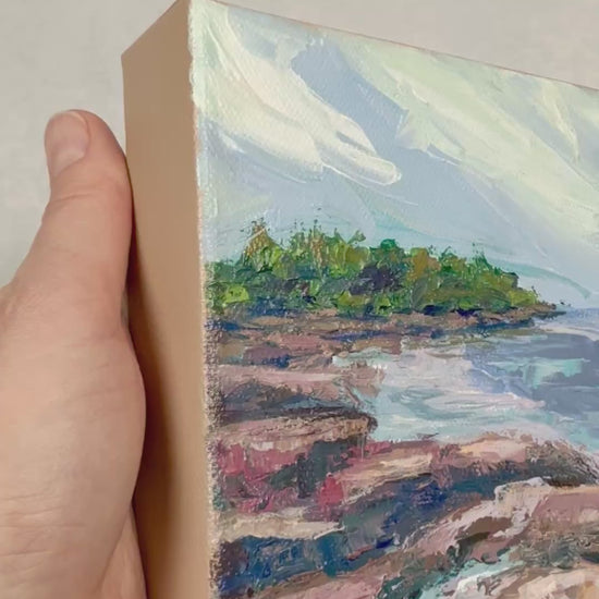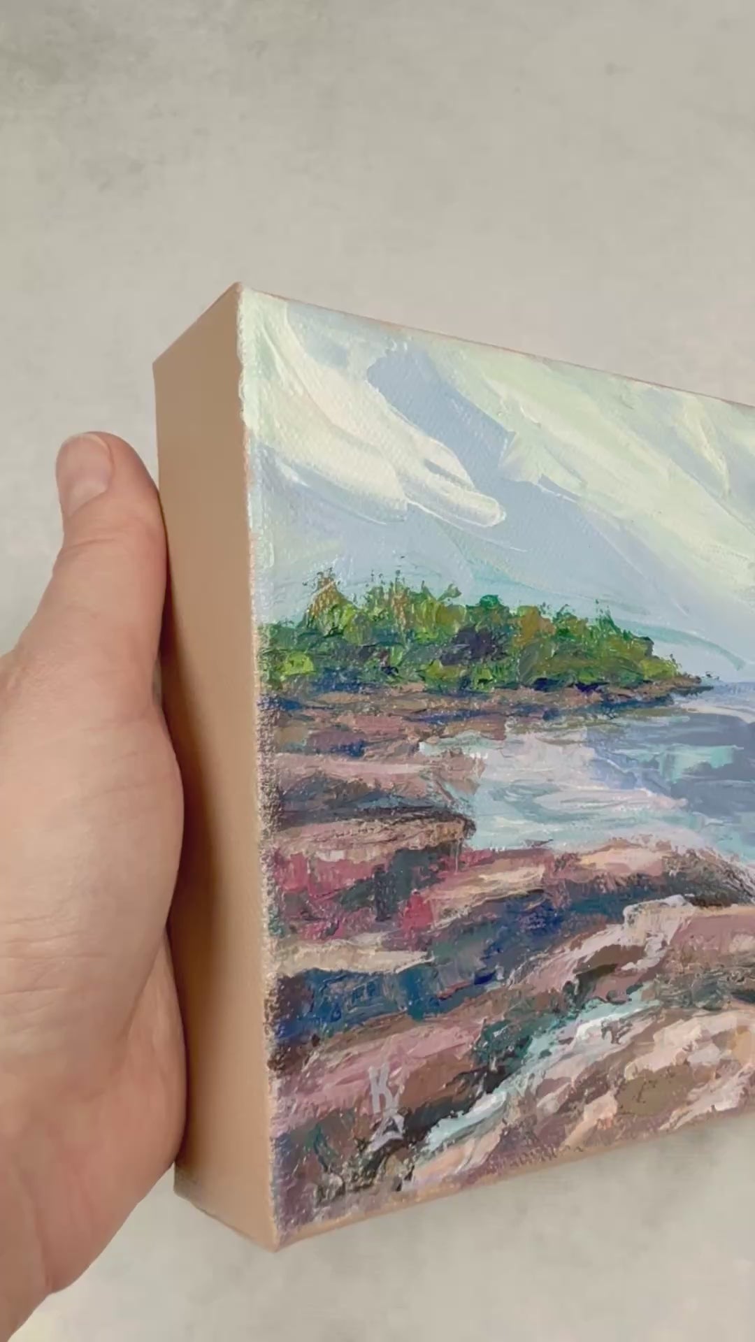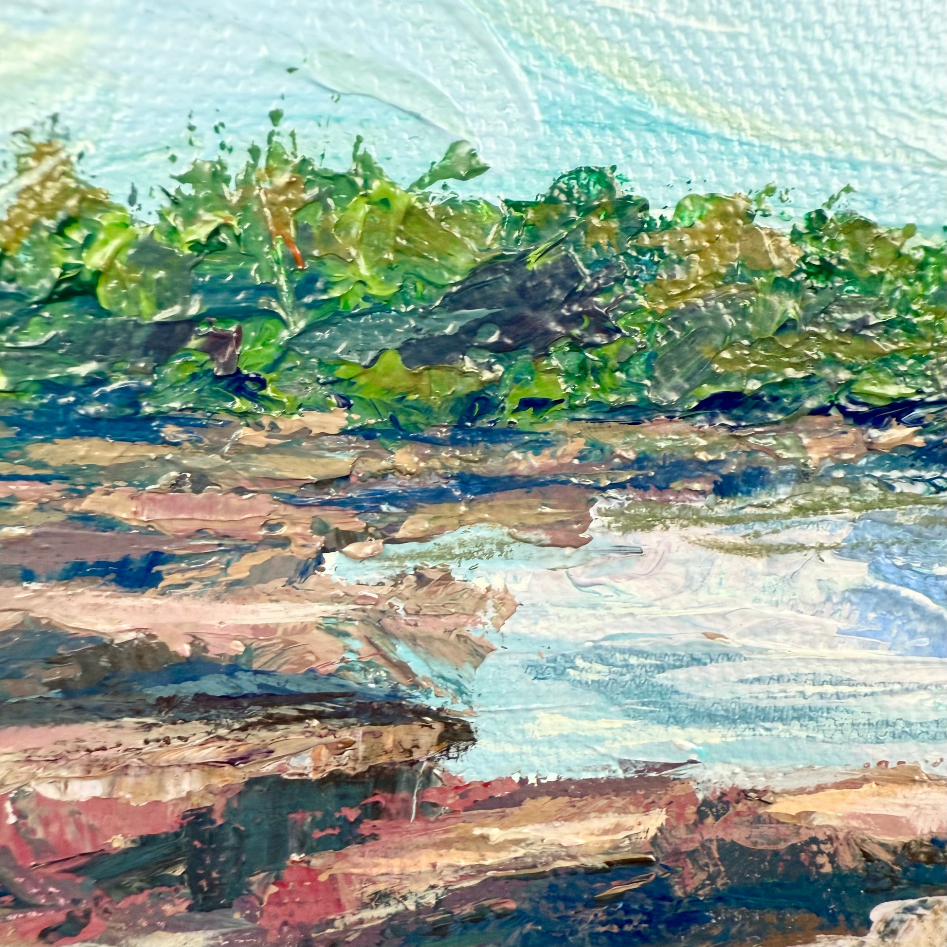 A quiet memory: walking among ancient deep rose stones, sun-warmed and holding silent pools of water. Tiny bellflowers. Distant water meeting the horizon. Bold palette-knife textures carrying strength, calm, and deep serenity.