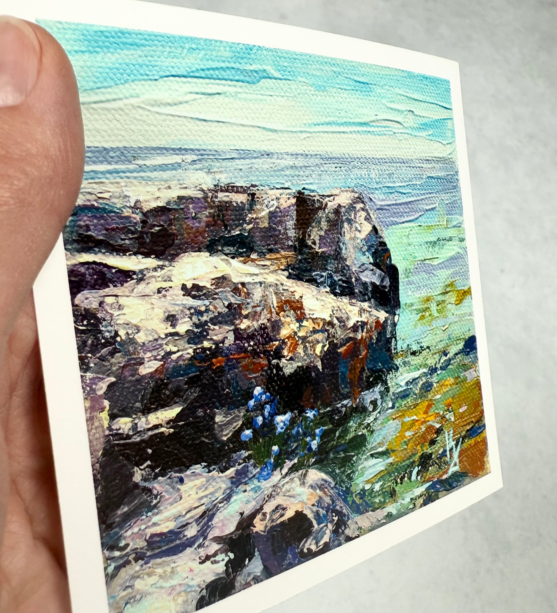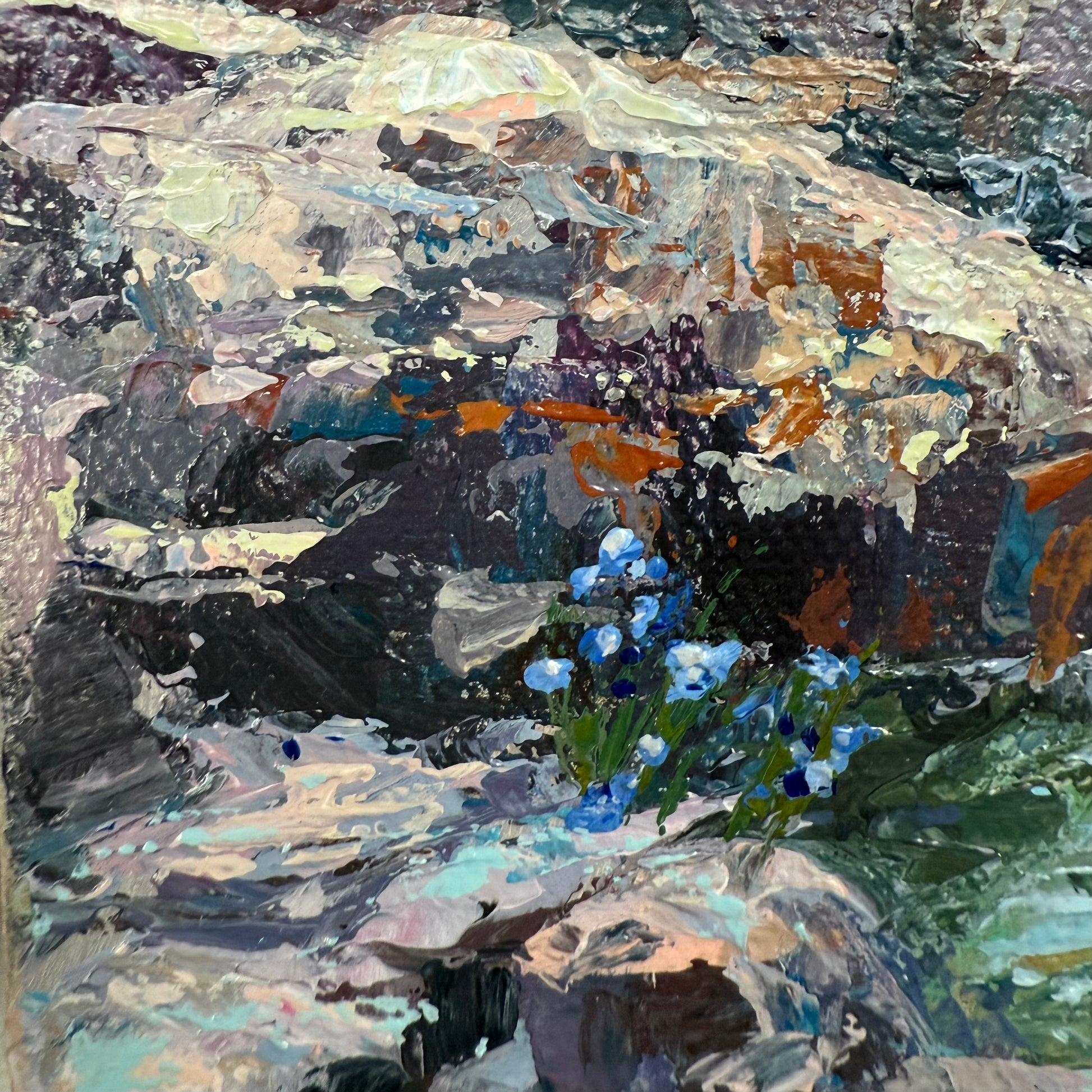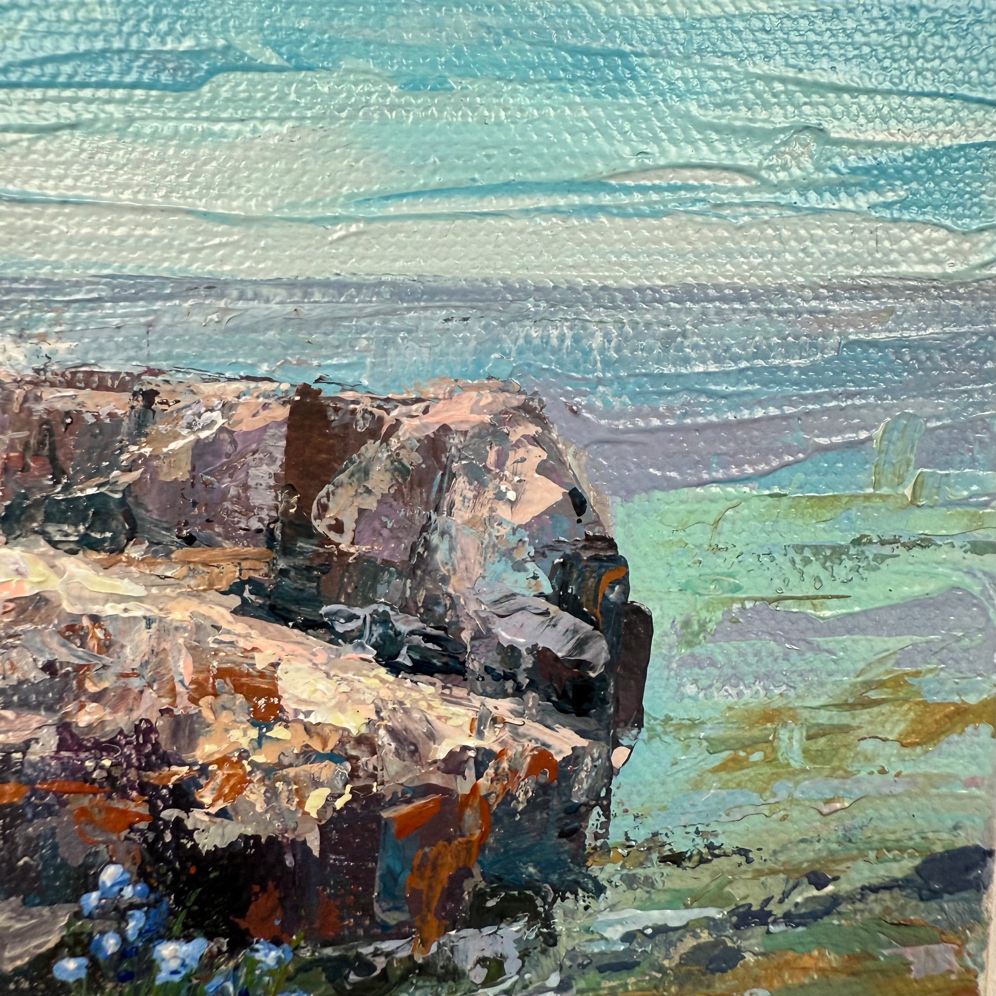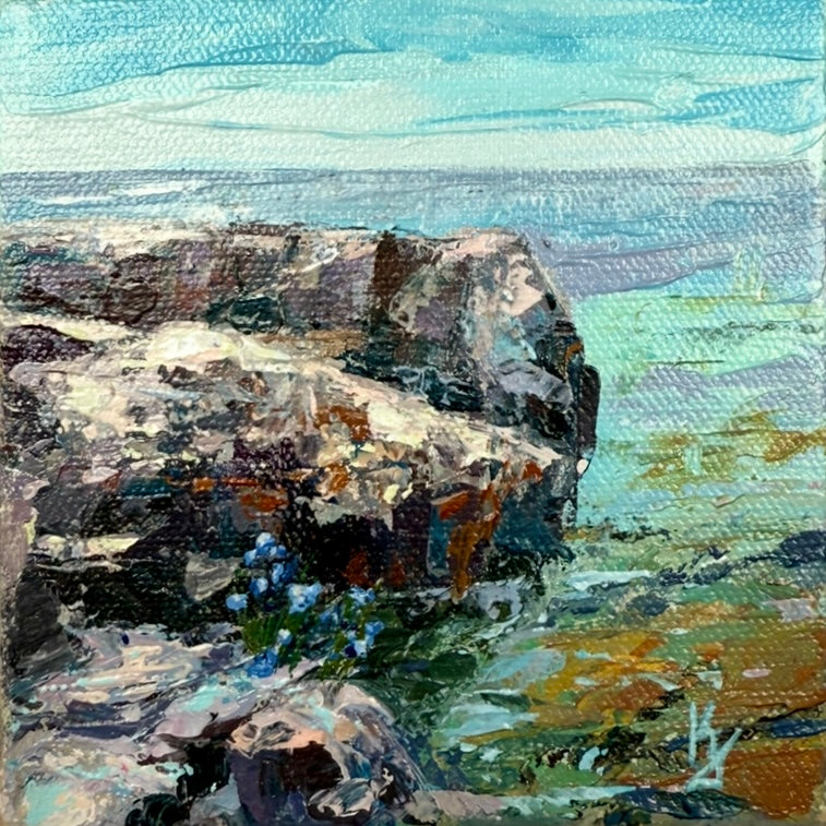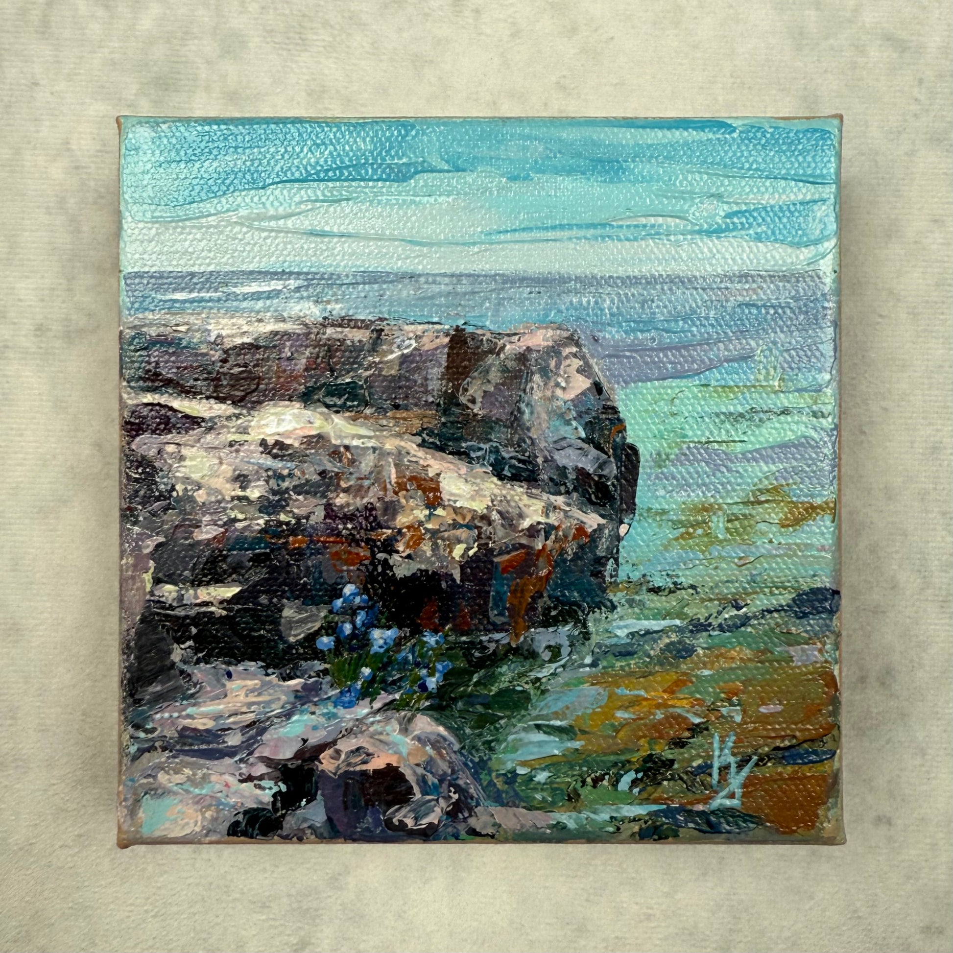 Tiny blue bellflowers bloom beside ancient stones, opening to endless water — a textured artwork alive with bright expression.