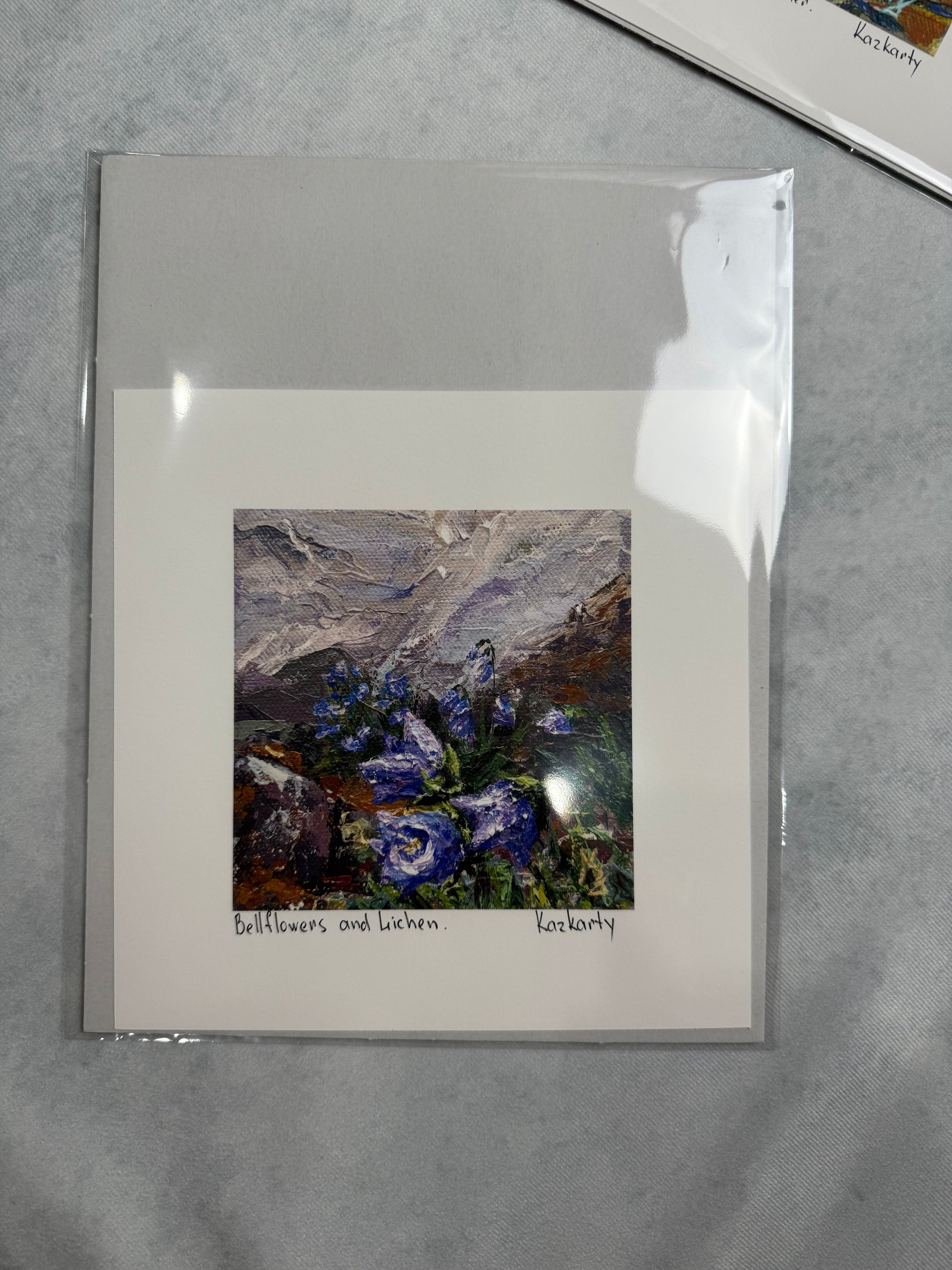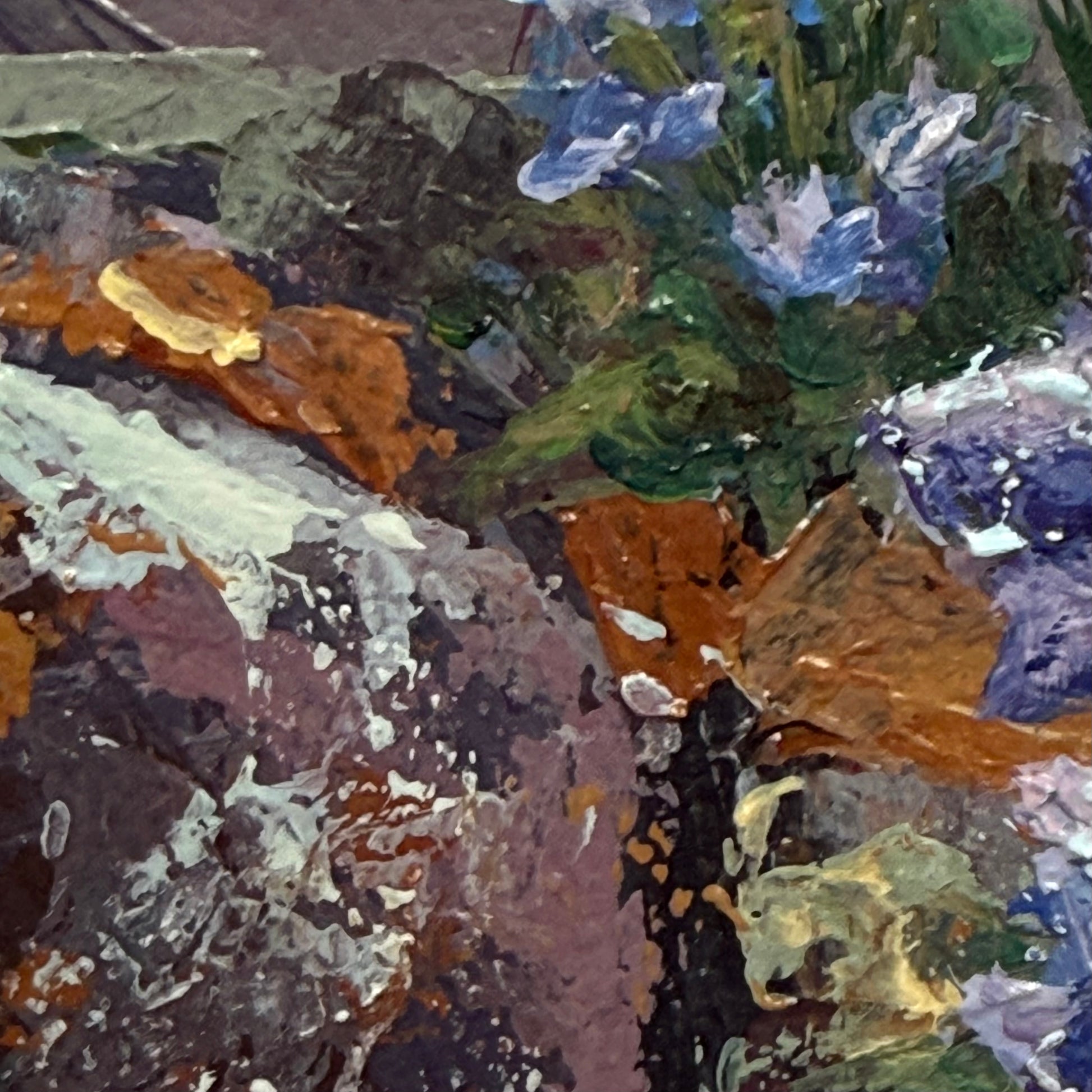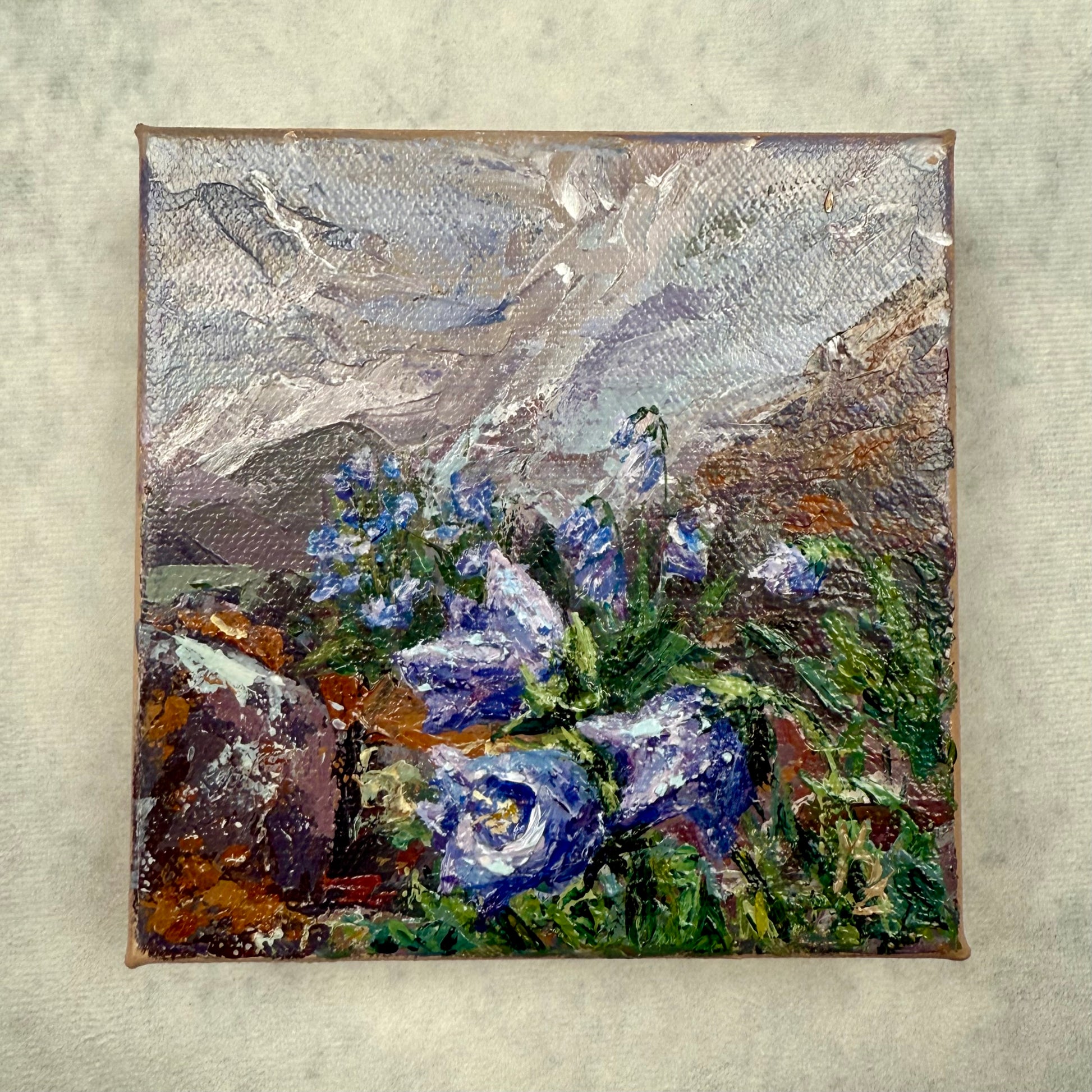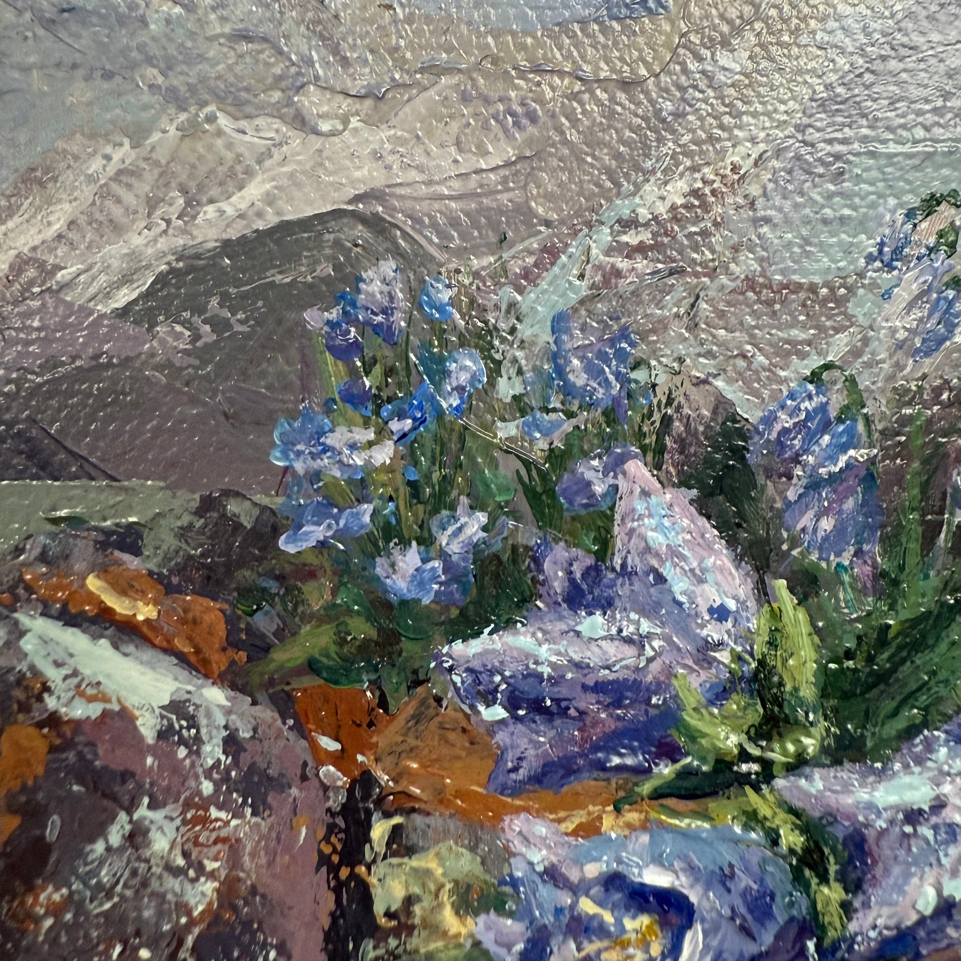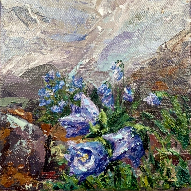 Bright bellflowers stand in gentle contrast to weathered, rusty stones softened by lichen. The textured strokes capture both fragility and strength — vibrant blooms and timeless earth.