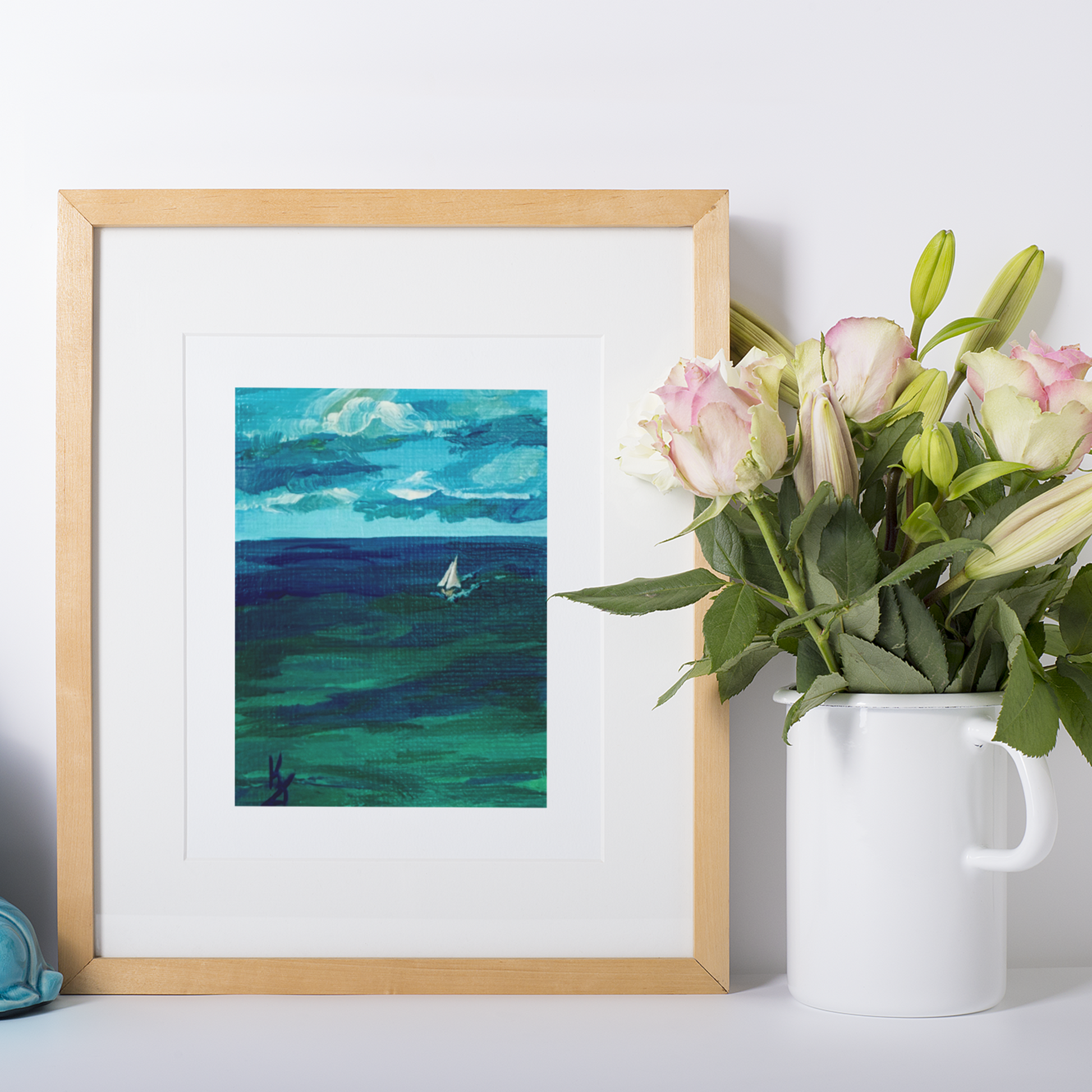 This artwork captures a sailboat running through tranquil, teal waters, beneath soft clouds casting their delicate shadows. Expressive brushstrokes and a satin varnish bring texture, depth. A calming, meditative seascape in miniature, signed and truly unique.