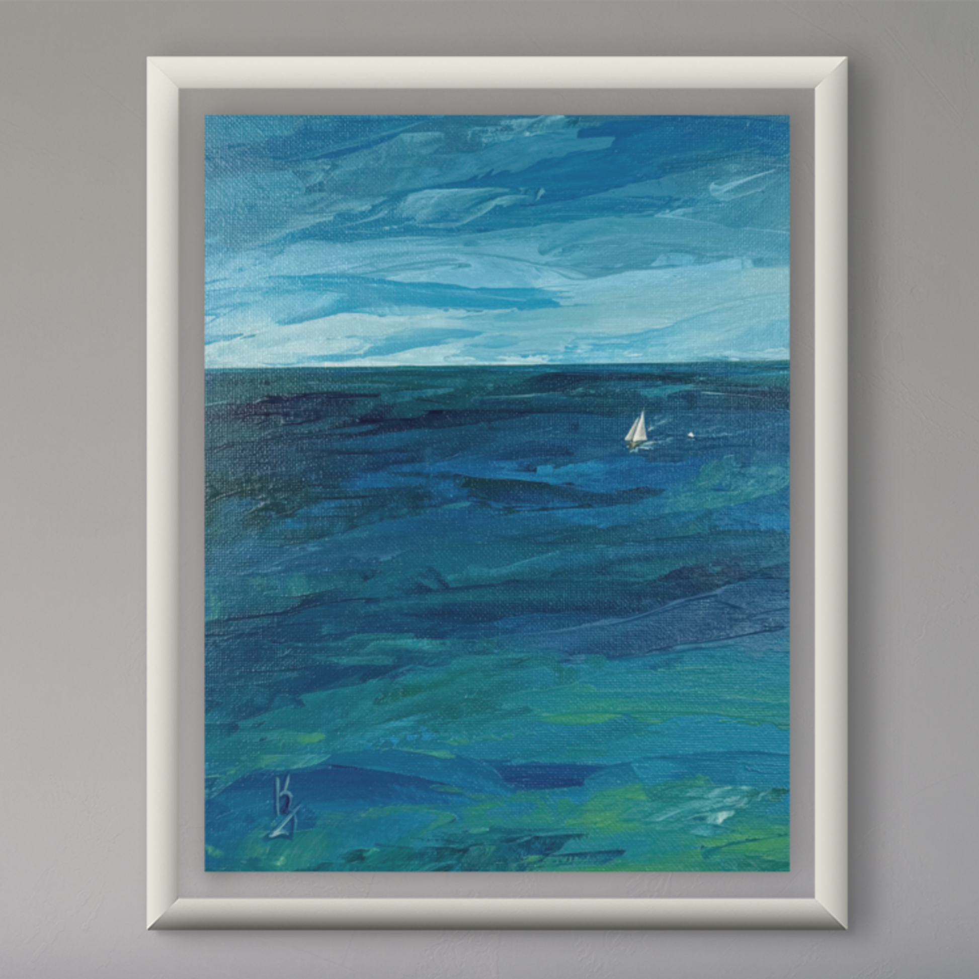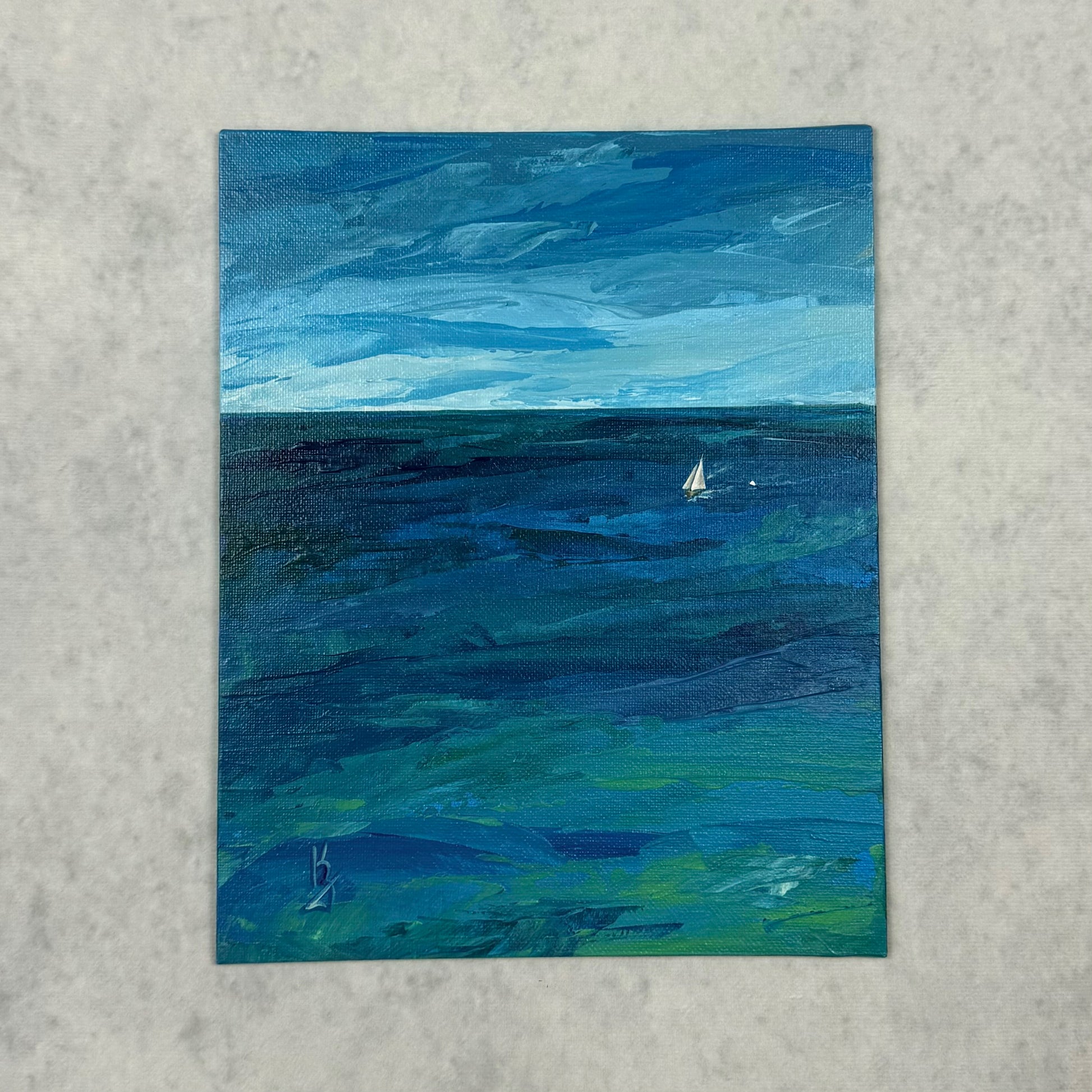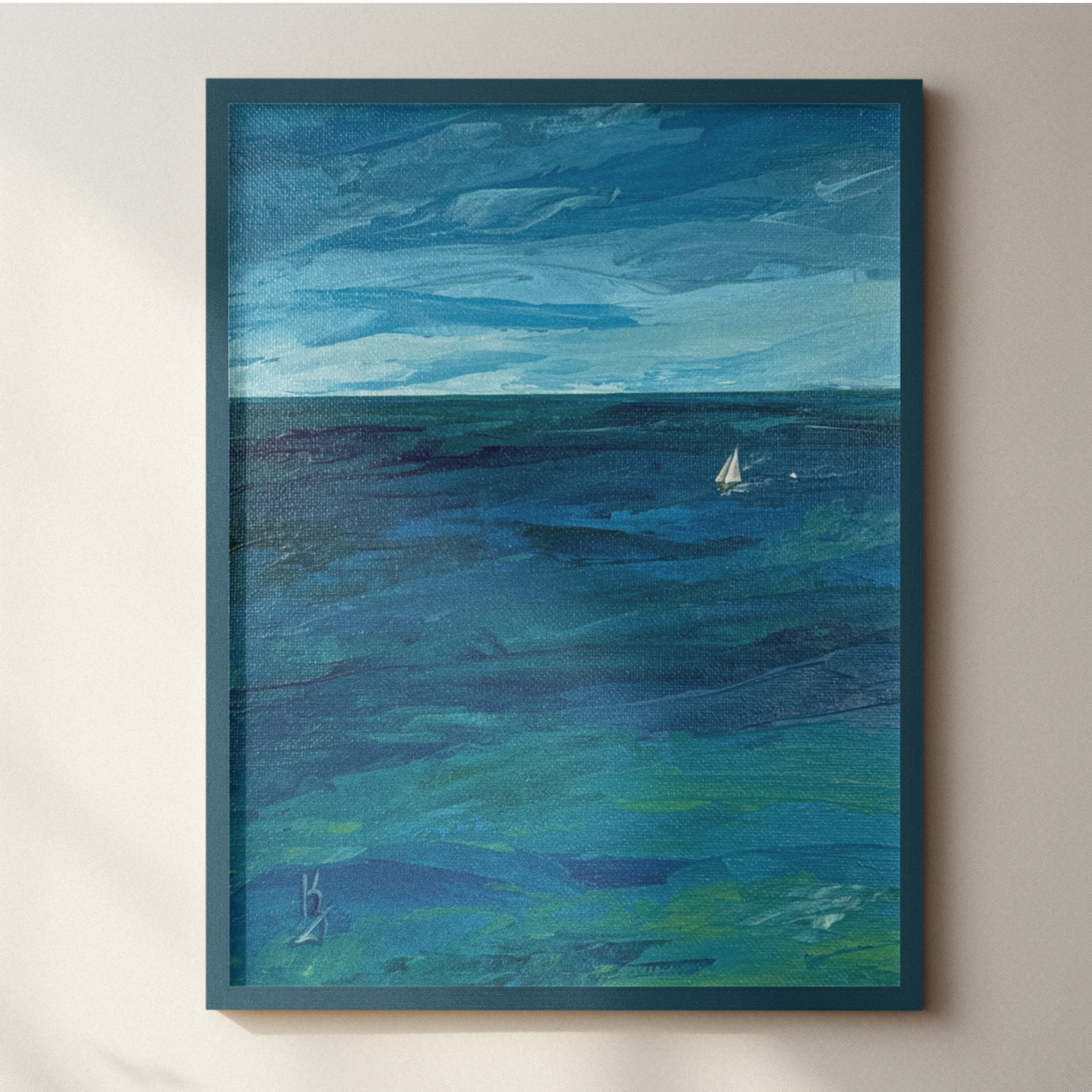 This seascape painting captures a sailboat gliding through tranquil teal waters beneath soft clouds casting delicate shadows.