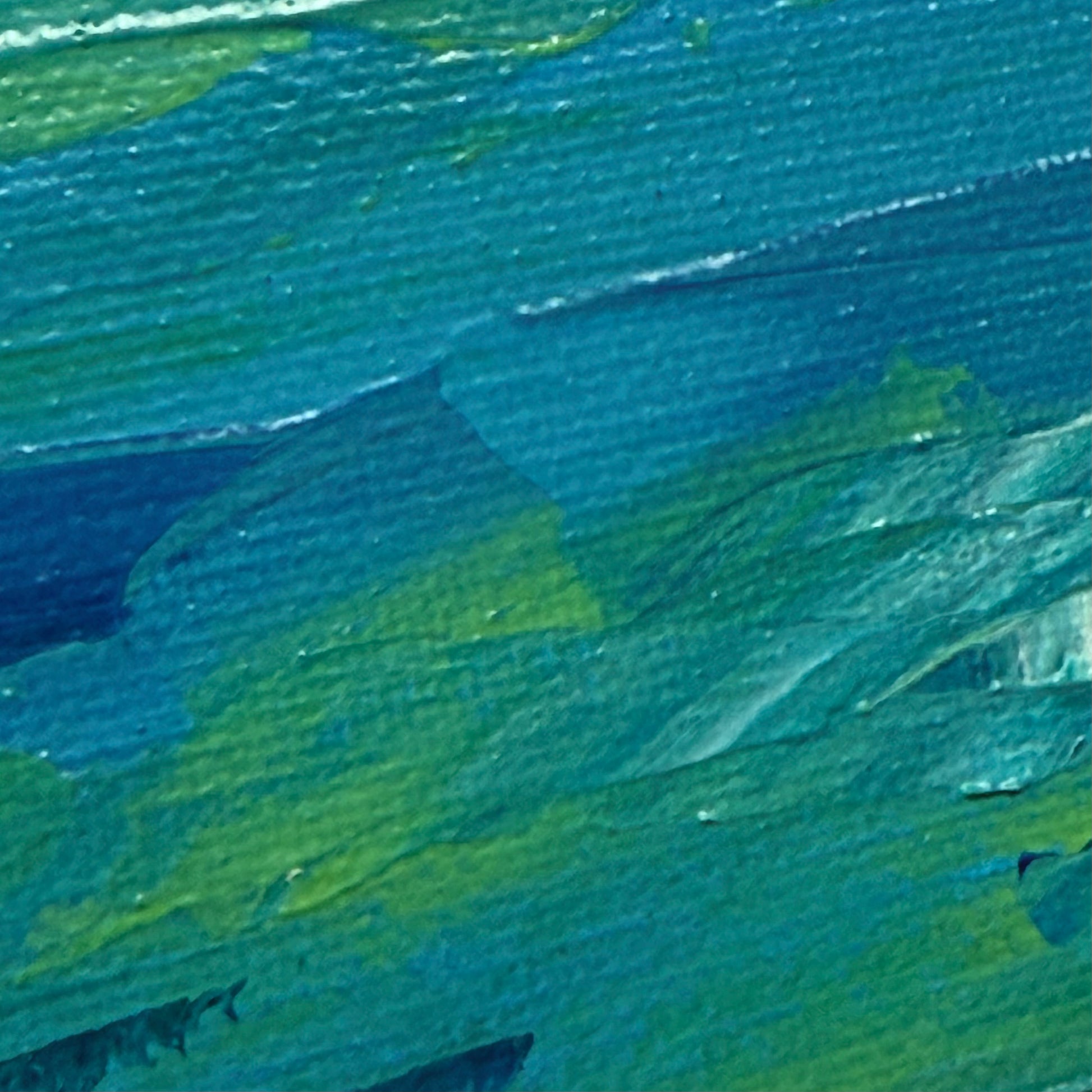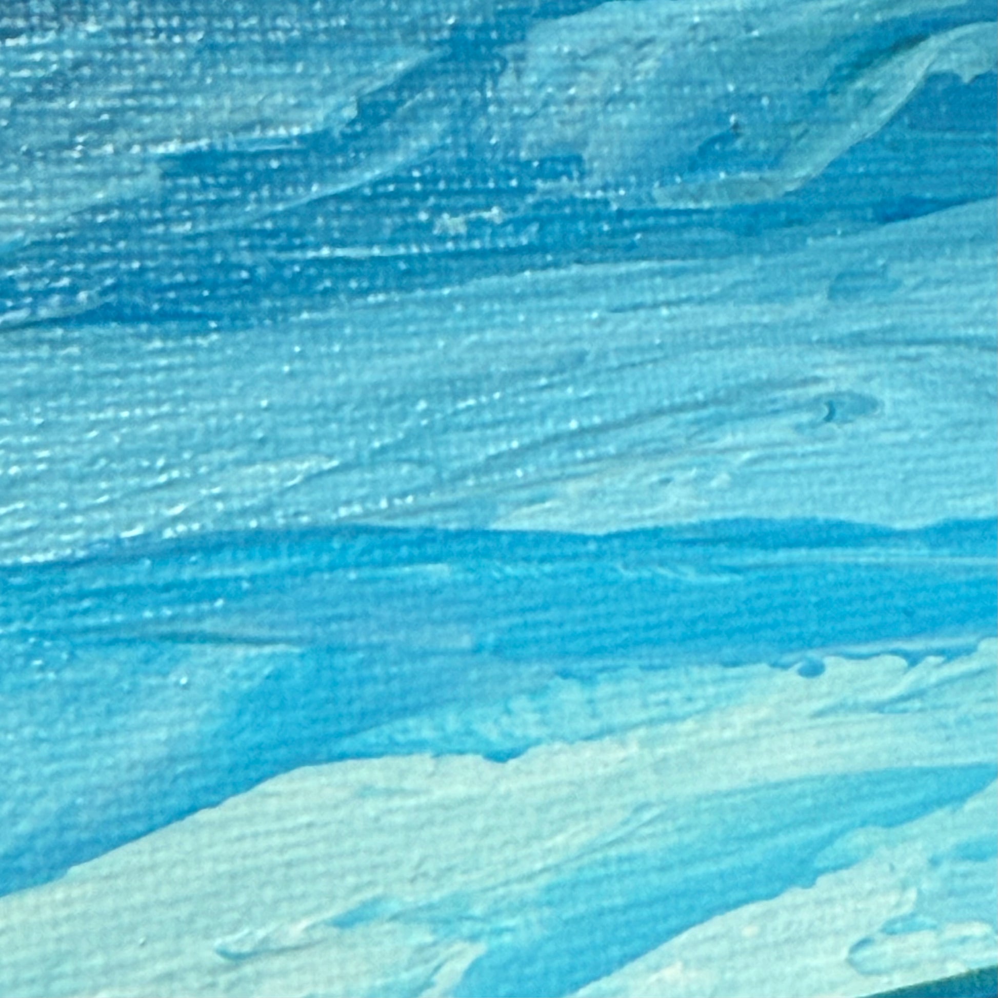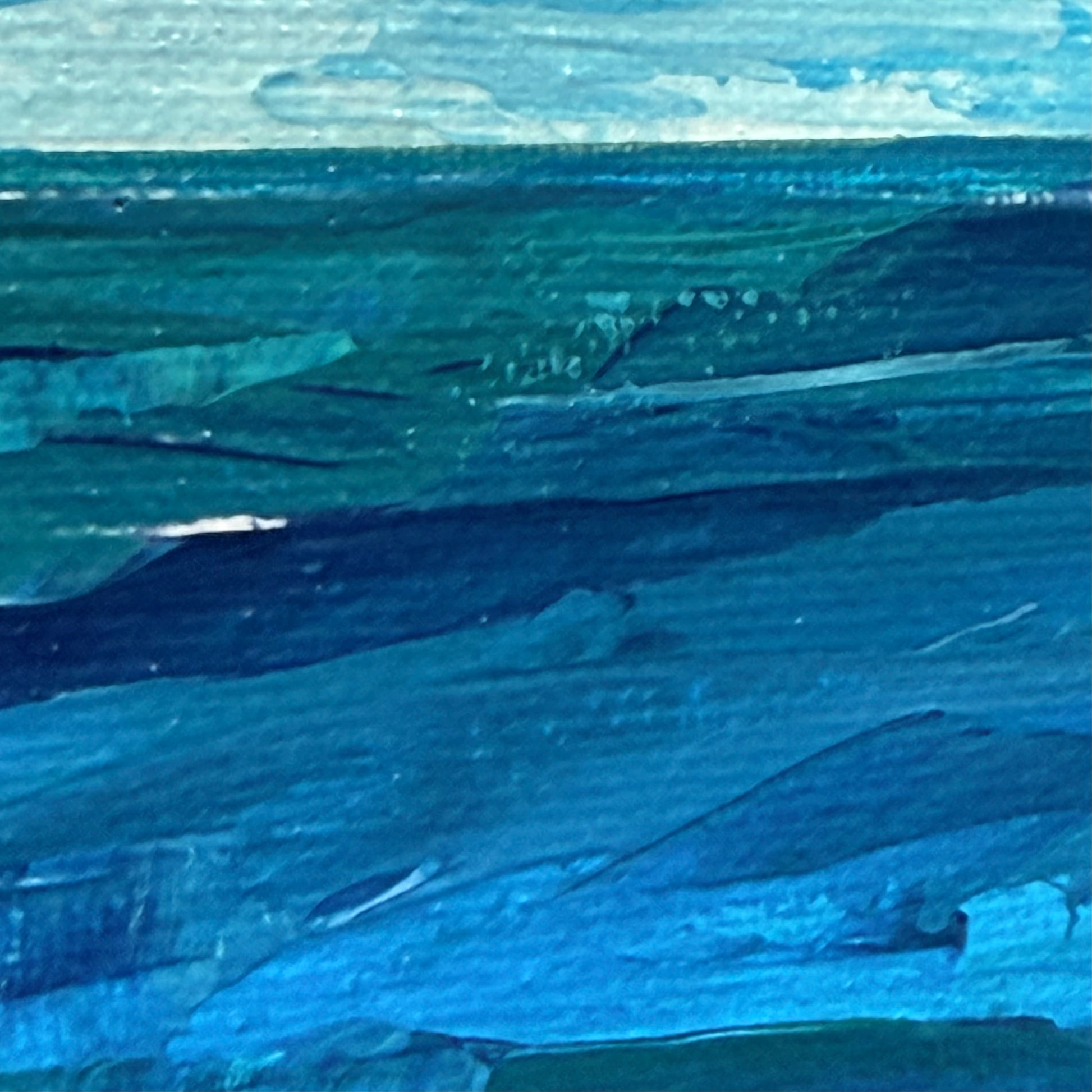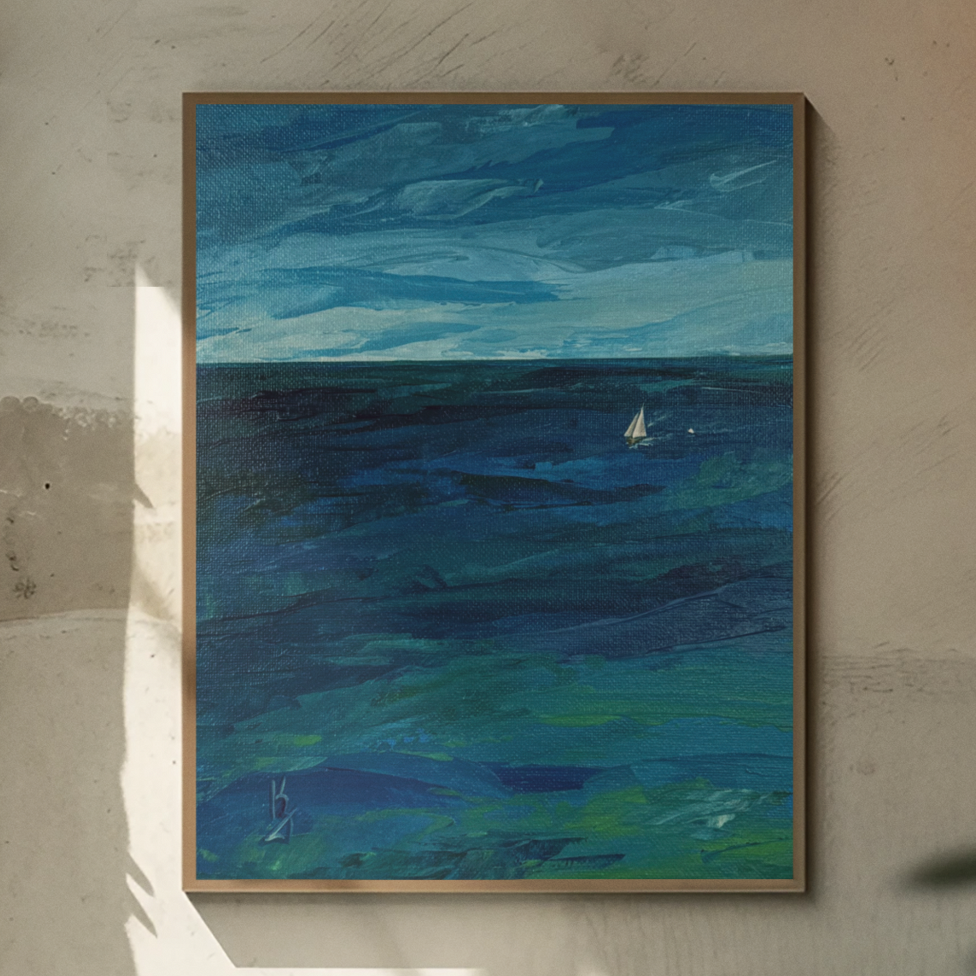 This seascape painting captures a sailboat gliding through tranquil teal waters beneath soft clouds casting delicate shadows.