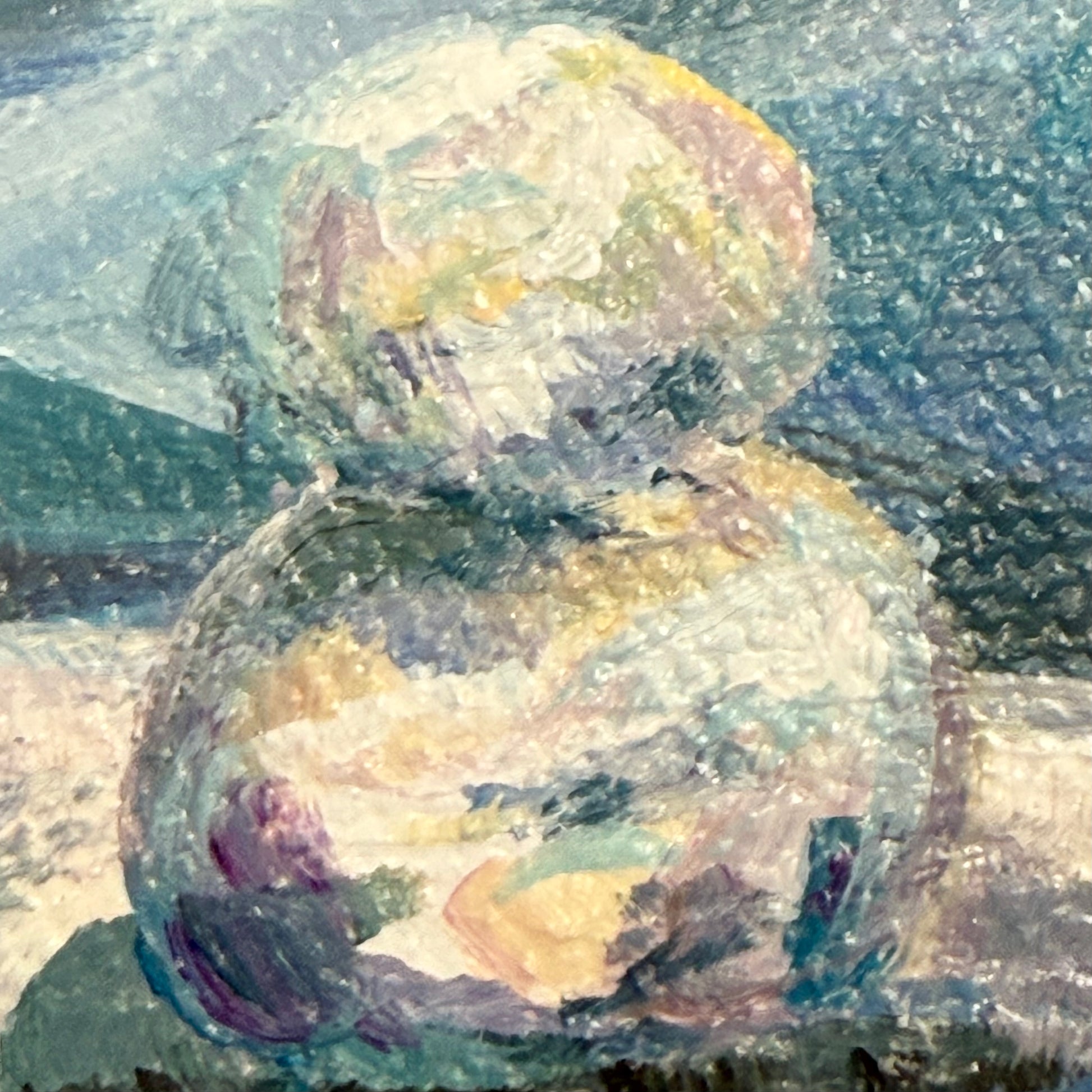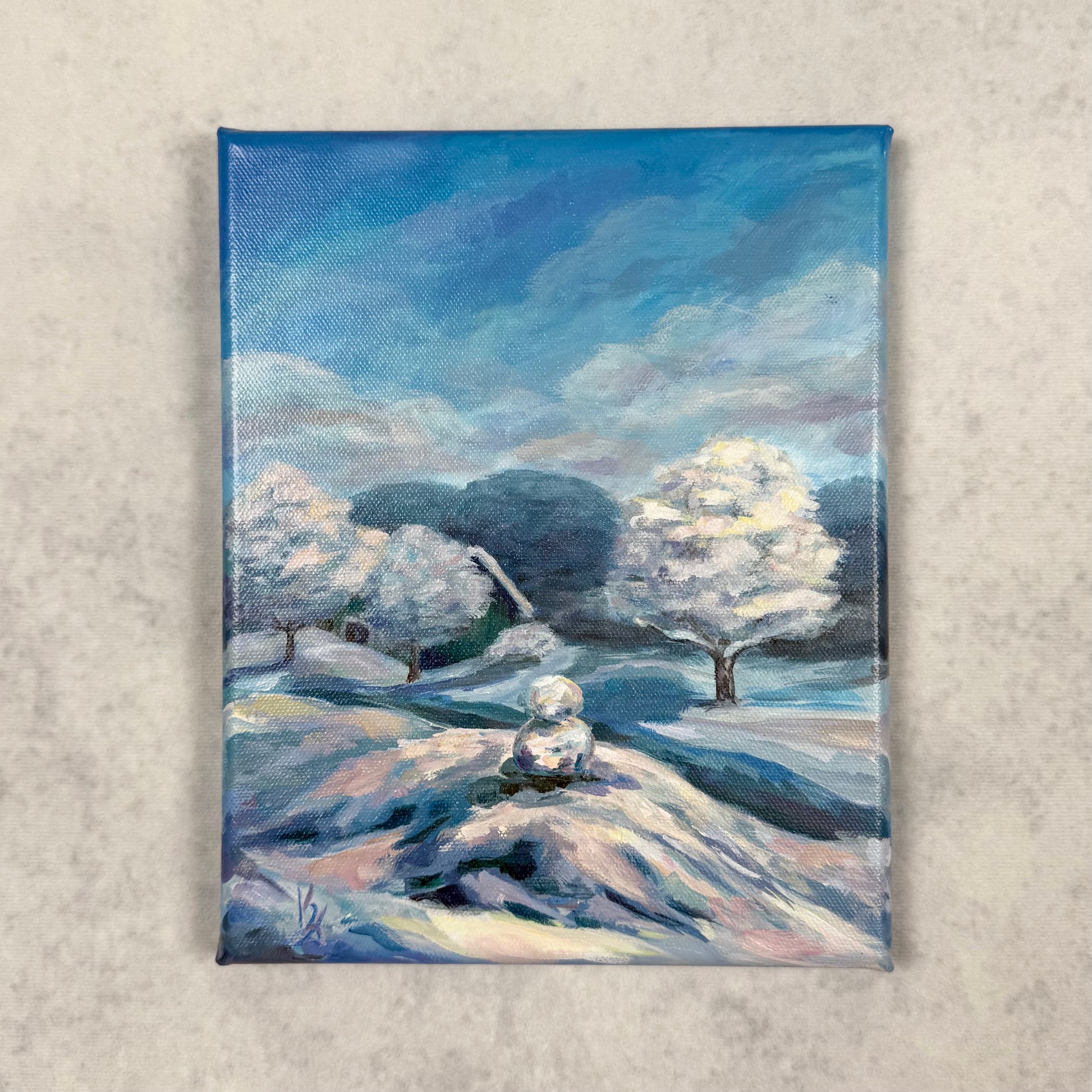 Original artwork featuring playful snowmen in the front yard, softening and melting in the gentle sunlight.