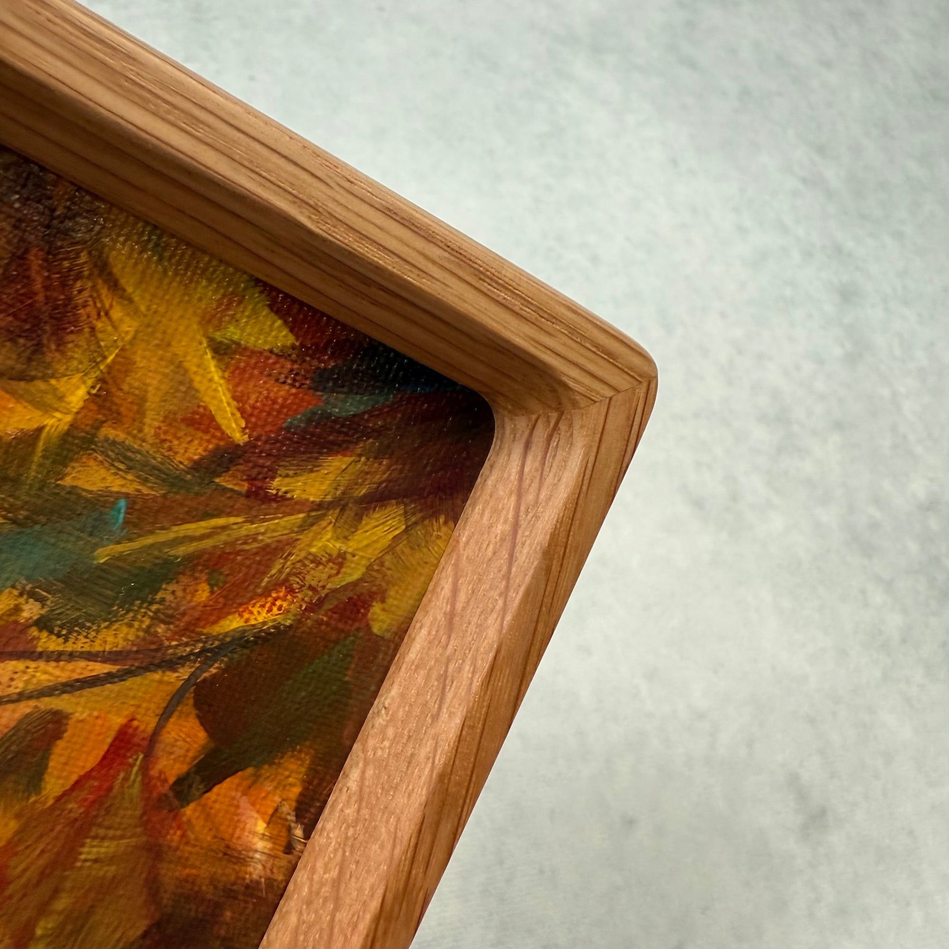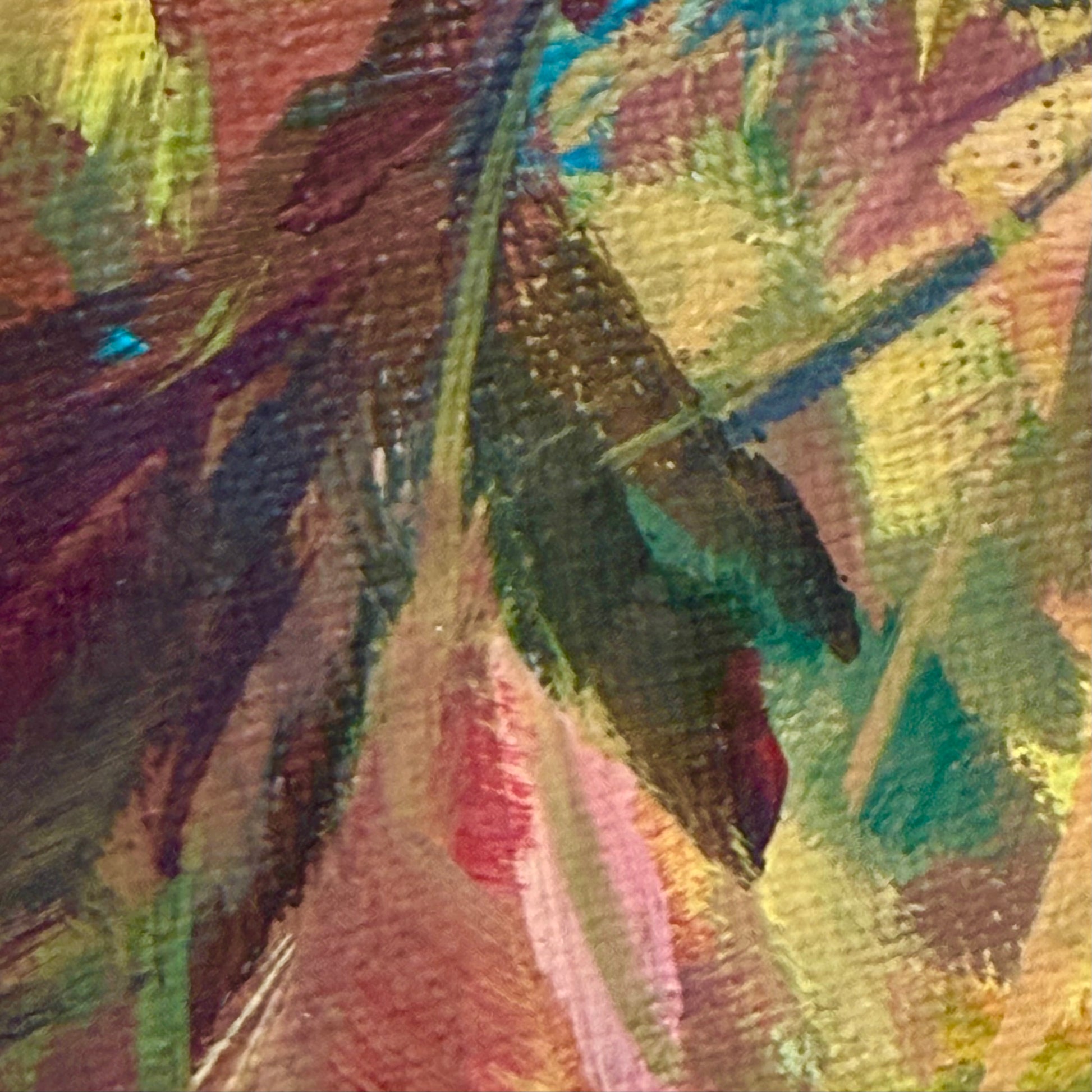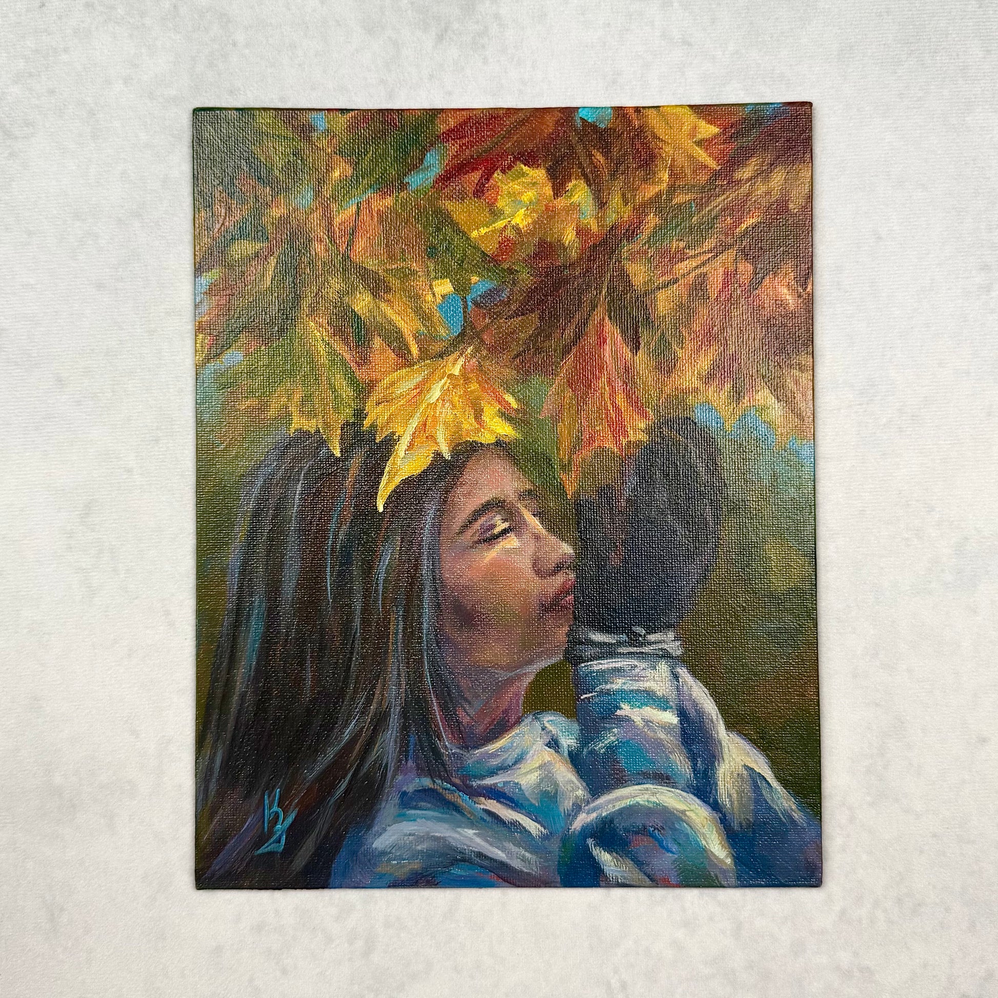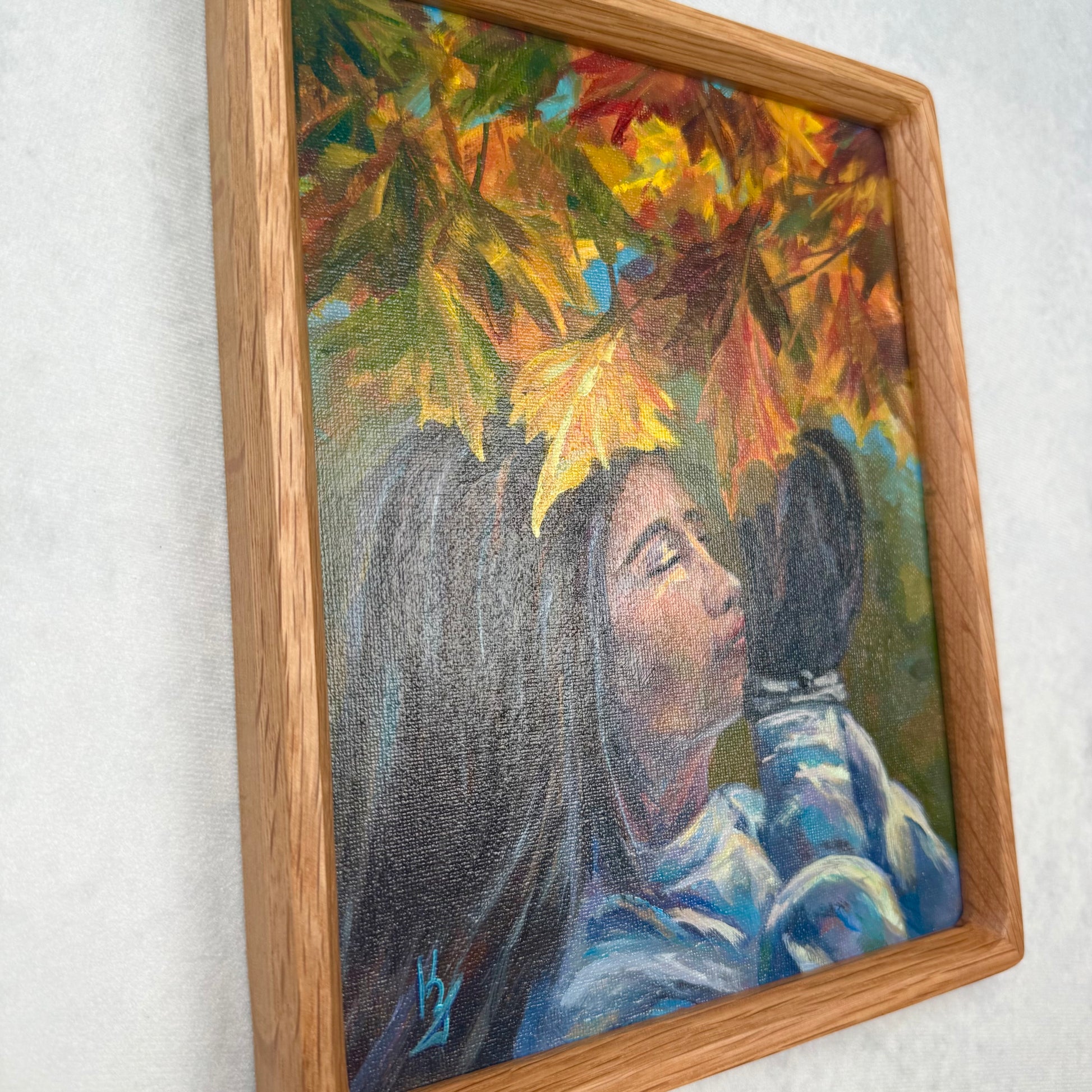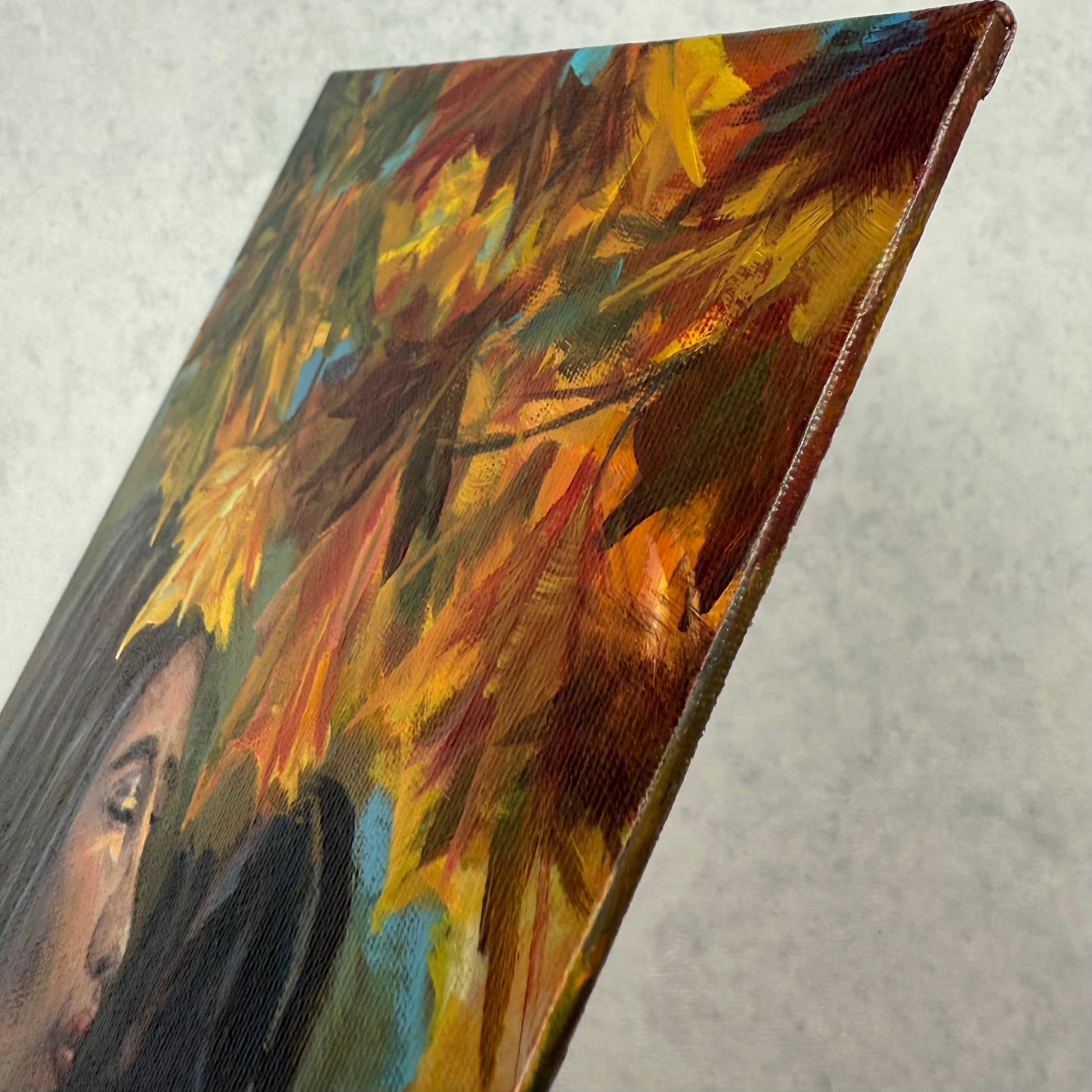 The smell of falling leaves dances through golden trees, wrapping the world in the gentle warmth of autumn. The sun softly touches the skin, filling the moment with quiet glow. Textured palette knife strokes and glowing amber tones meet contrasts of blue, red, yellow, and orange, enriched with earthy green and ocher.