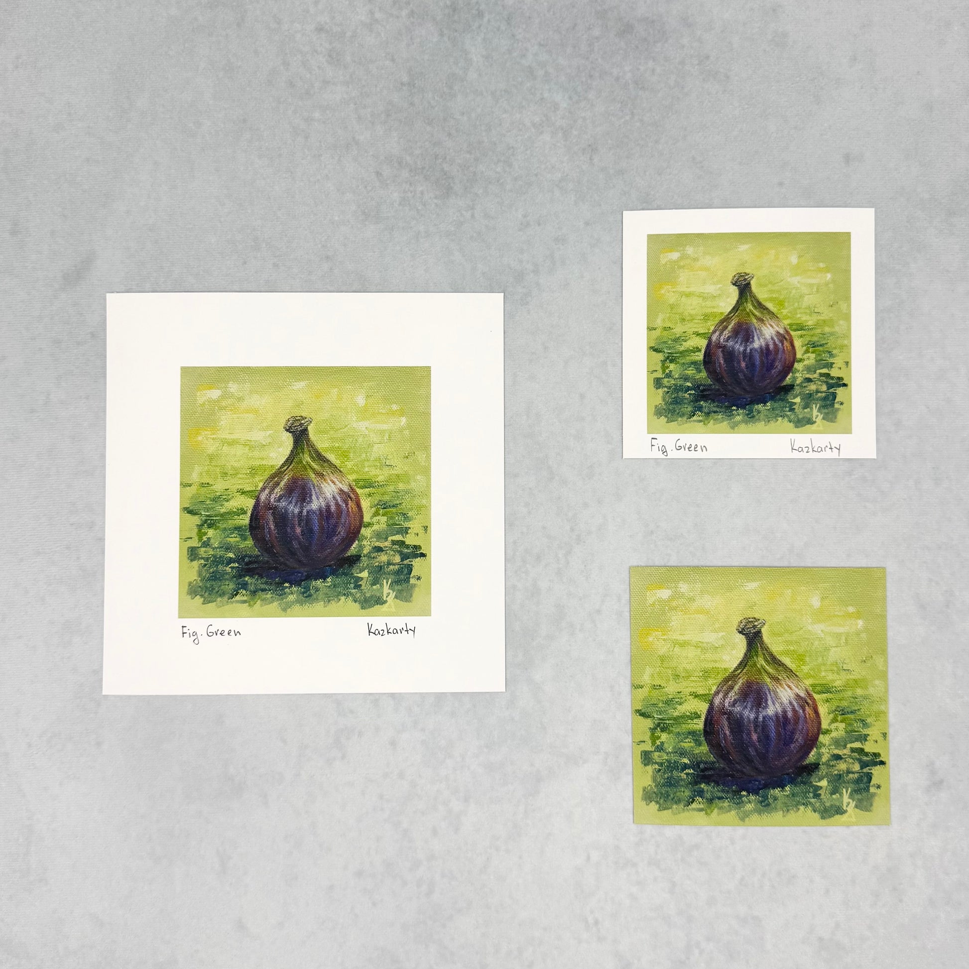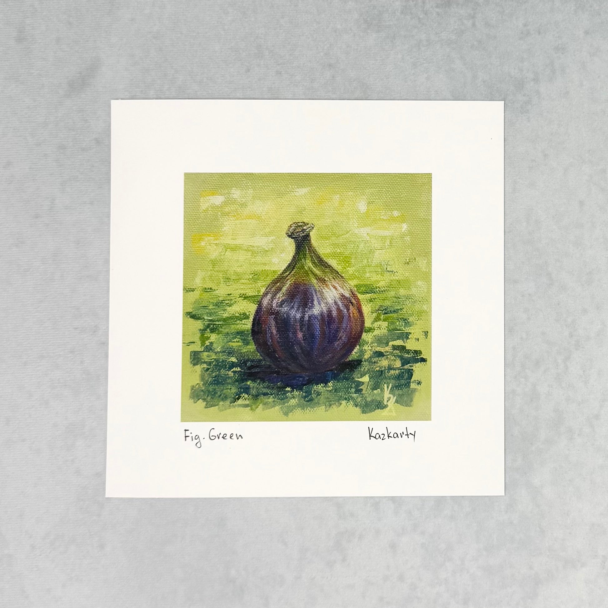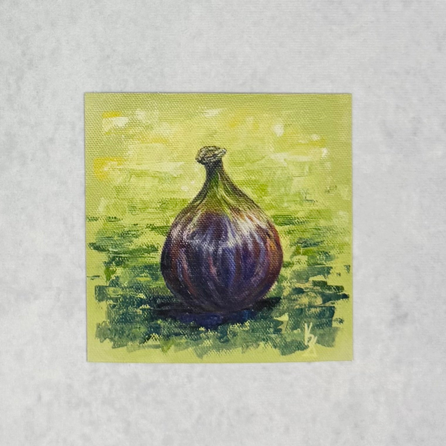 A single violet fig stands in elegant contrast against an olive green backdrop. A fresh and modern still life painting.