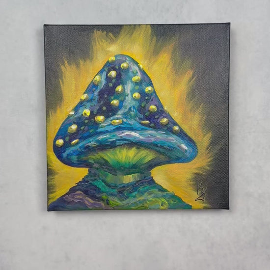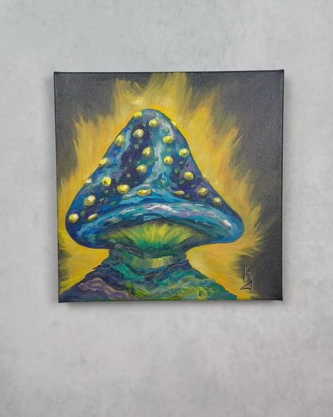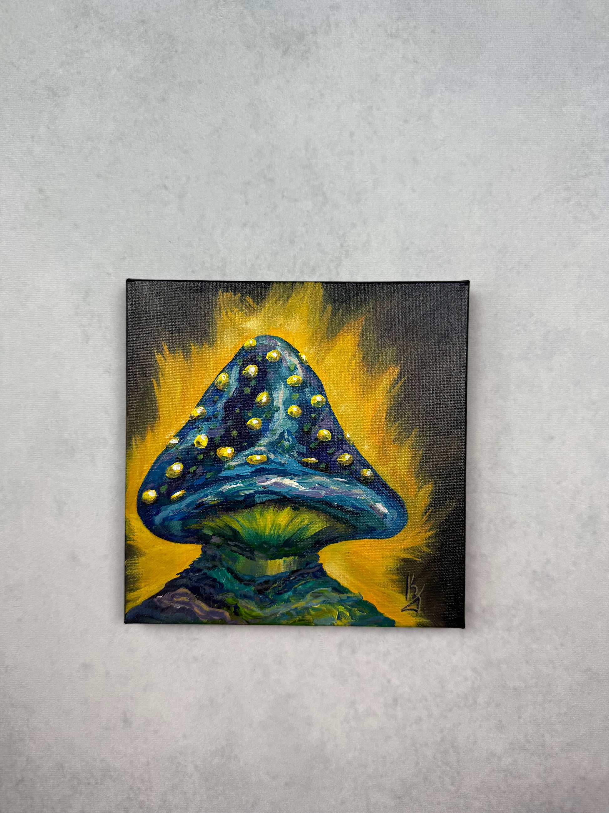 Neon blue and yellow mushrooms glow with surreal energy — a bold, imaginative fusion of nature and light.