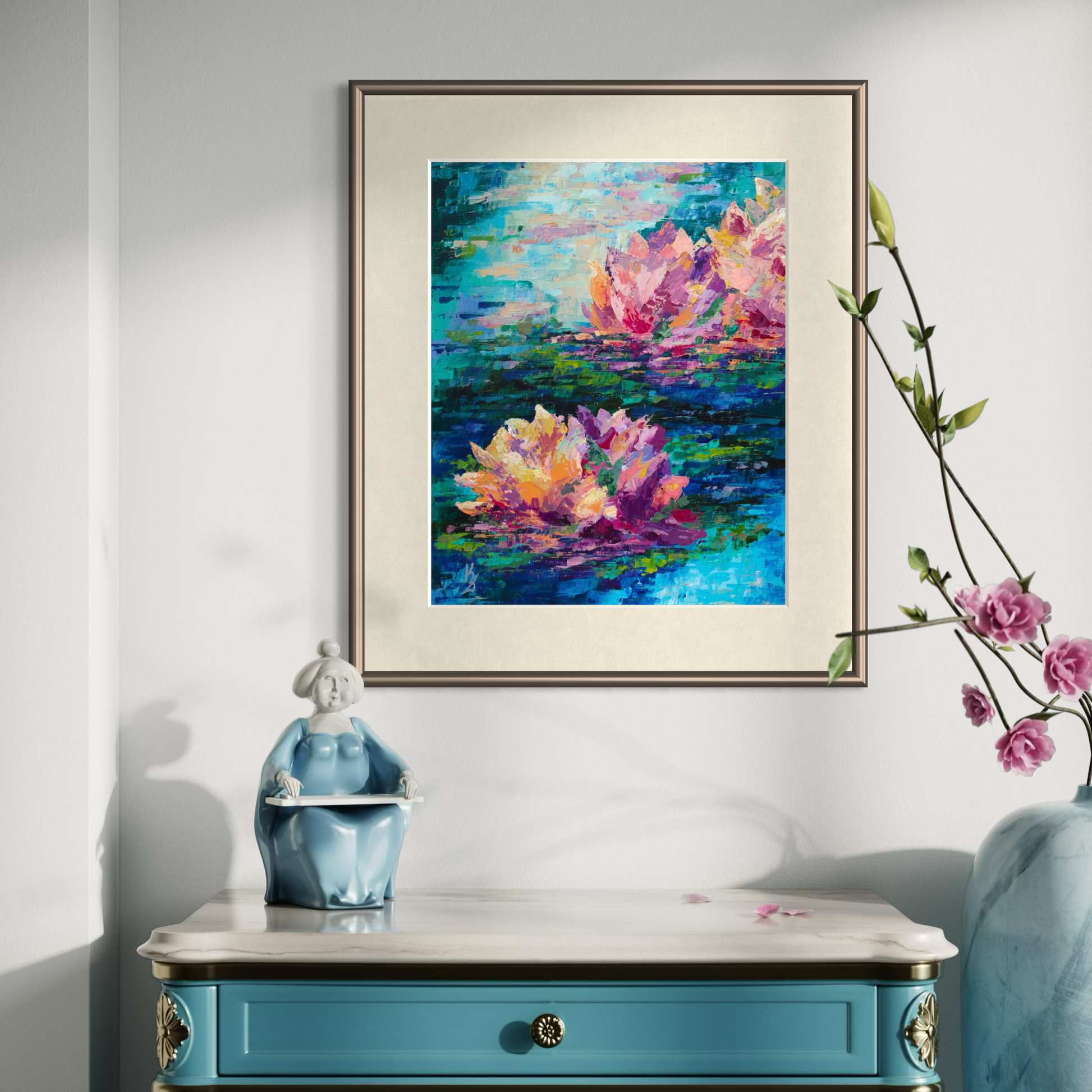 This art captures the exhilarating August feeling of gliding through graceful lilies — where colors, scents, joy, and beauty come together all at once. The happiness of summer is carried in every textured, expressive brush stroke, painted with emotion and sunlight. Pure peace and uplifting energy.