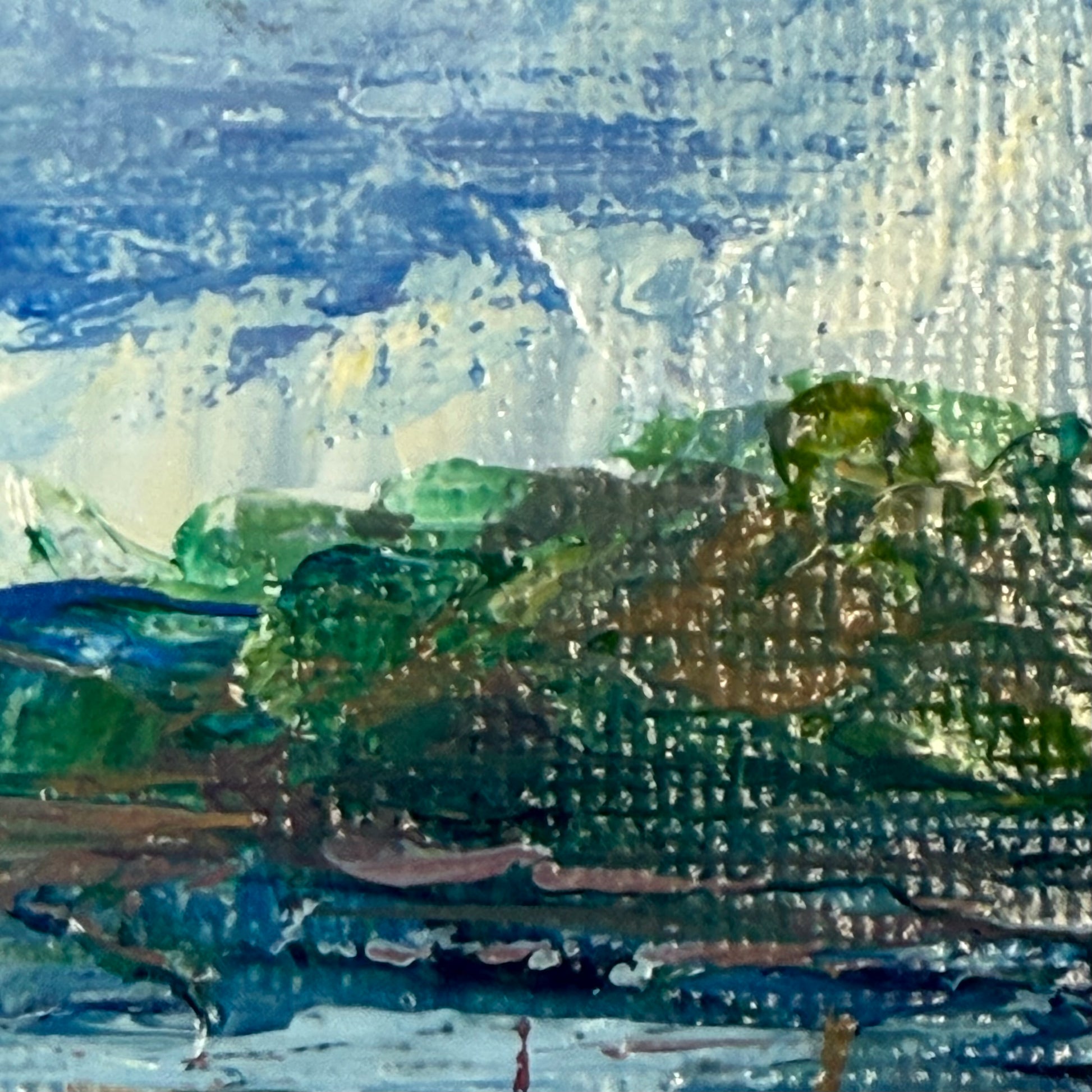 A serene, textured painting capturing a bright blue lake beneath a crisp morning fall sky. Expressive brush strokes add depth and rhythm to the scene — shimmering water, graceful pine trees, and soft weaving grasses glowing in golden and purple hues beside a peaceful walkway, evoking calm and quiet reflection.