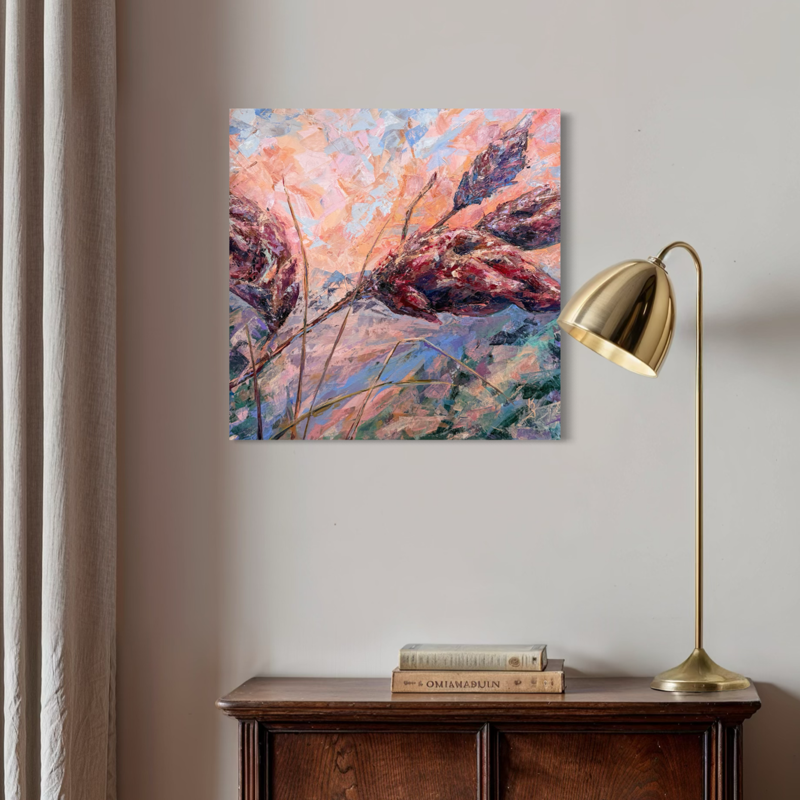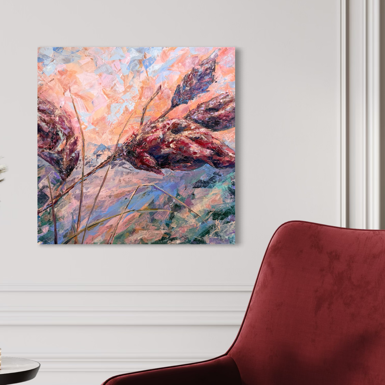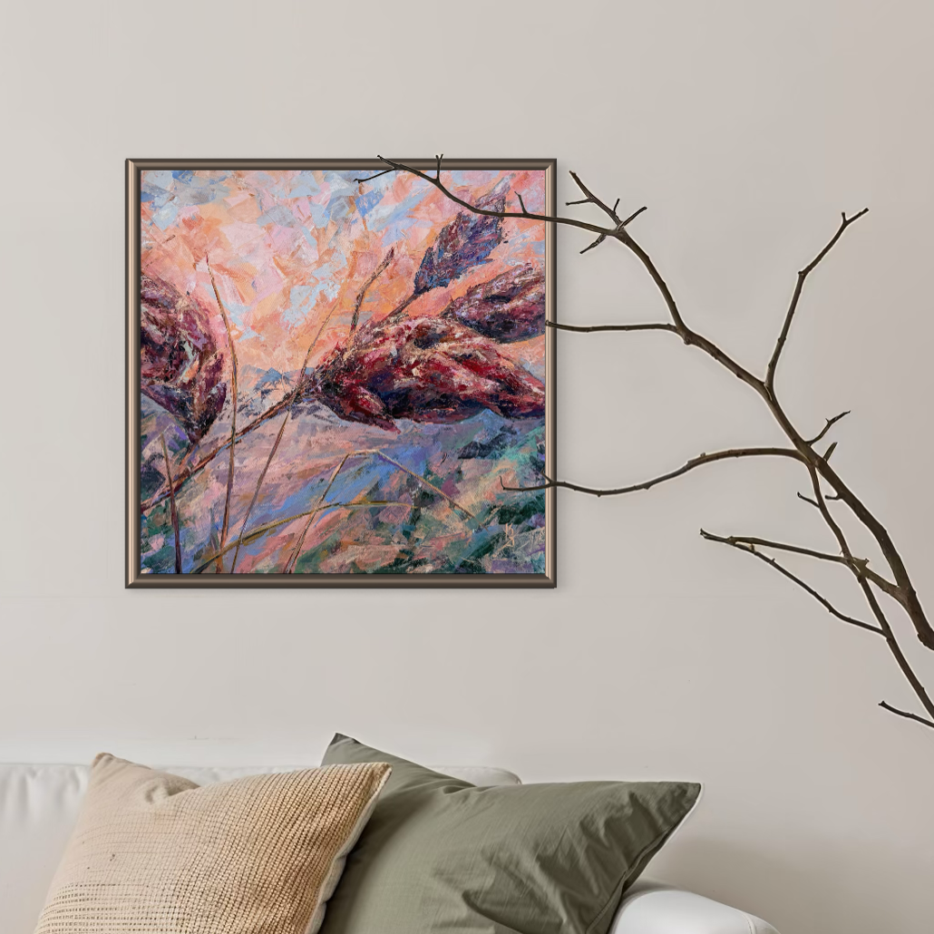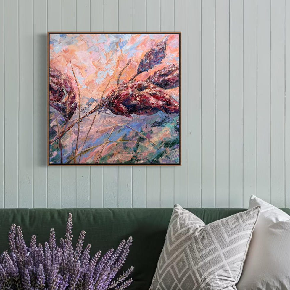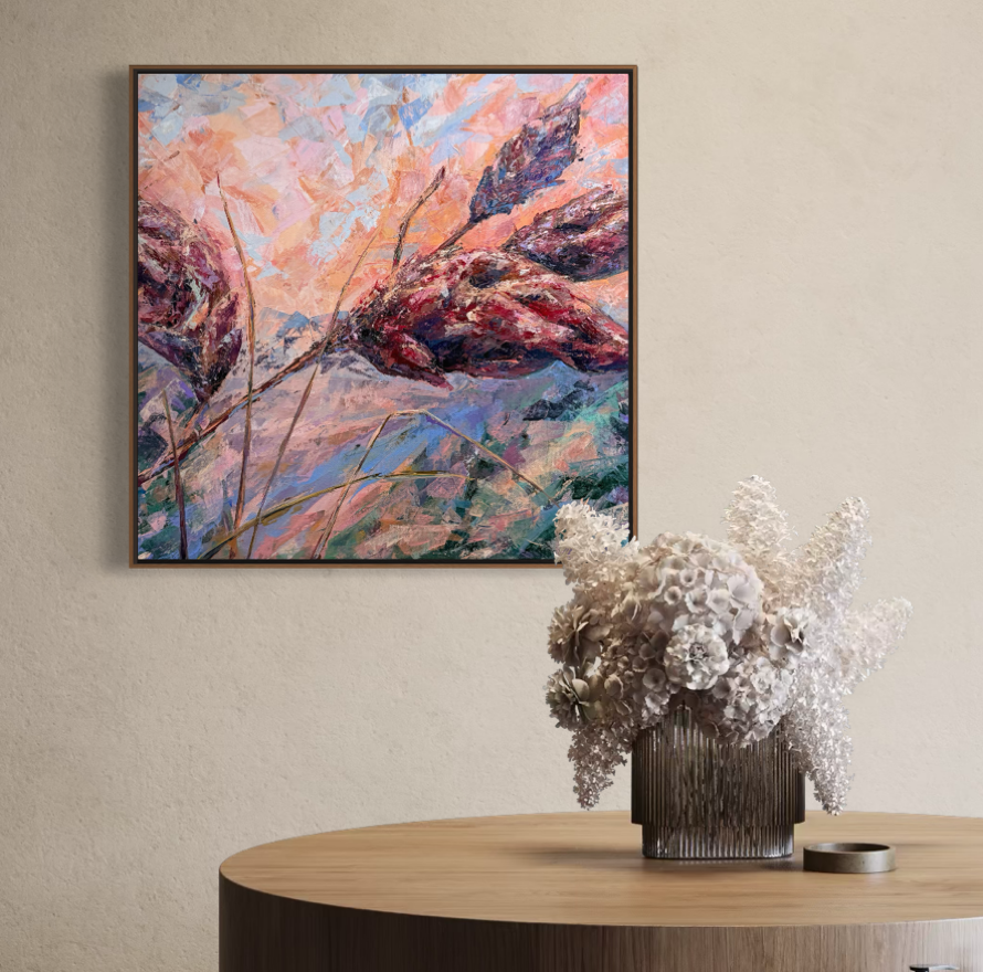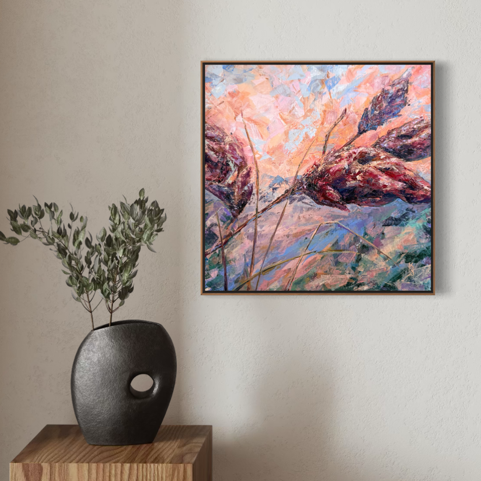 Warm sunset air cradles you in the scent of sumac. Maroon tones shape this abstract botanical interpretation of a sumac at sunset. Expressive palette knife strokes build layered texture and movement, allowing warm hues to blend and glow with depth and atmosphere.