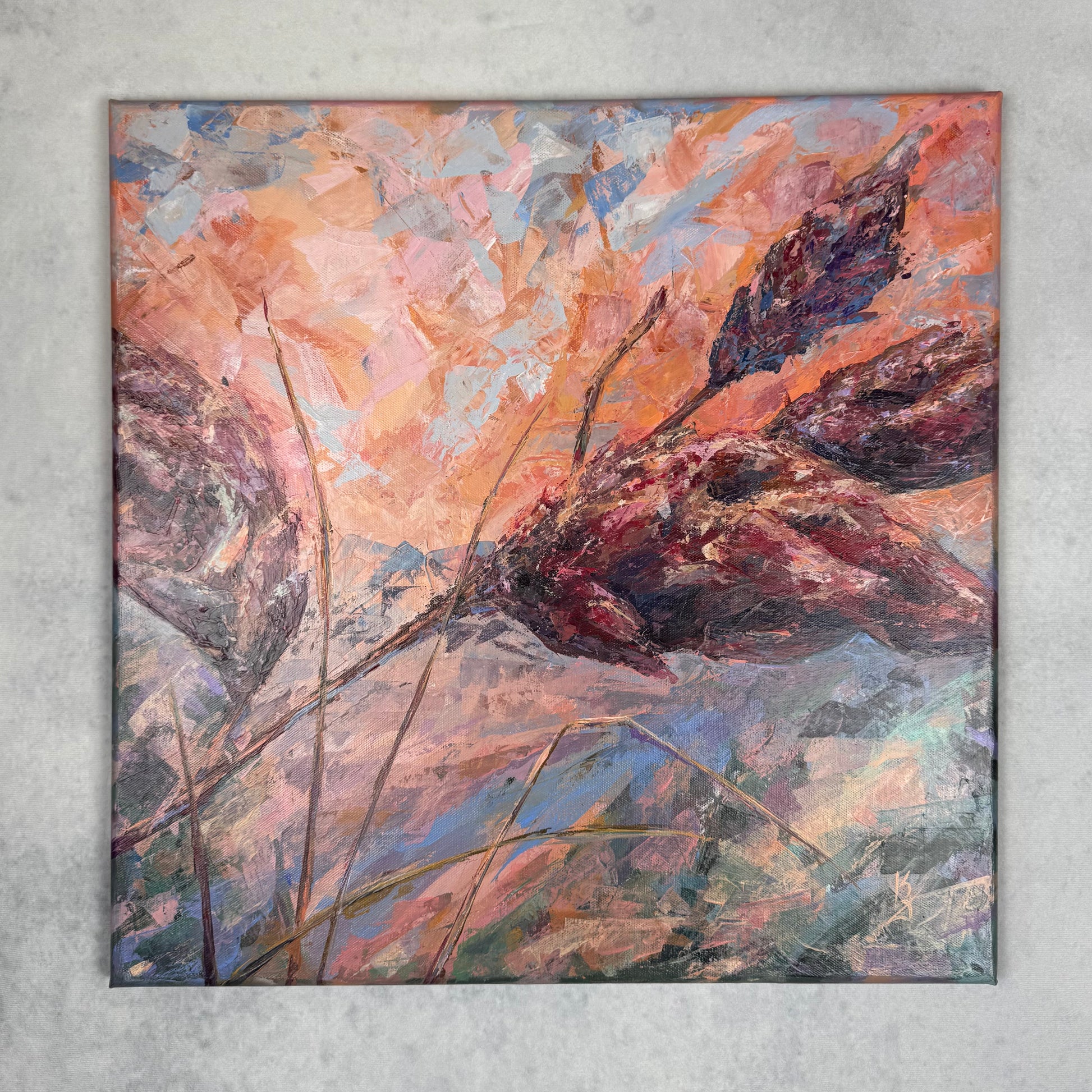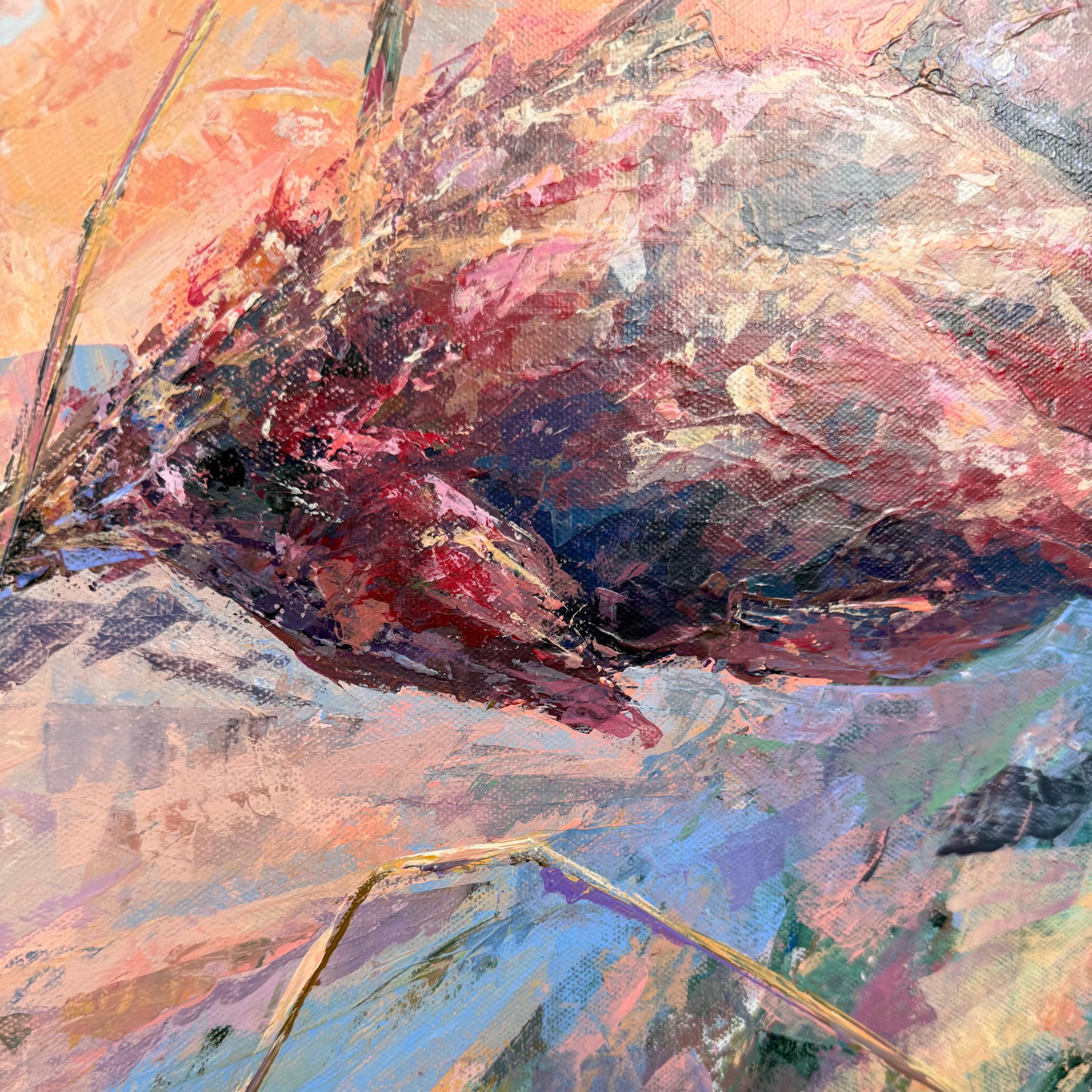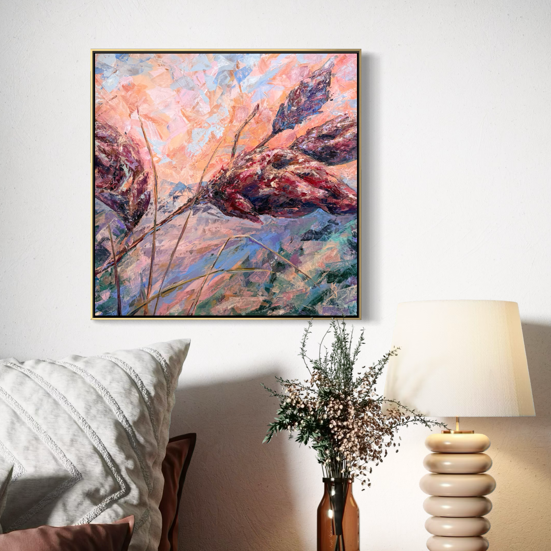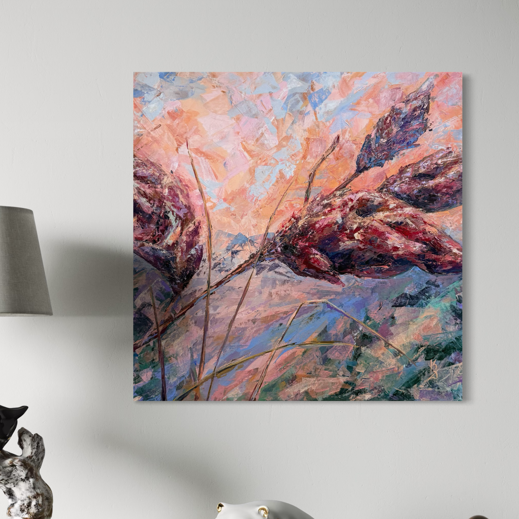 Warm sunset air cradles you in the scent of sumac. Maroon tones shape this abstract botanical interpretation of a sumac at sunset. Expressive palette knife strokes build layered texture and movement, allowing warm hues to blend and glow with depth and atmosphere.