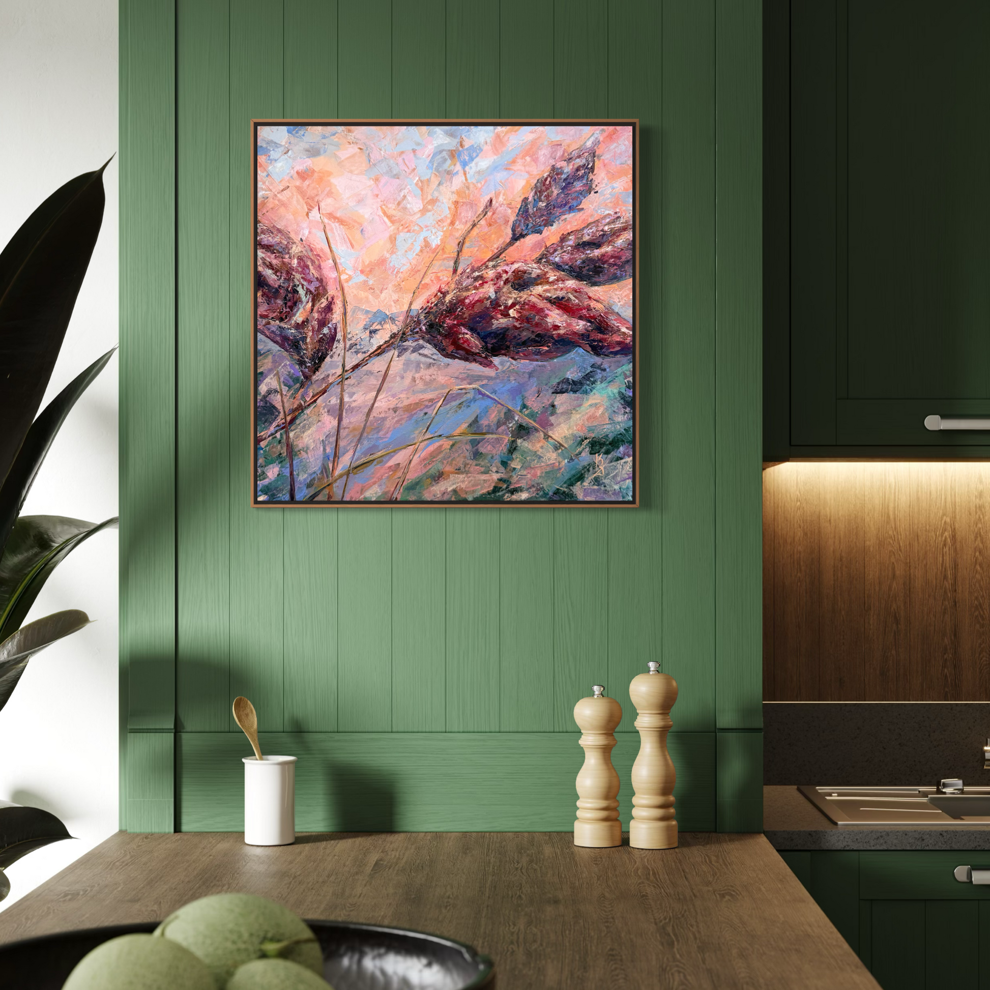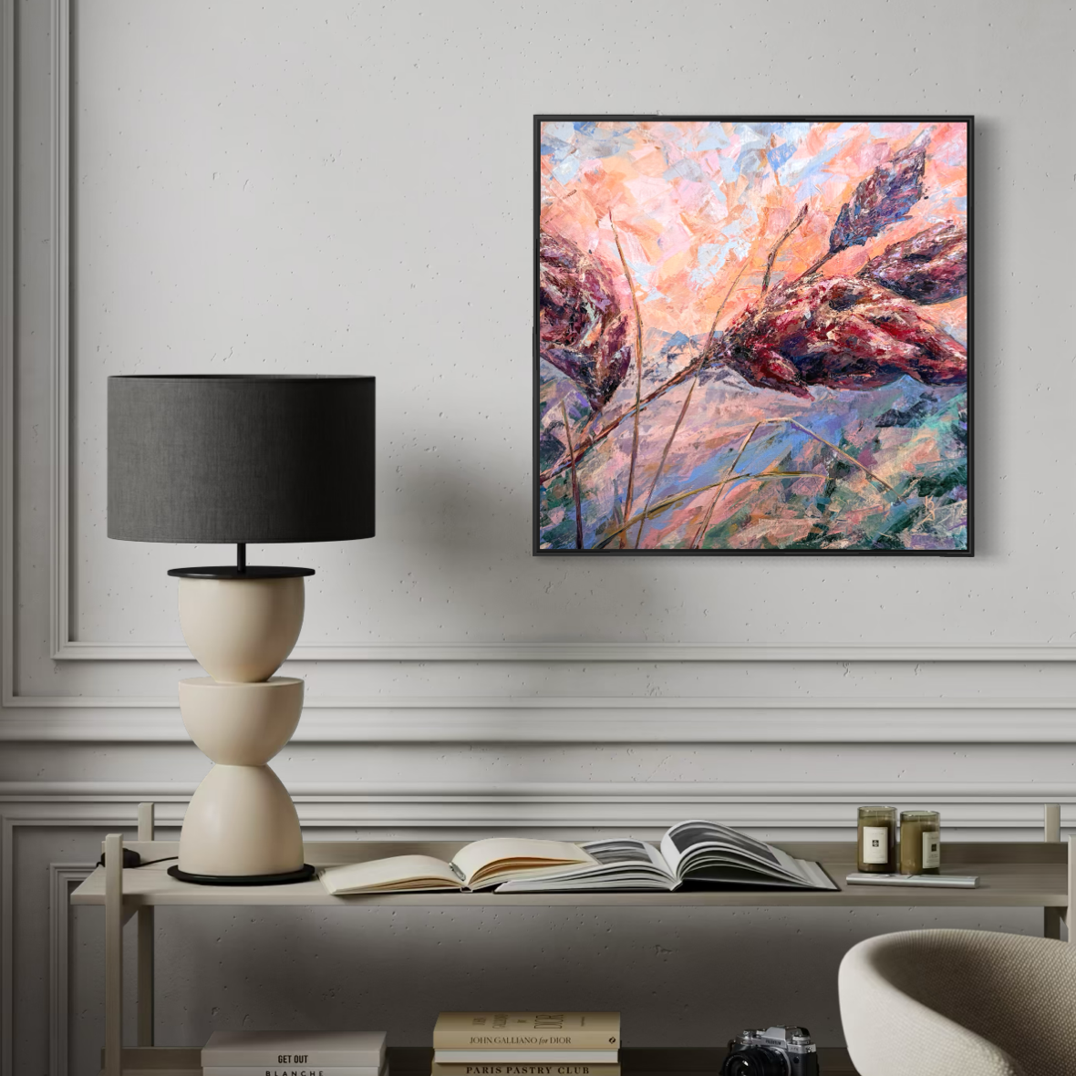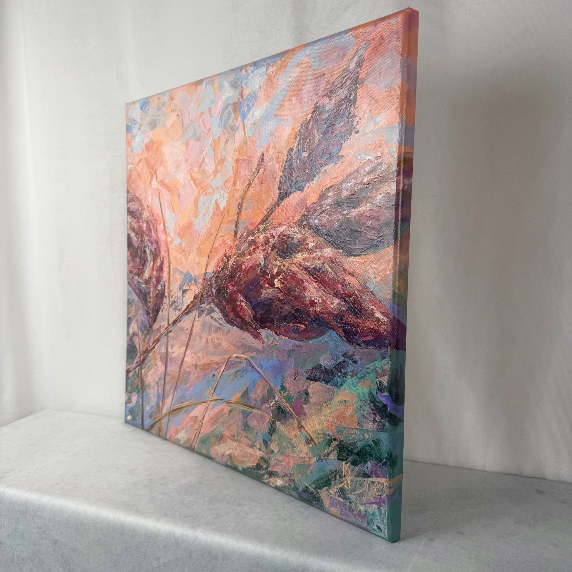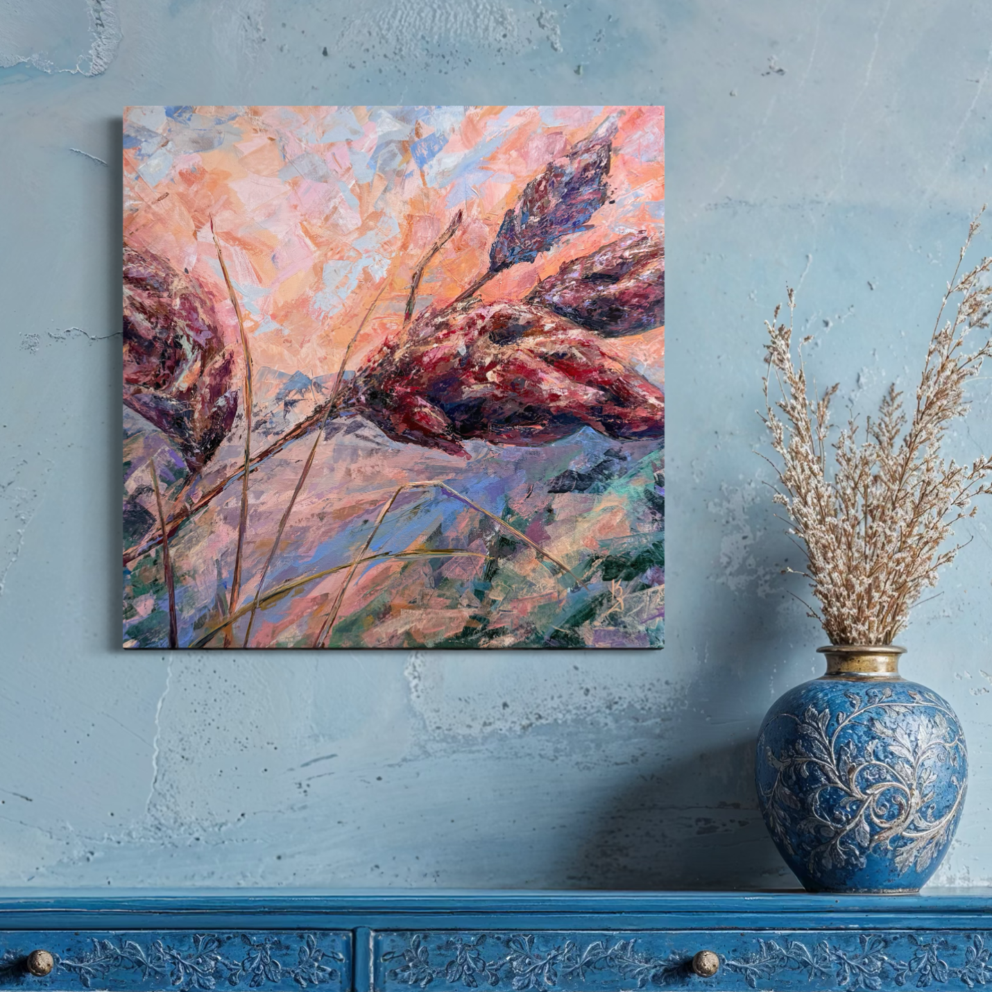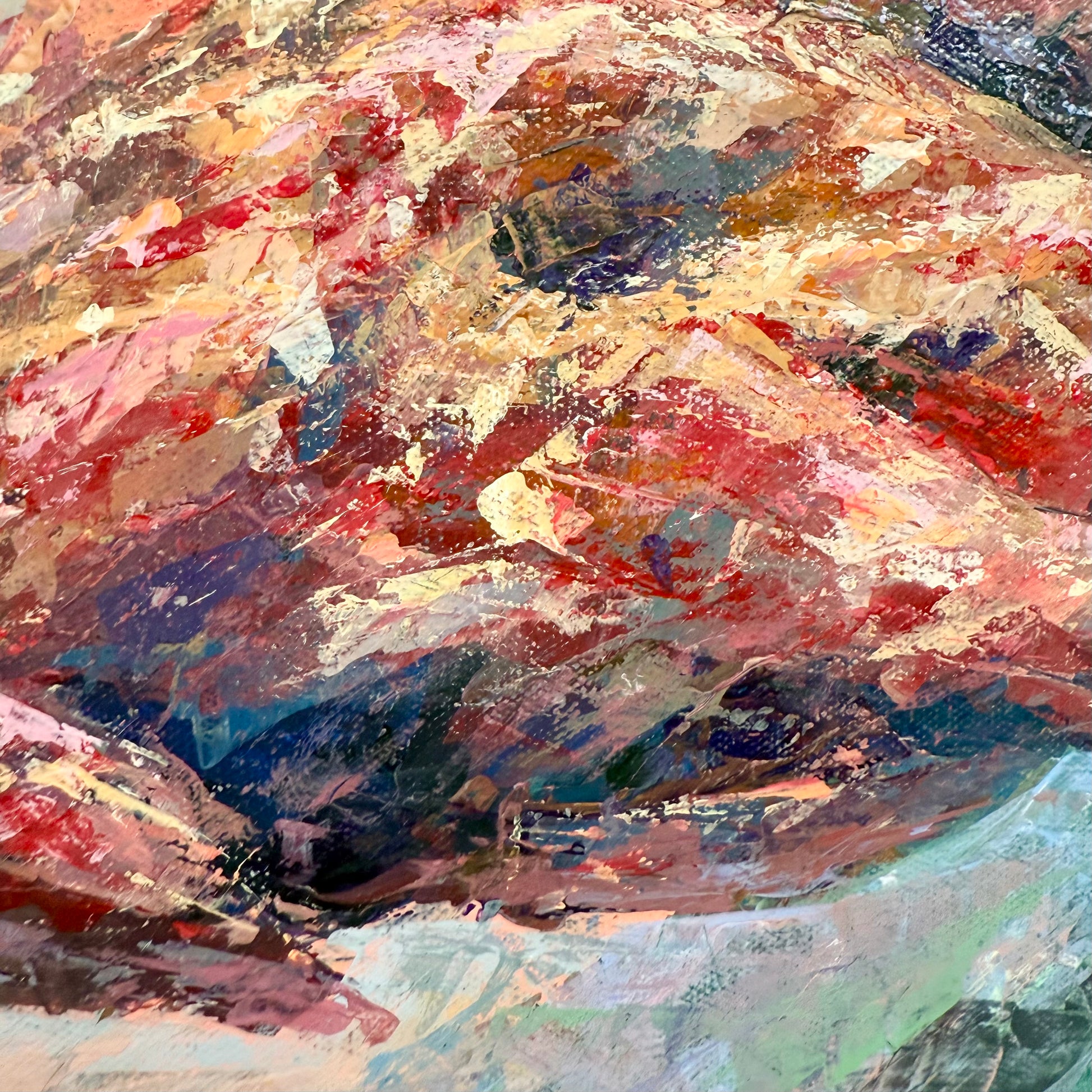 Warm sunset air cradles you in the scent of sumac. Maroon tones shape this abstract botanical interpretation of a sumac at sunset. Expressive palette knife strokes build layered texture and movement, allowing warm hues to blend and glow with depth and atmosphere.