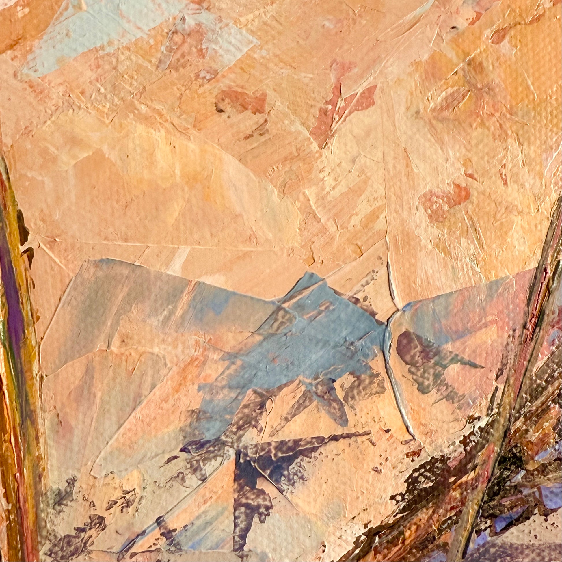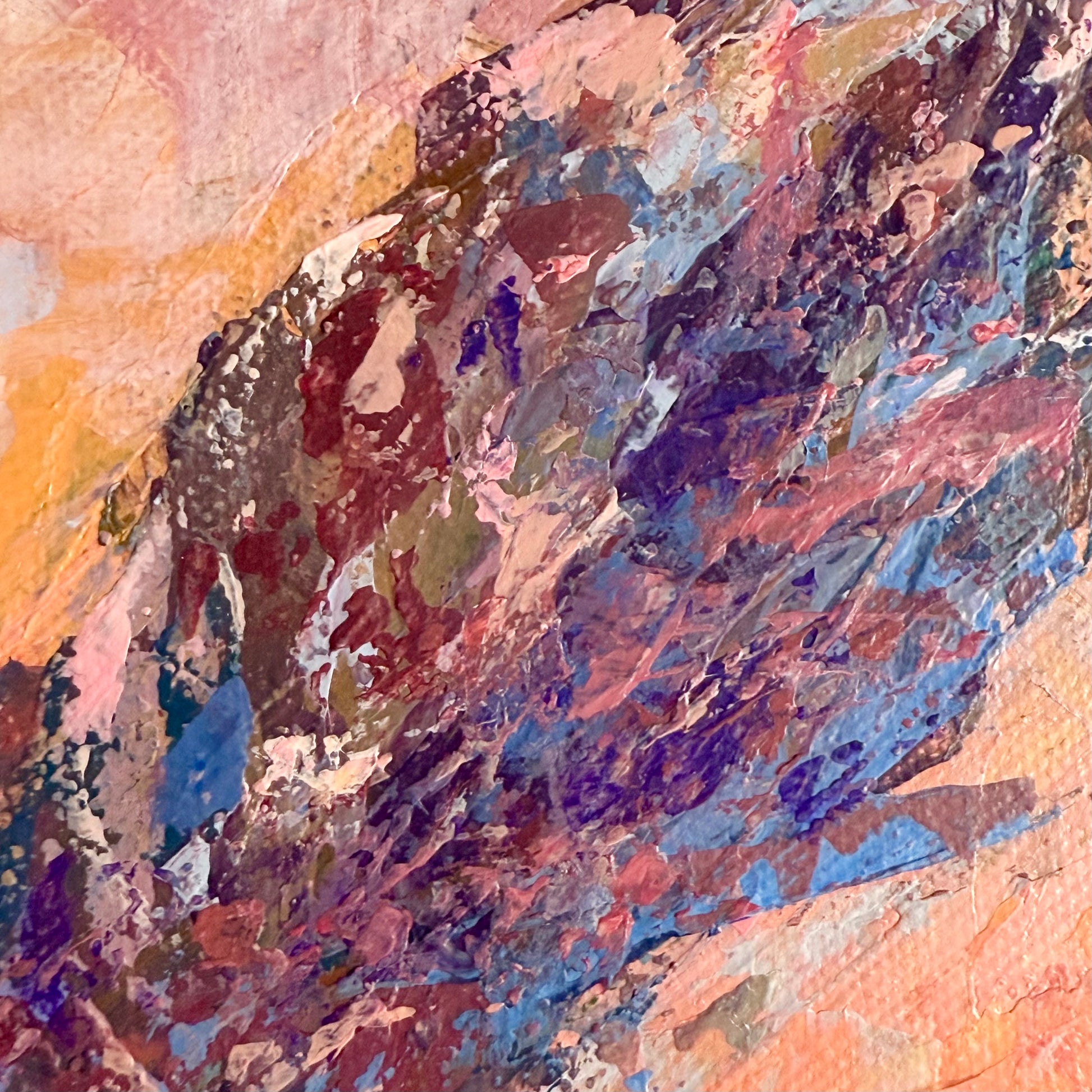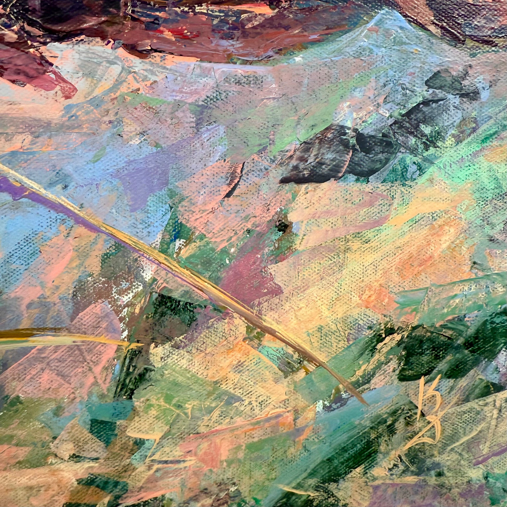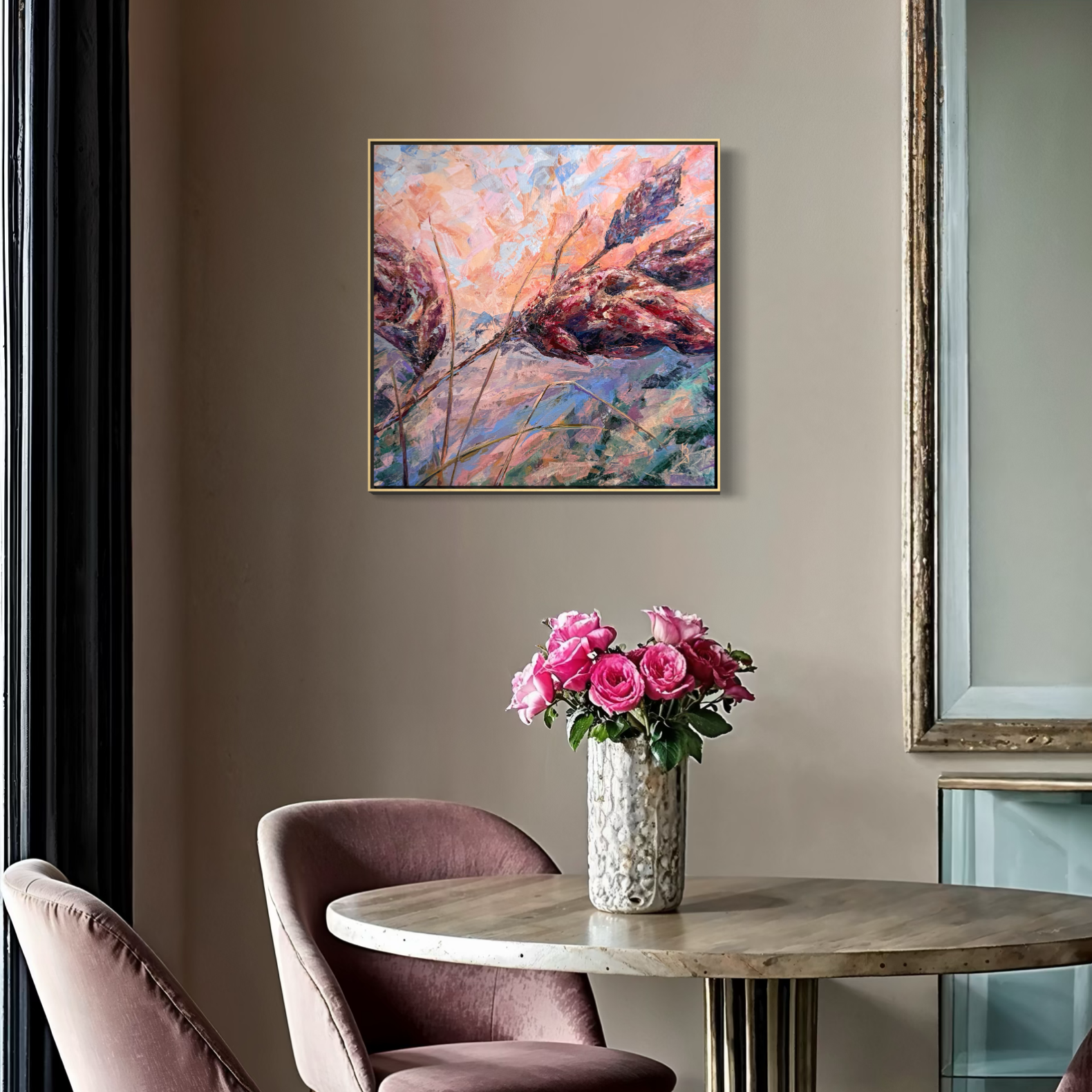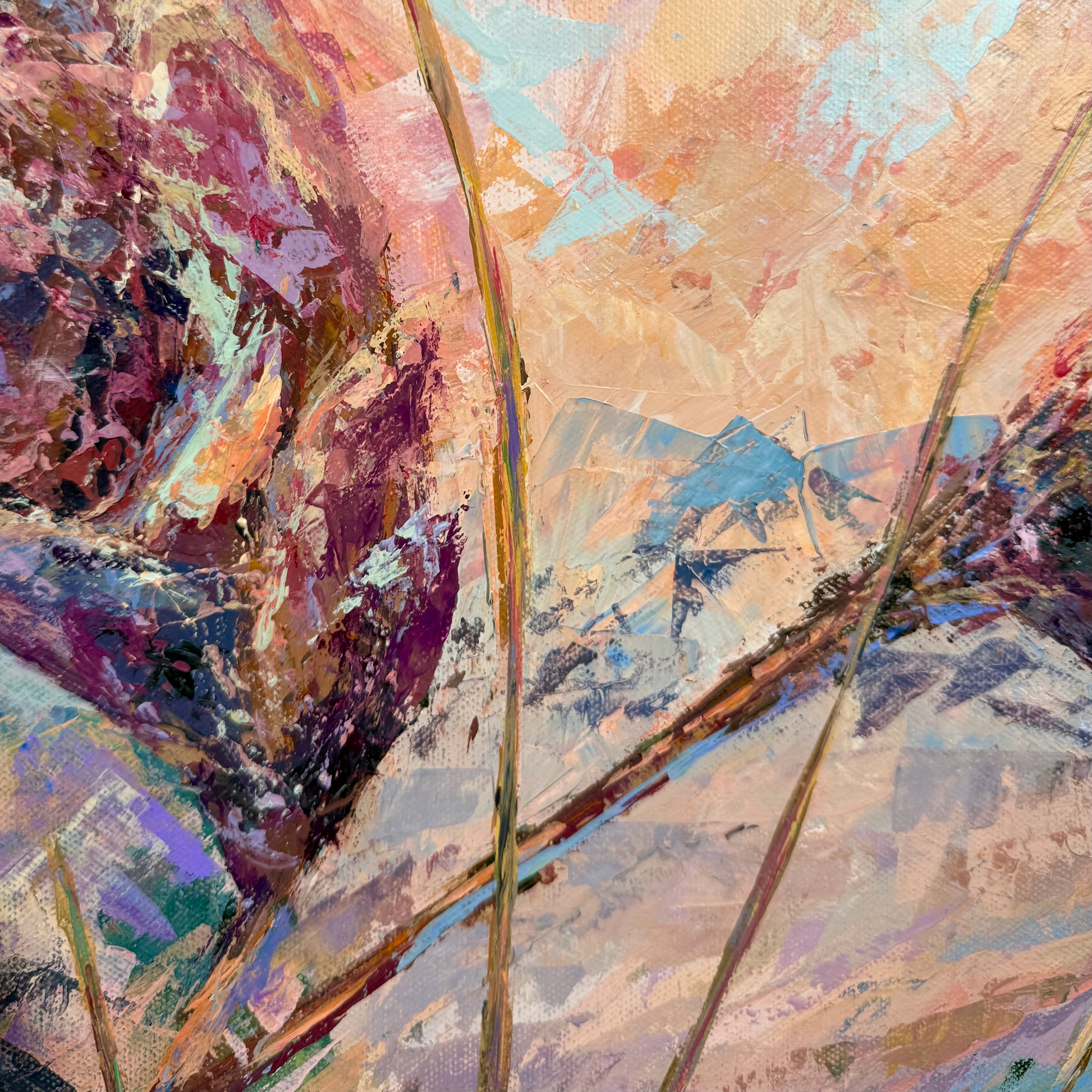 Warm sunset air cradles you in the scent of sumac. Maroon tones shape this abstract botanical interpretation of a sumac at sunset. Expressive palette knife strokes build layered texture and movement, allowing warm hues to blend and glow with depth and atmosphere.