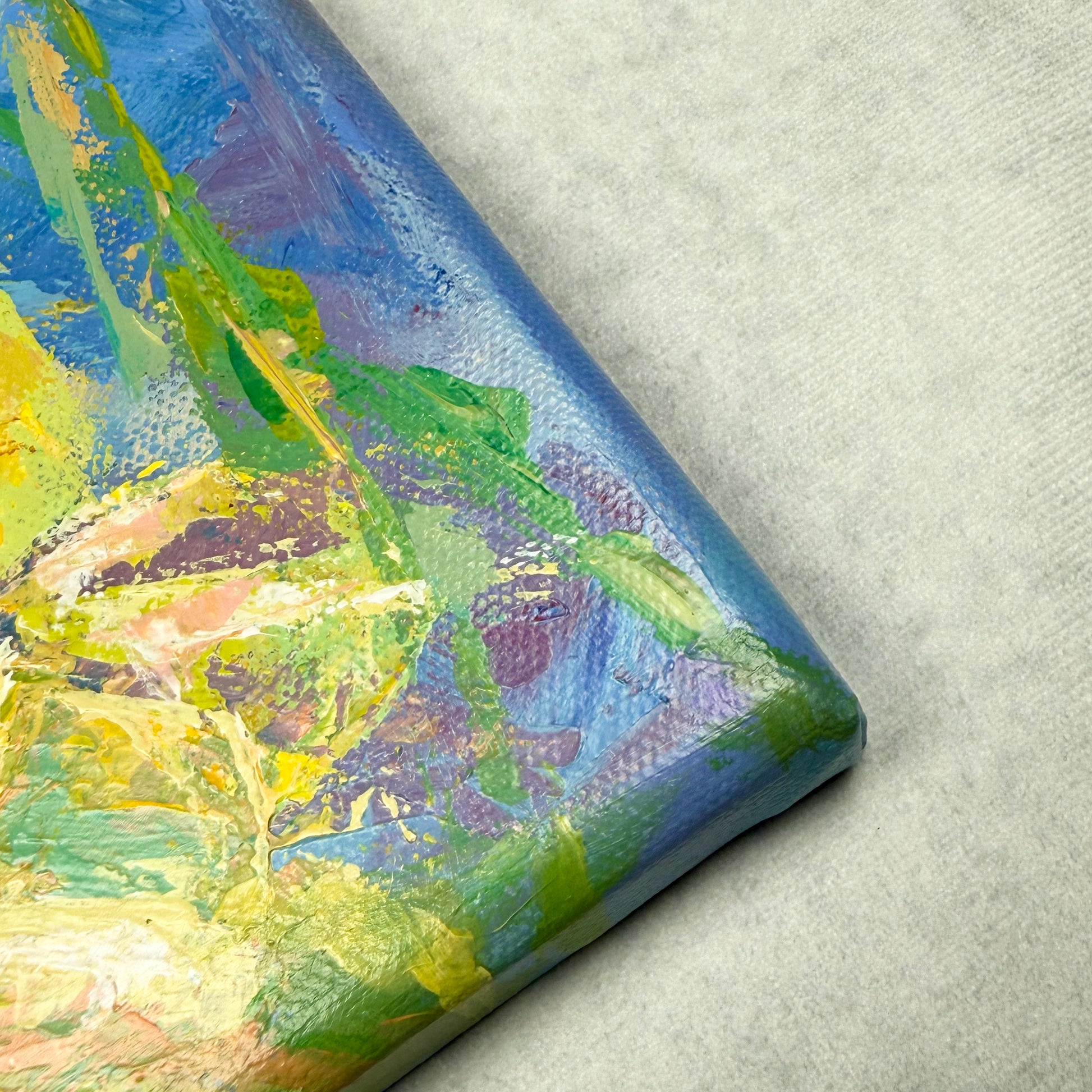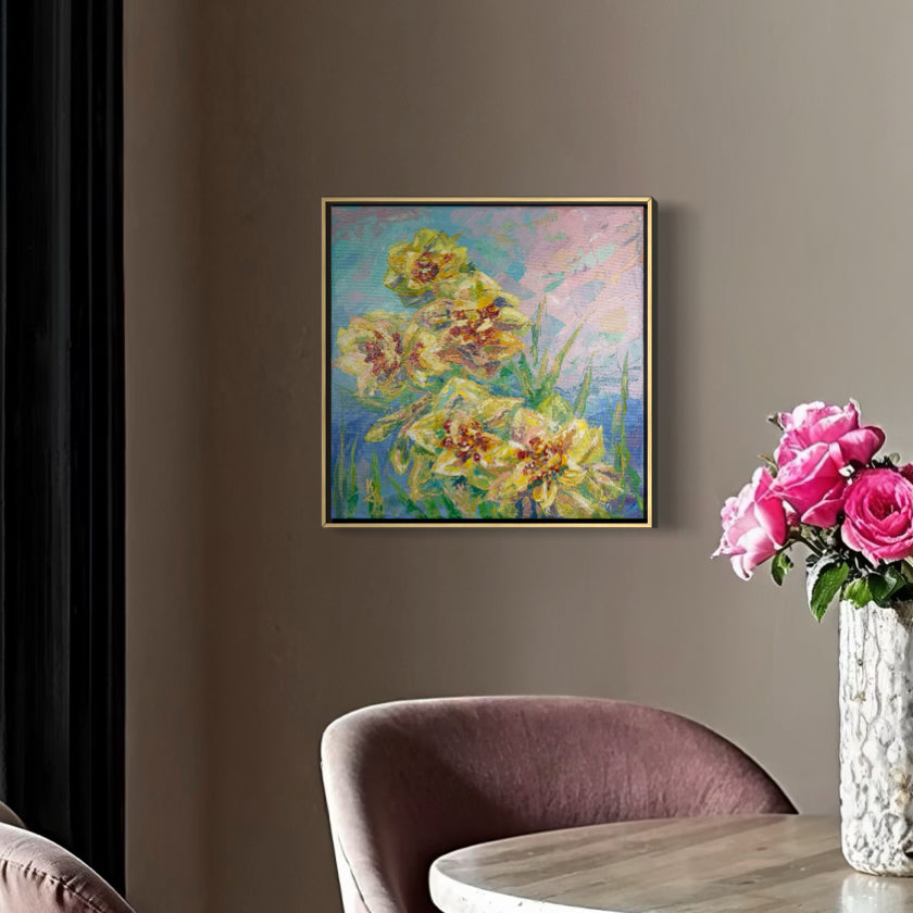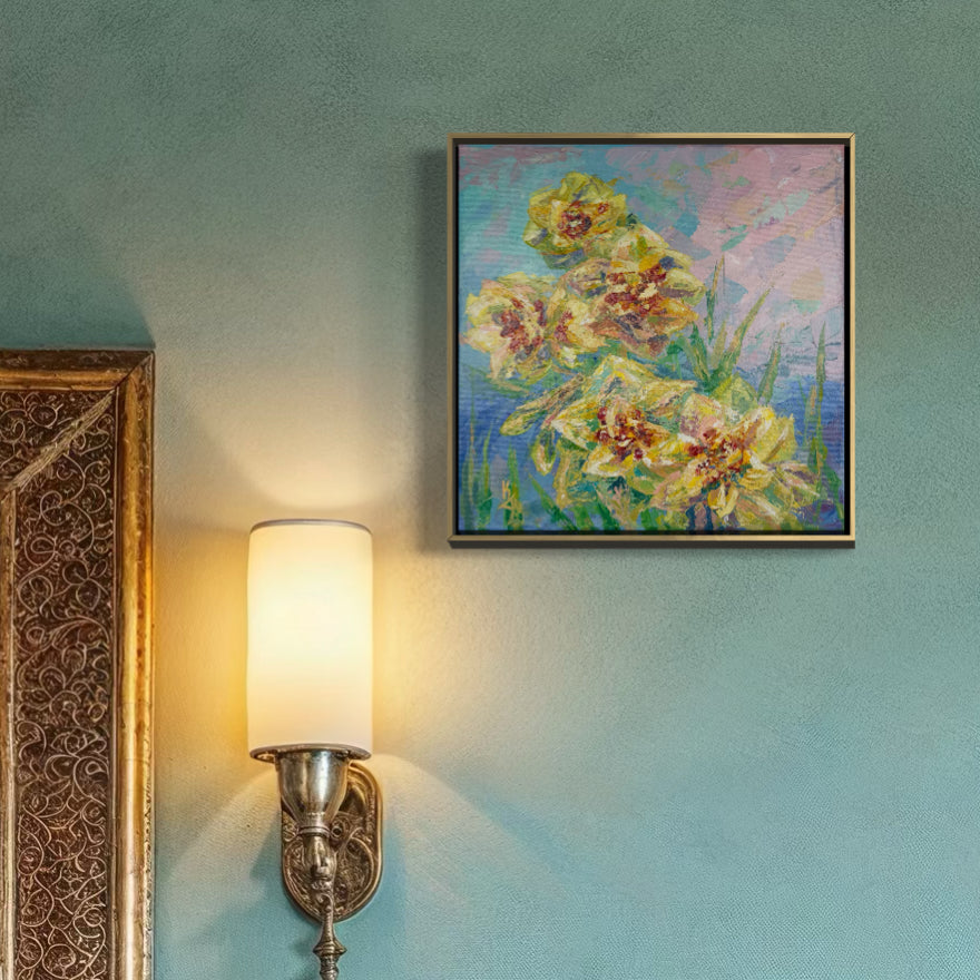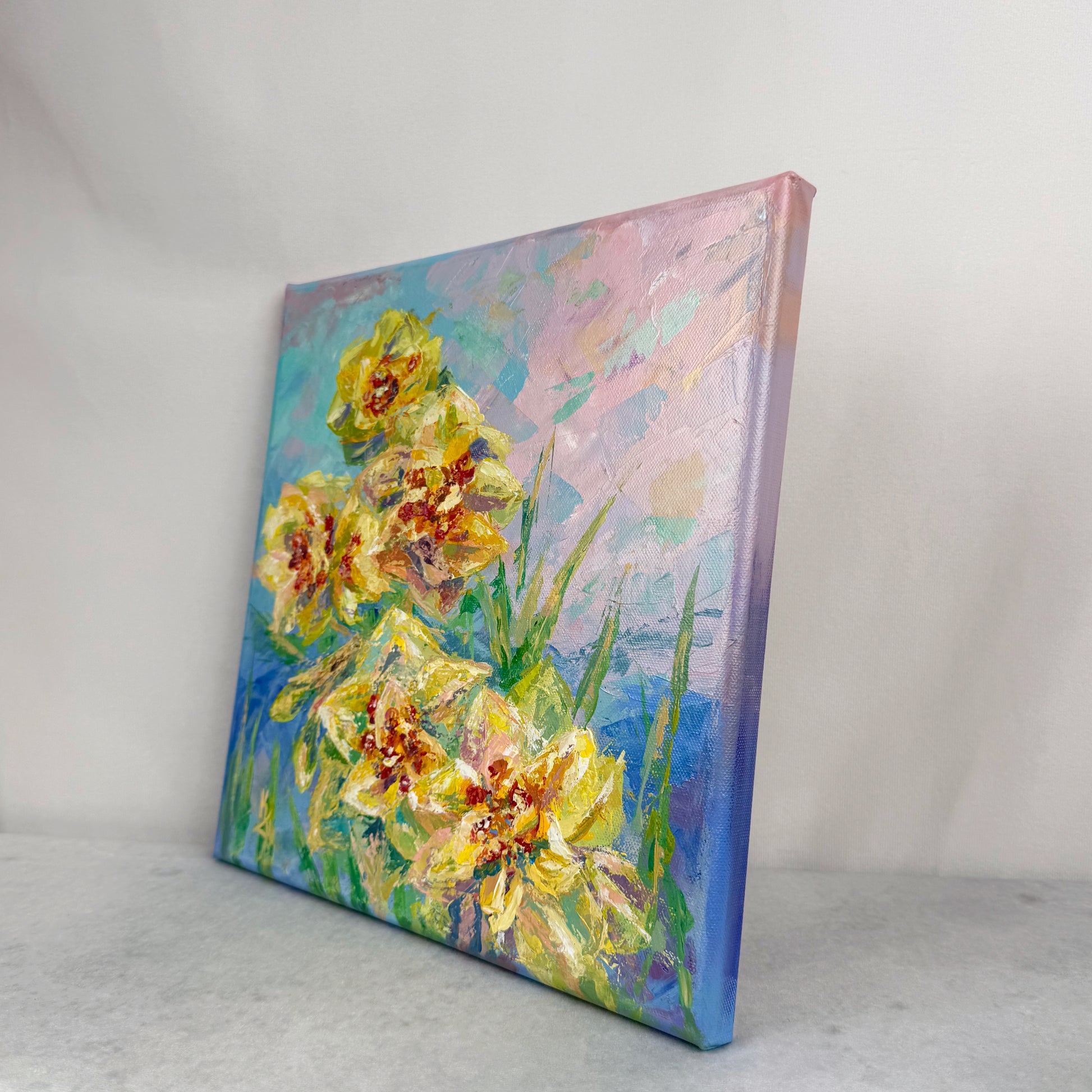 Expressive palette knife strokes and vibrant neon colors capture the energy of spring sunlight in this daffodils painting. Bright yellows and luminous tones bring freshness and movement to the composition, reflecting the moment when nature awakens after winter. The textured surface and glowing light convey the joyful vitality of blooming flowers, warm sun, and the renewing spirit of early spring.