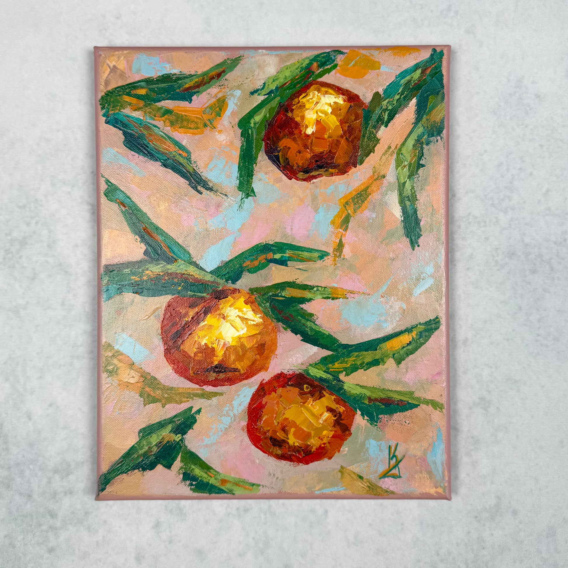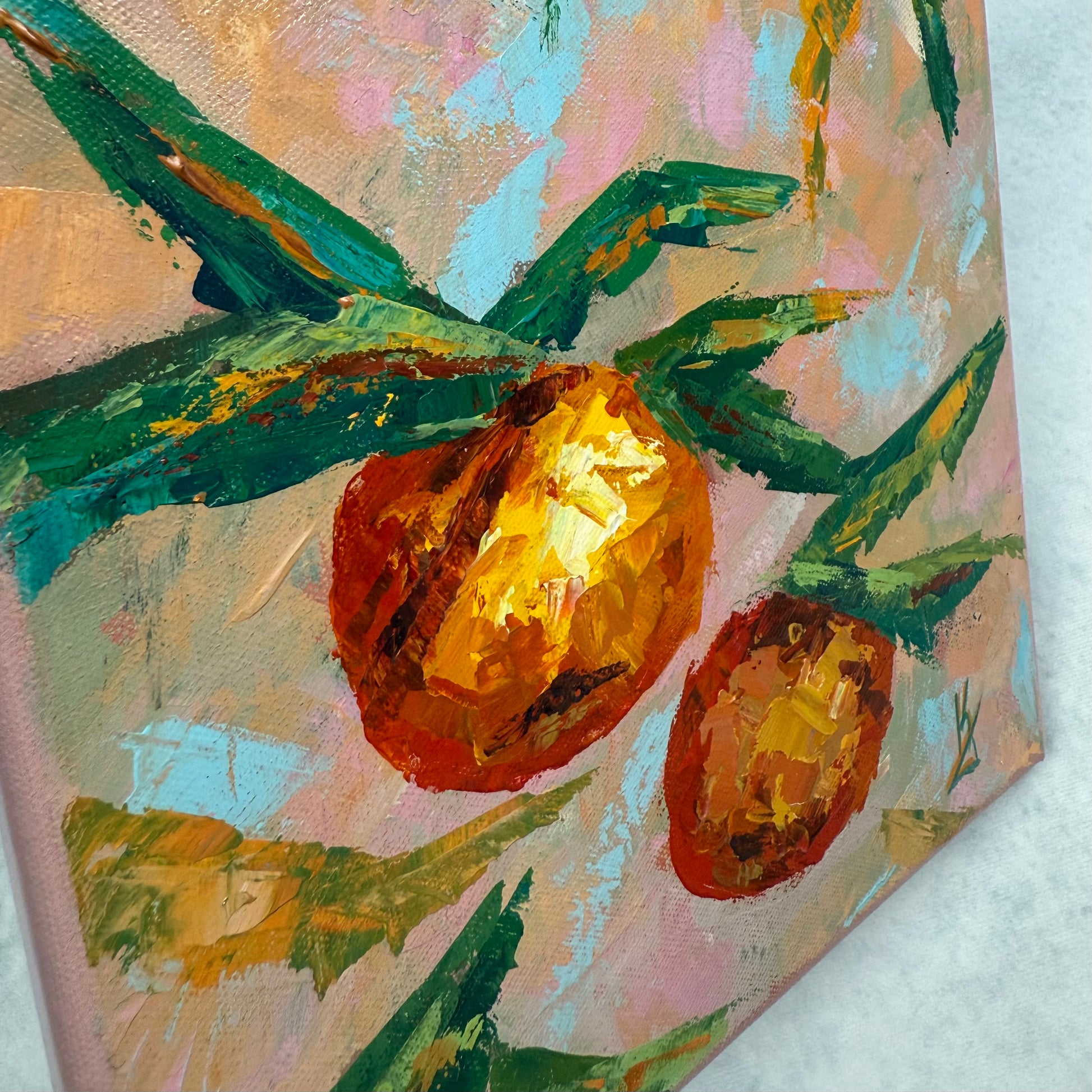 Standing beneath an orange tree, sunlight filters through the leaves as sky and sun weave together above, filling the space with warmth, freshness, and quiet joy. The painting comes alive through vibrant color and expressive palette knife strokes, capturing light, movement, and sensory presence.