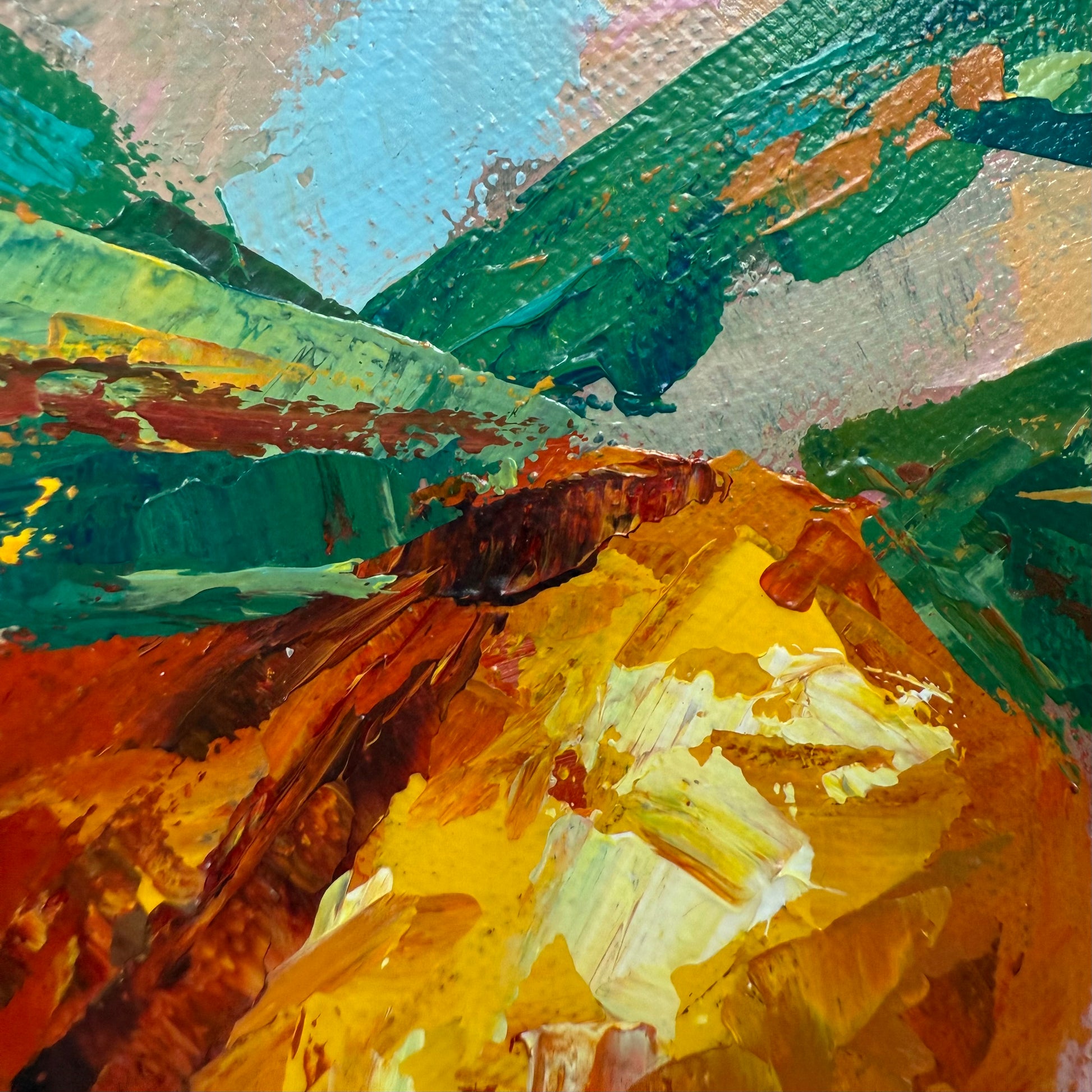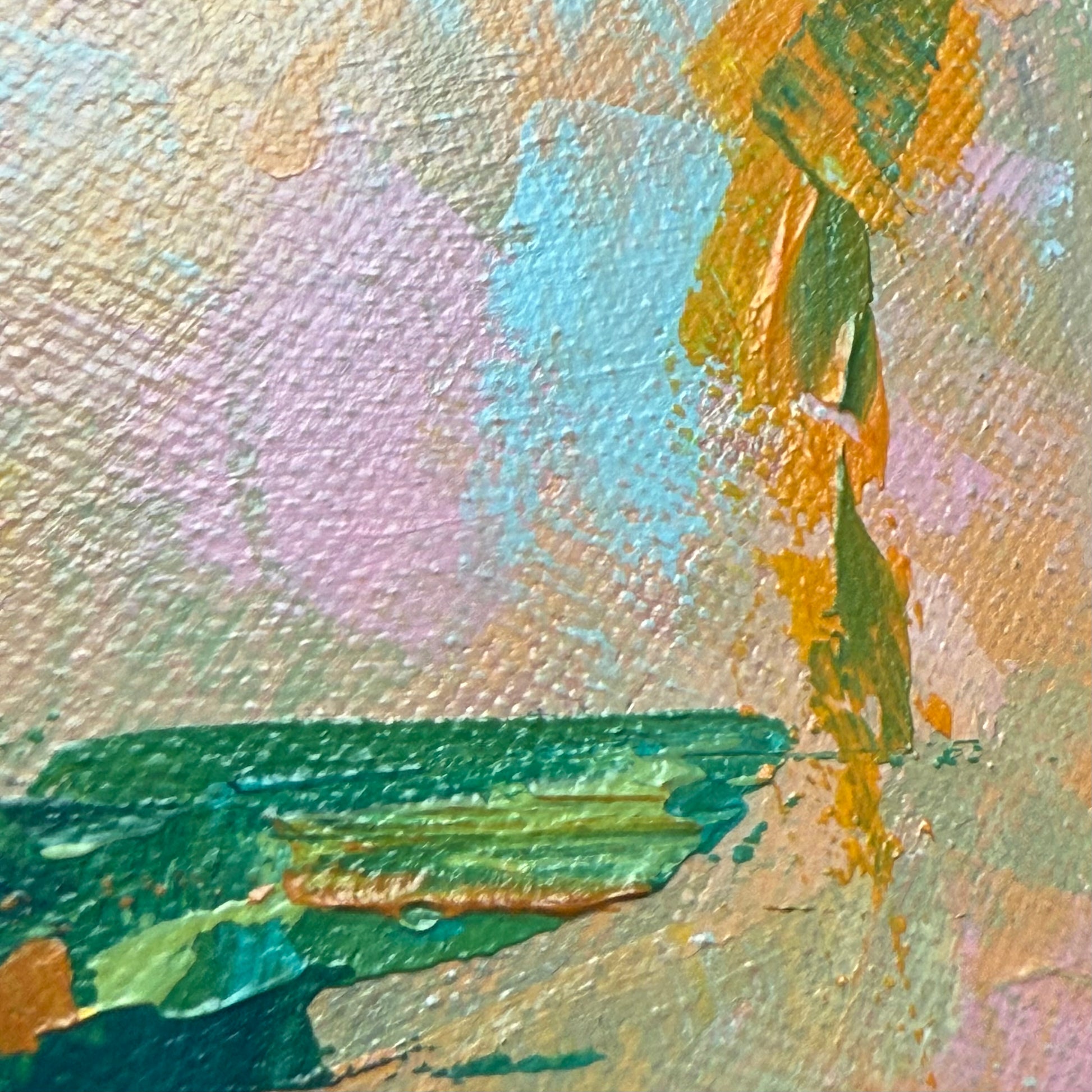 Standing beneath a orange tree, sunlight filters through the leaves as sky and sun weave together above, filling the space with warmth, freshness, and quiet joy. The painting comes alive through vibrant color and expressive palette knife strokes, capturing light, movement, and sensory presence.