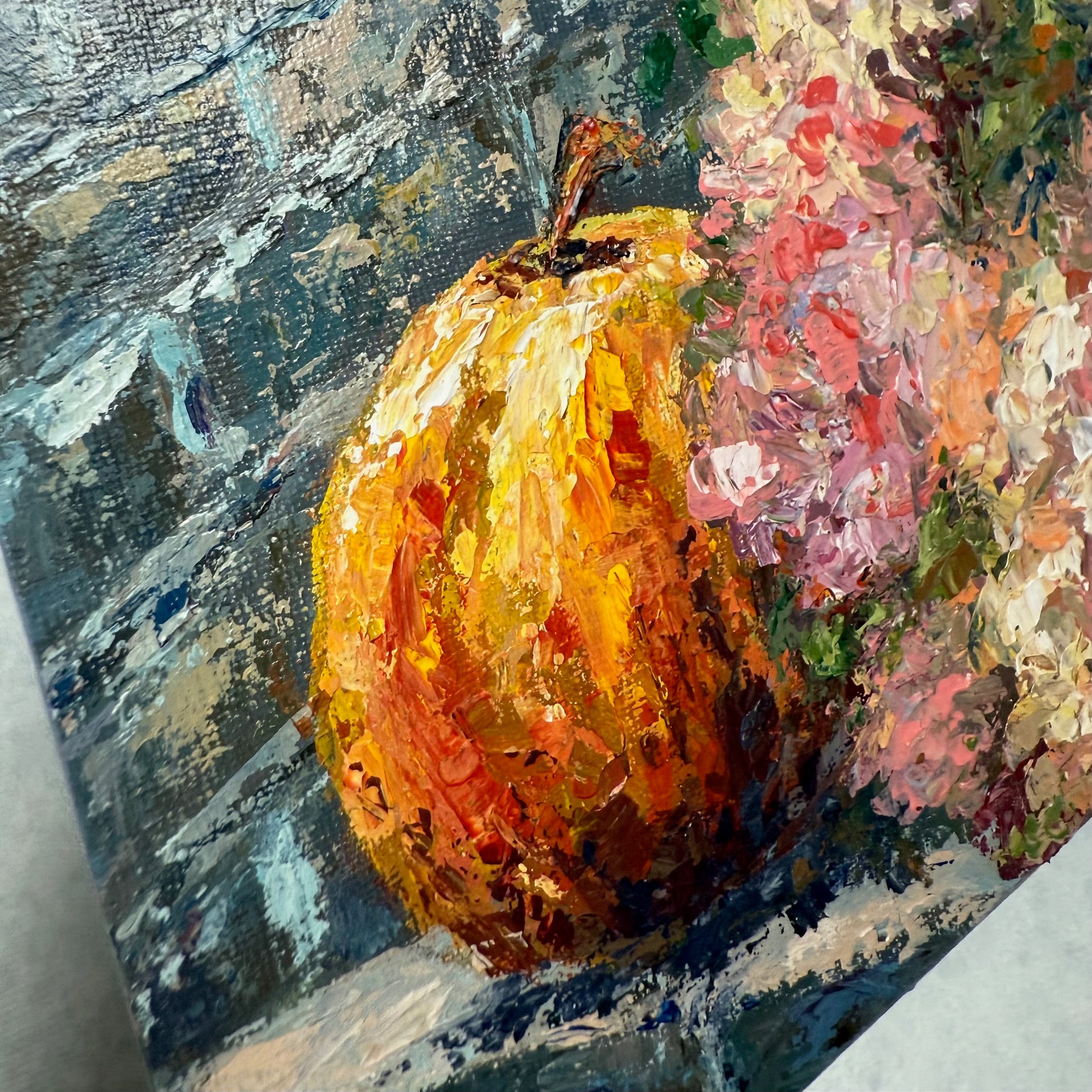 A vibrant textured painting created with expressive palette knife strokes — featuring blooming hydrangeas and a bright pumpkin nestled among warm autumn tones. The rich texture and lively colors bring a cozy seasonal rustic charm.