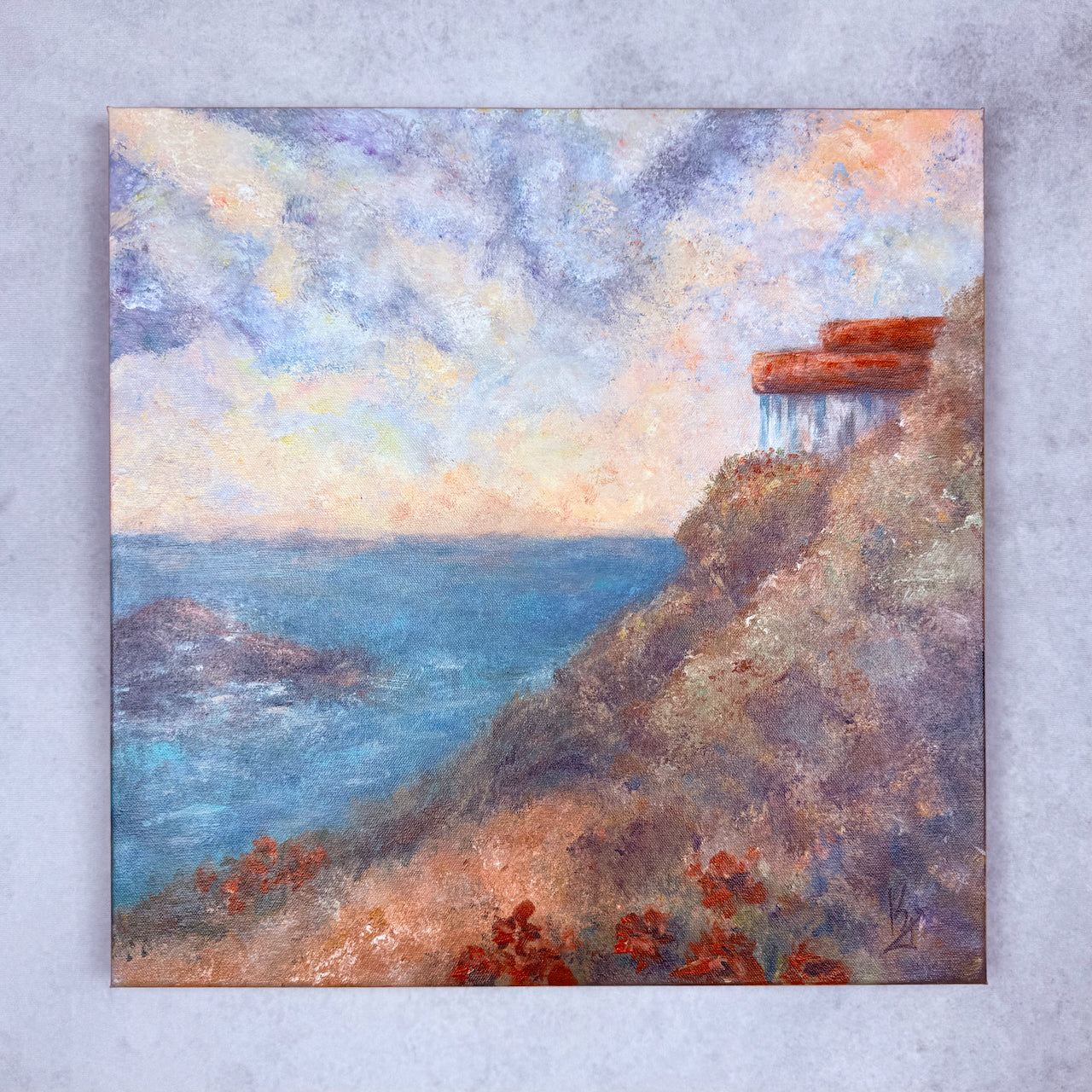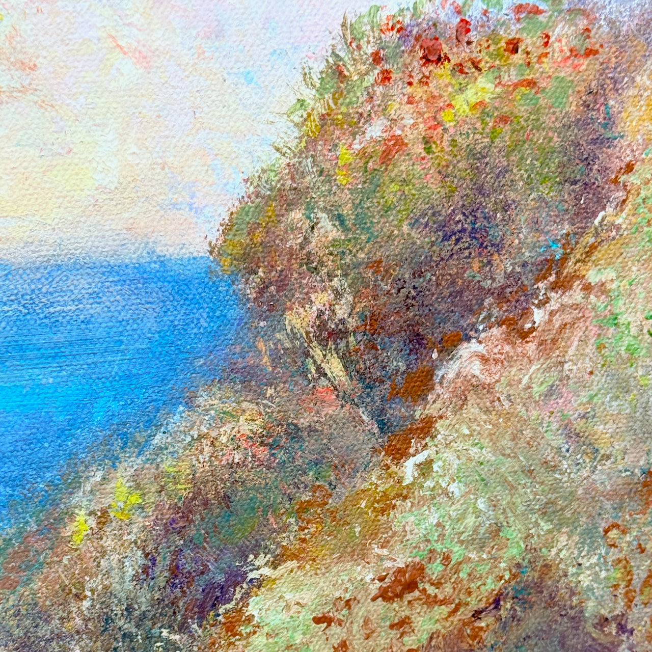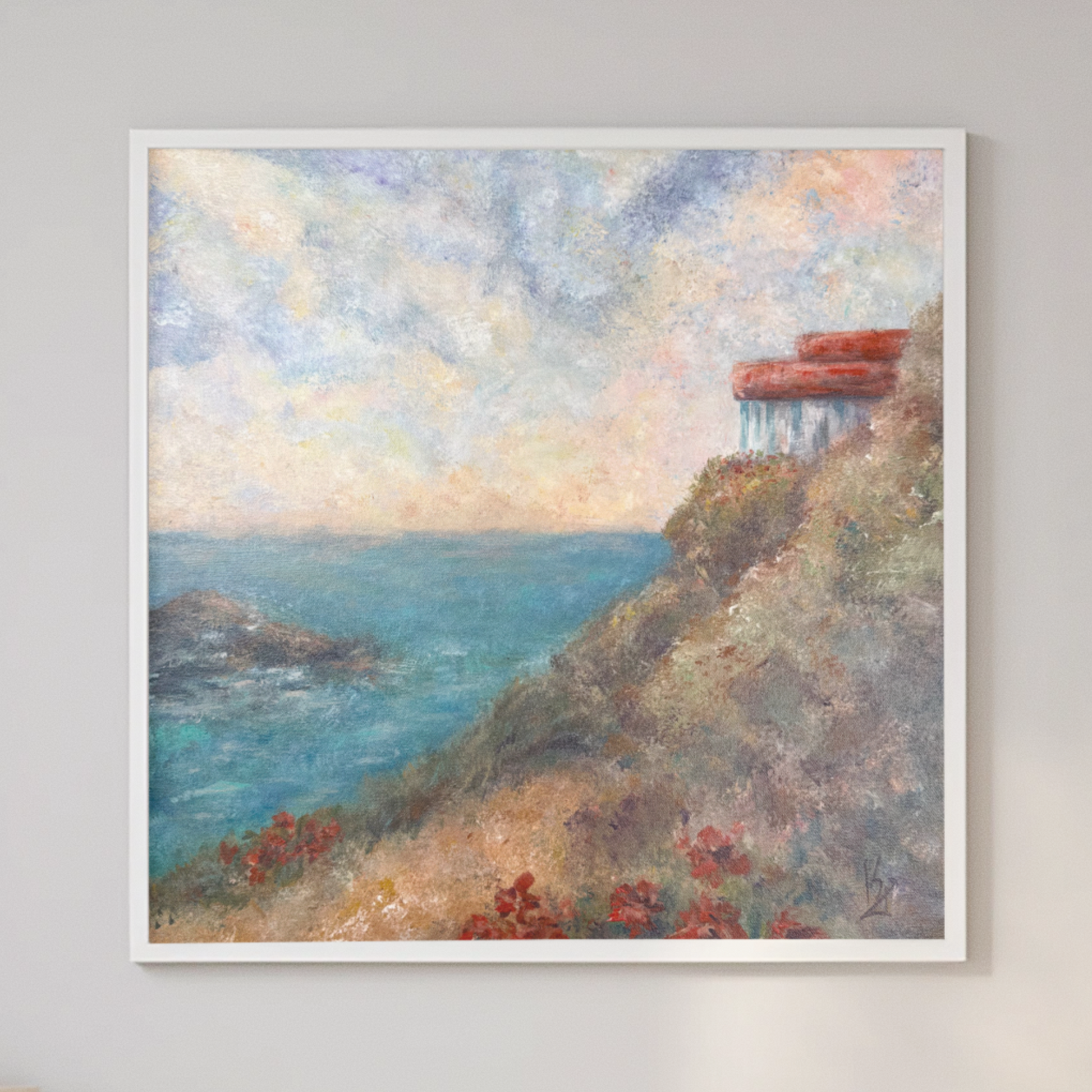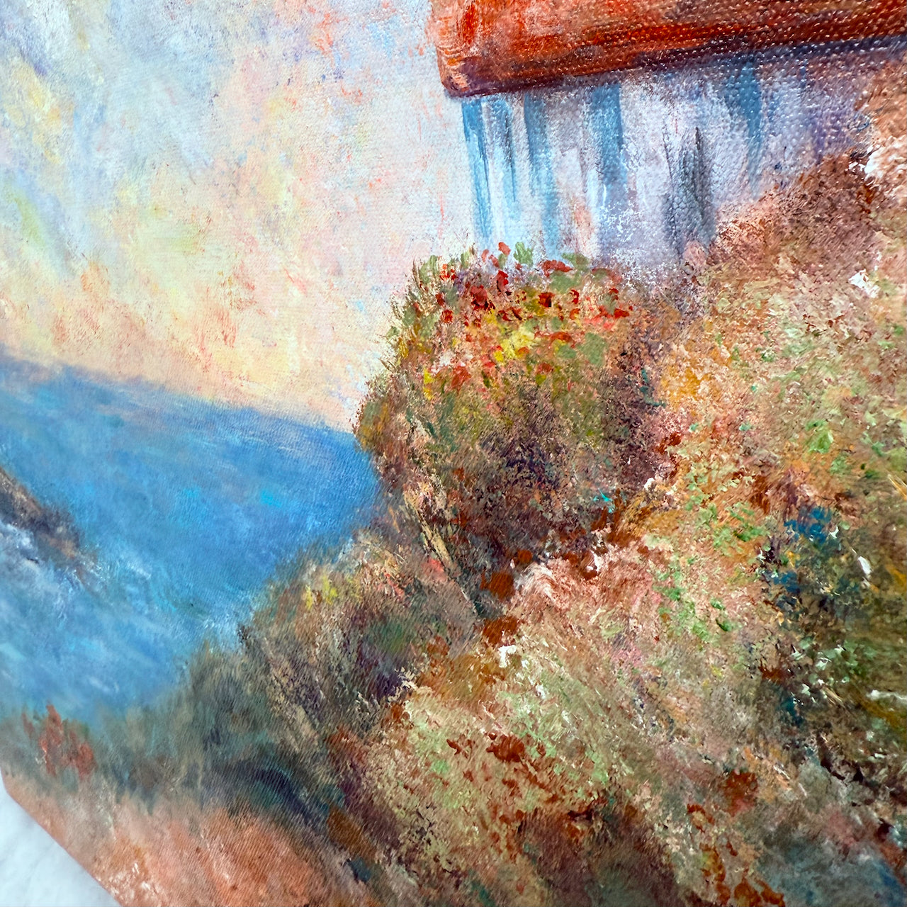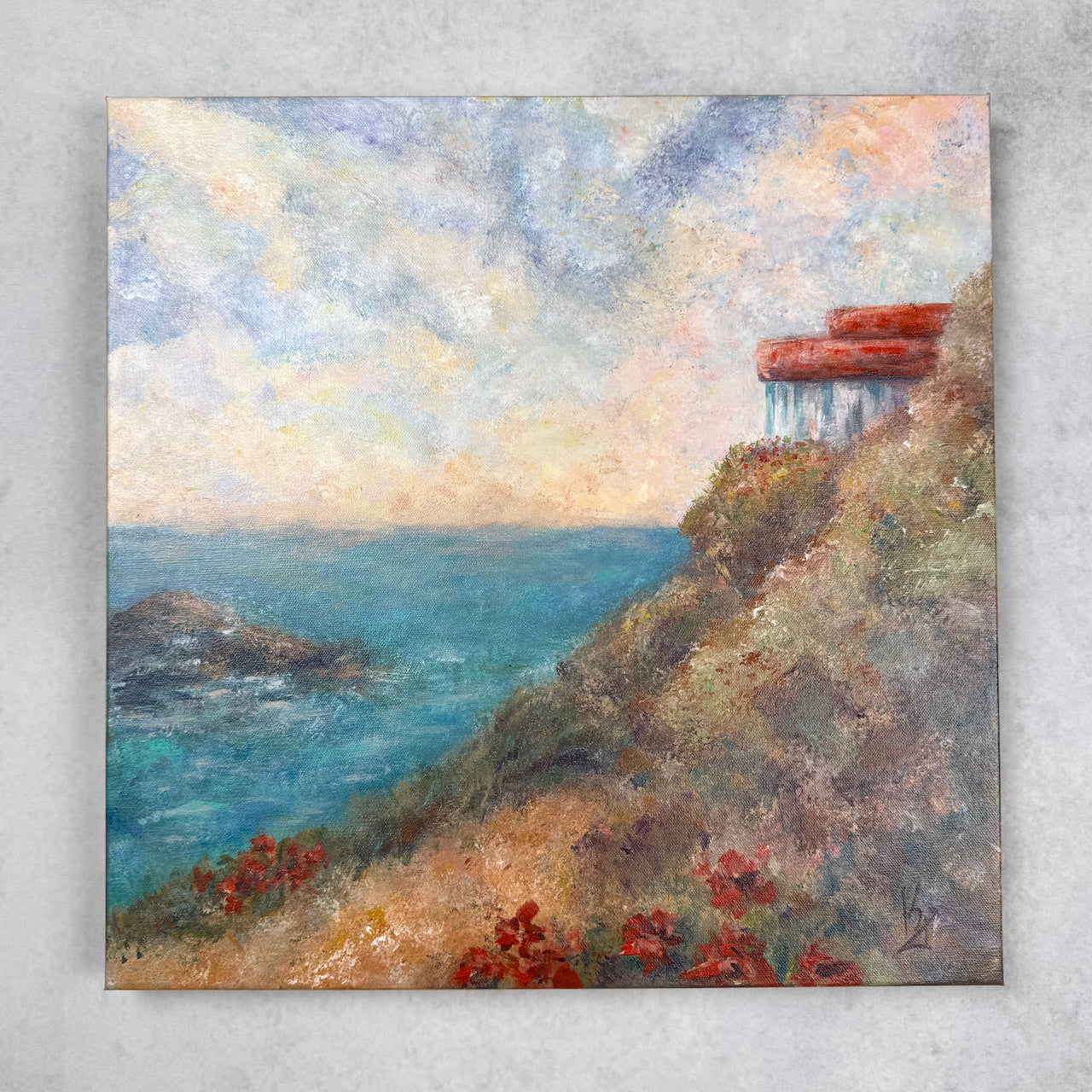 Imagine yourself walking along a sandy path, breathing in sun-warmed herbs and flowers. Below, vast blue water glows beneath a tall white house perched on the cliff. You feel the warm breeze — the scent of the sun flowing through you, filling you with serene, relaxing warmth...
