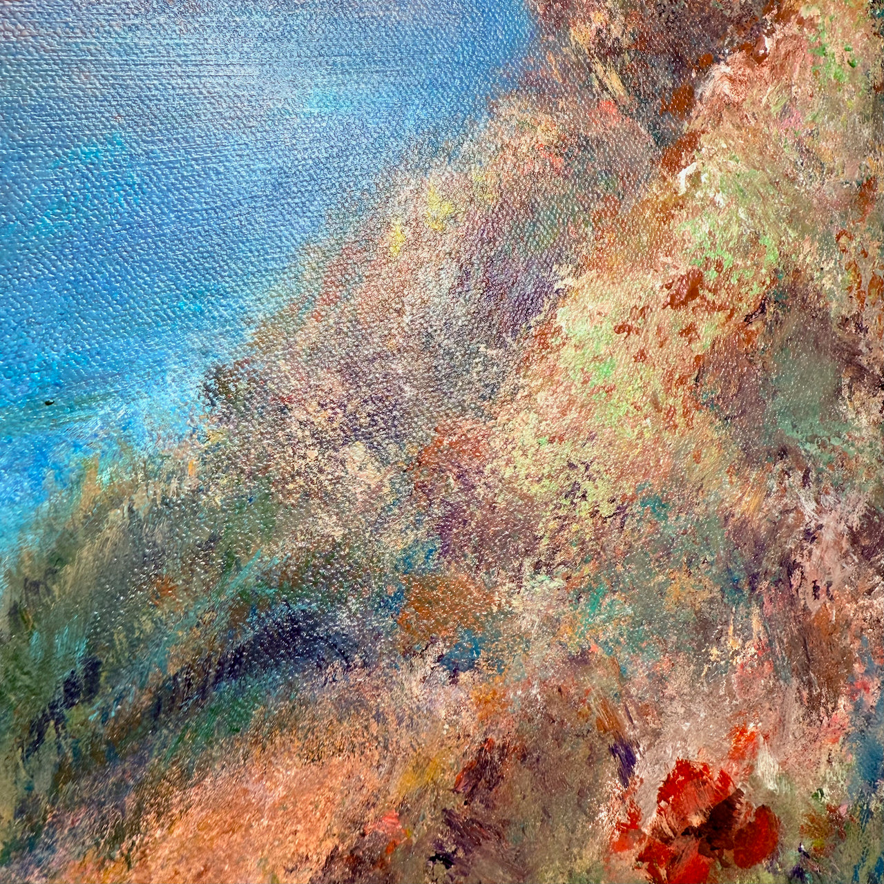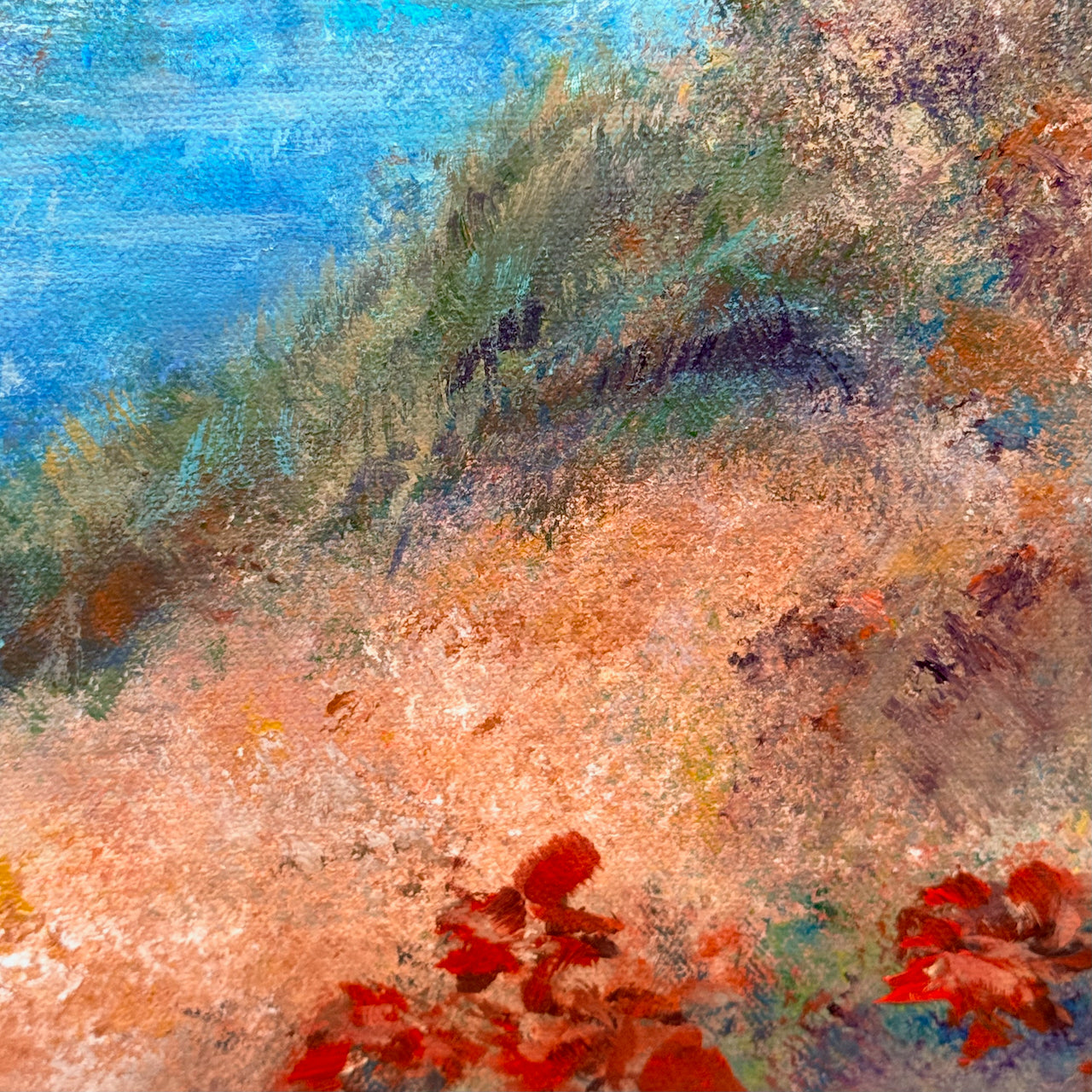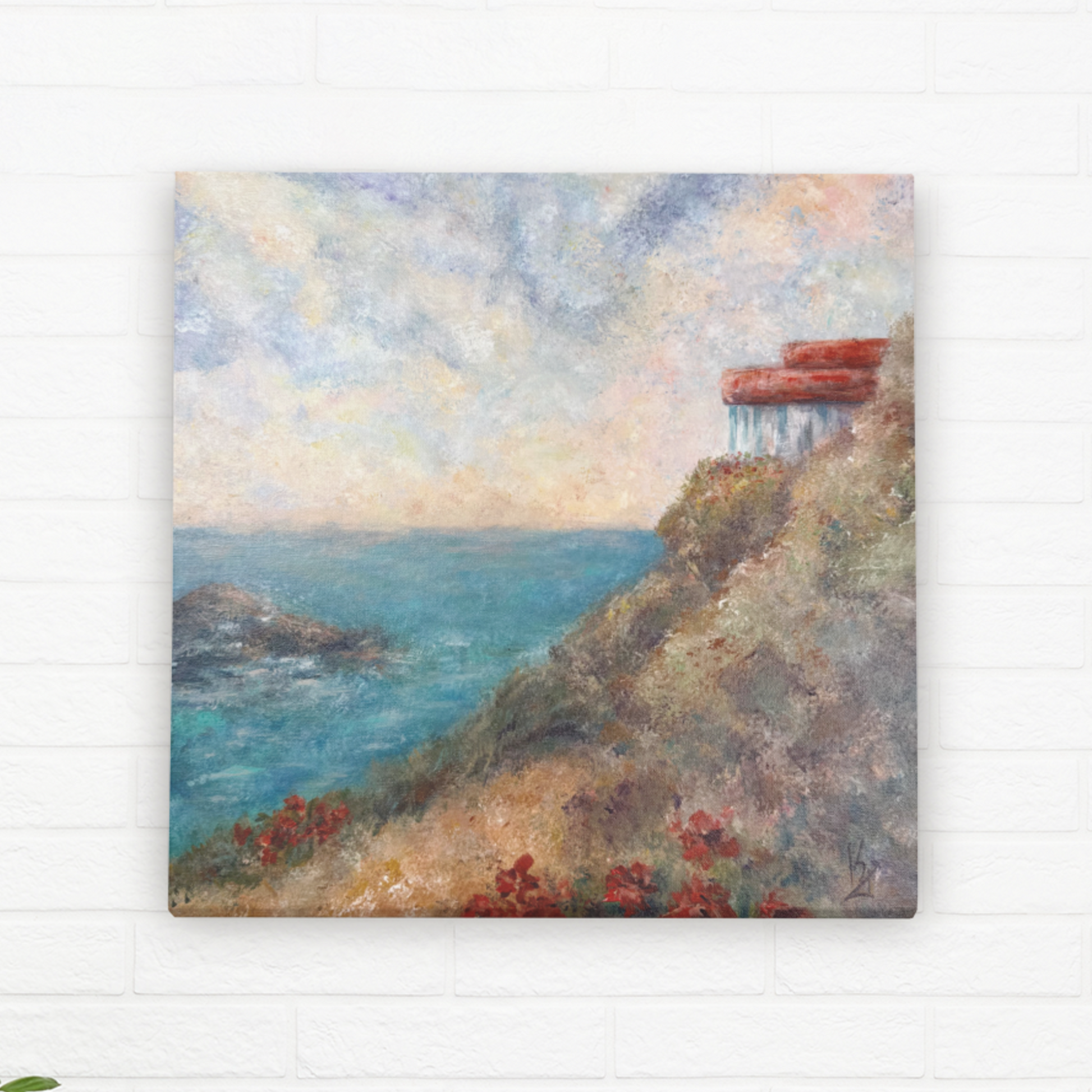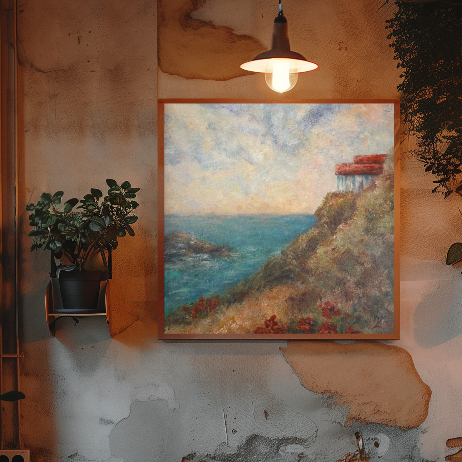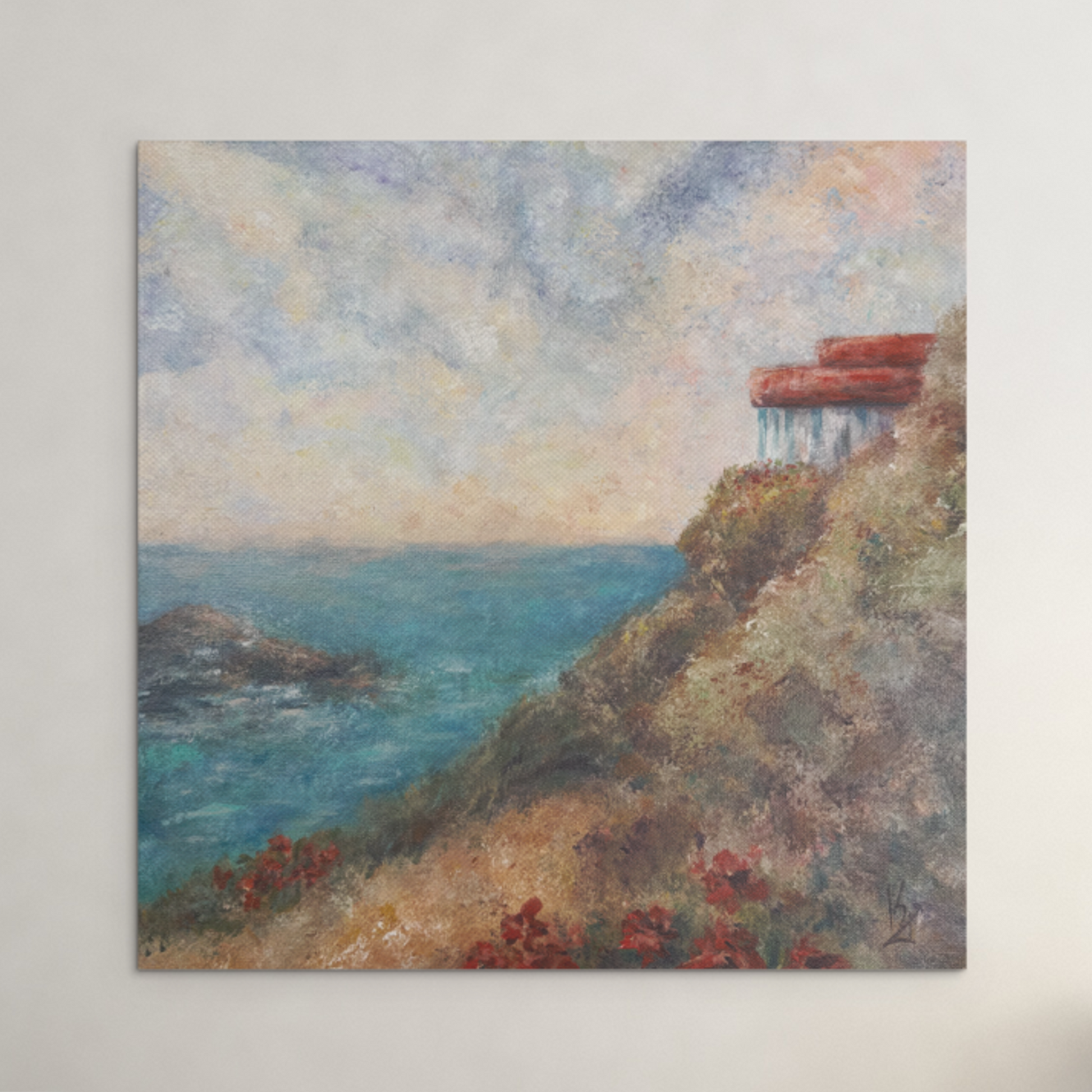 Imagine yourself walking along a sandy path, breathing in sun-warmed herbs and flowers. Below, vast blue water glows beneath a tall white house perched on the cliff. You feel the warm breeze — the scent of the sun flowing through you, filling you with serene, relaxing warmth...