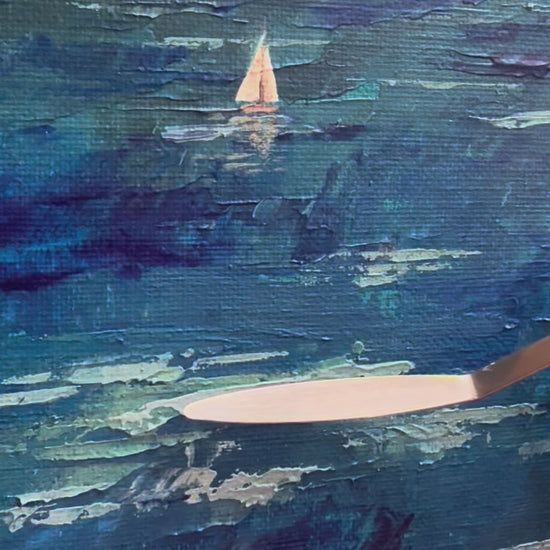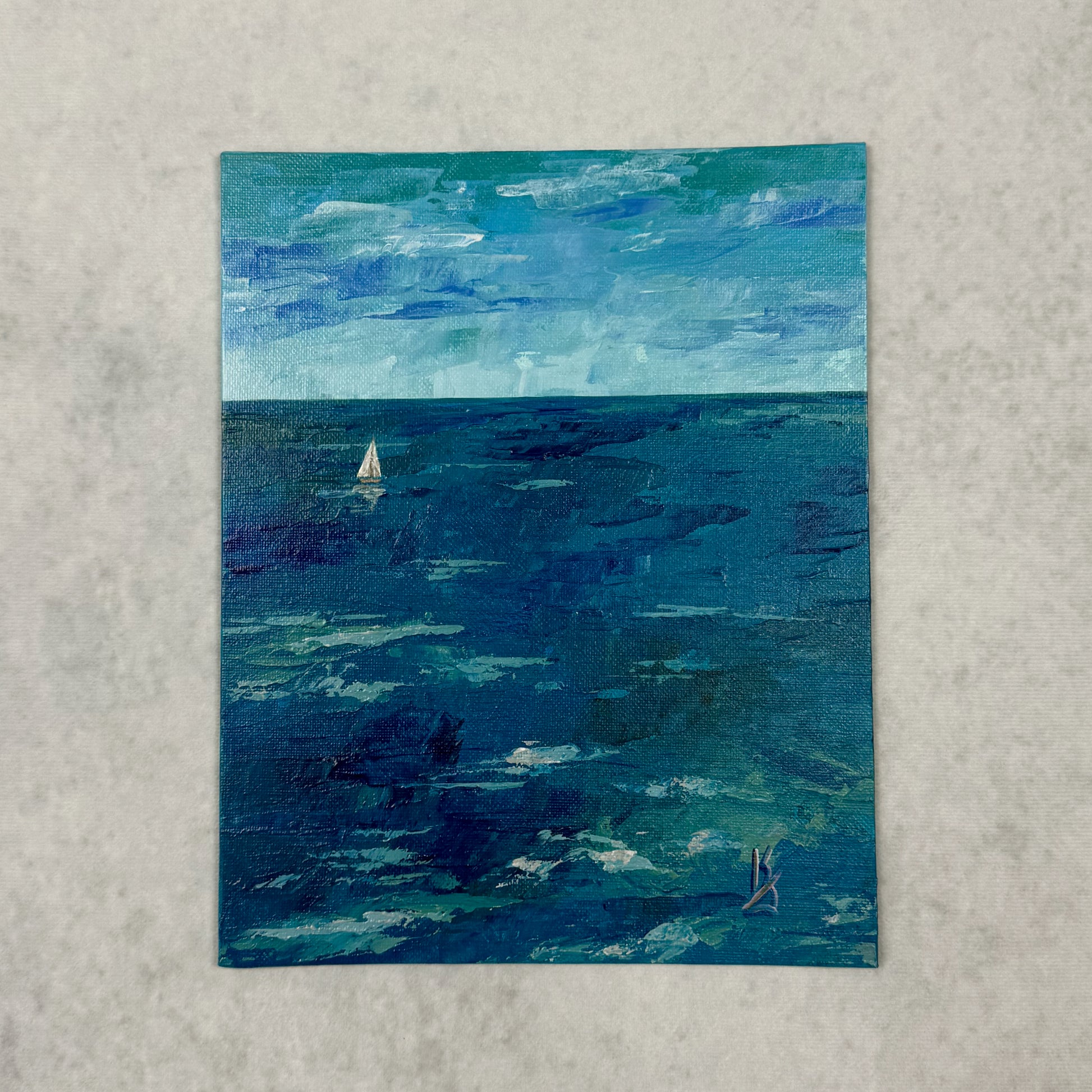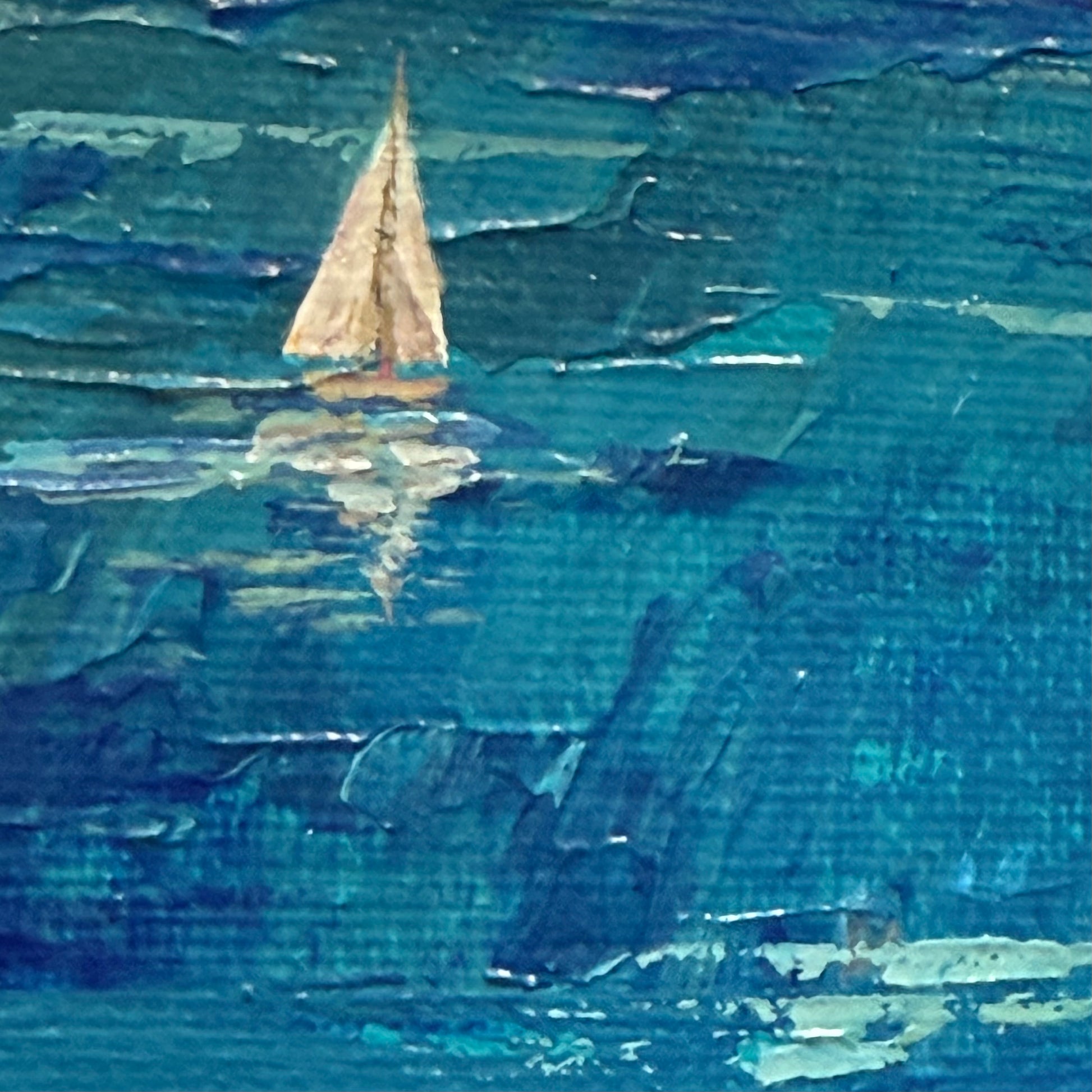 A peaceful sailboat gently rests on tranquil teal waters beneath soft, drifting clouds casting delicate shadows- a quiet sense of movement and calm, offering a meditative moment captured on canvas.