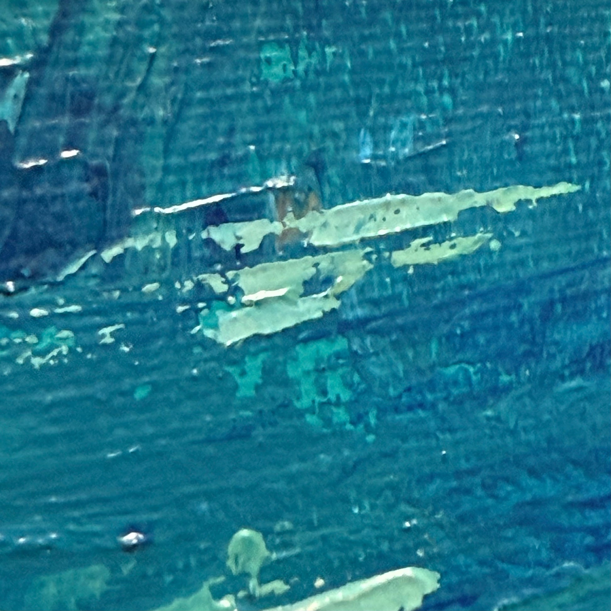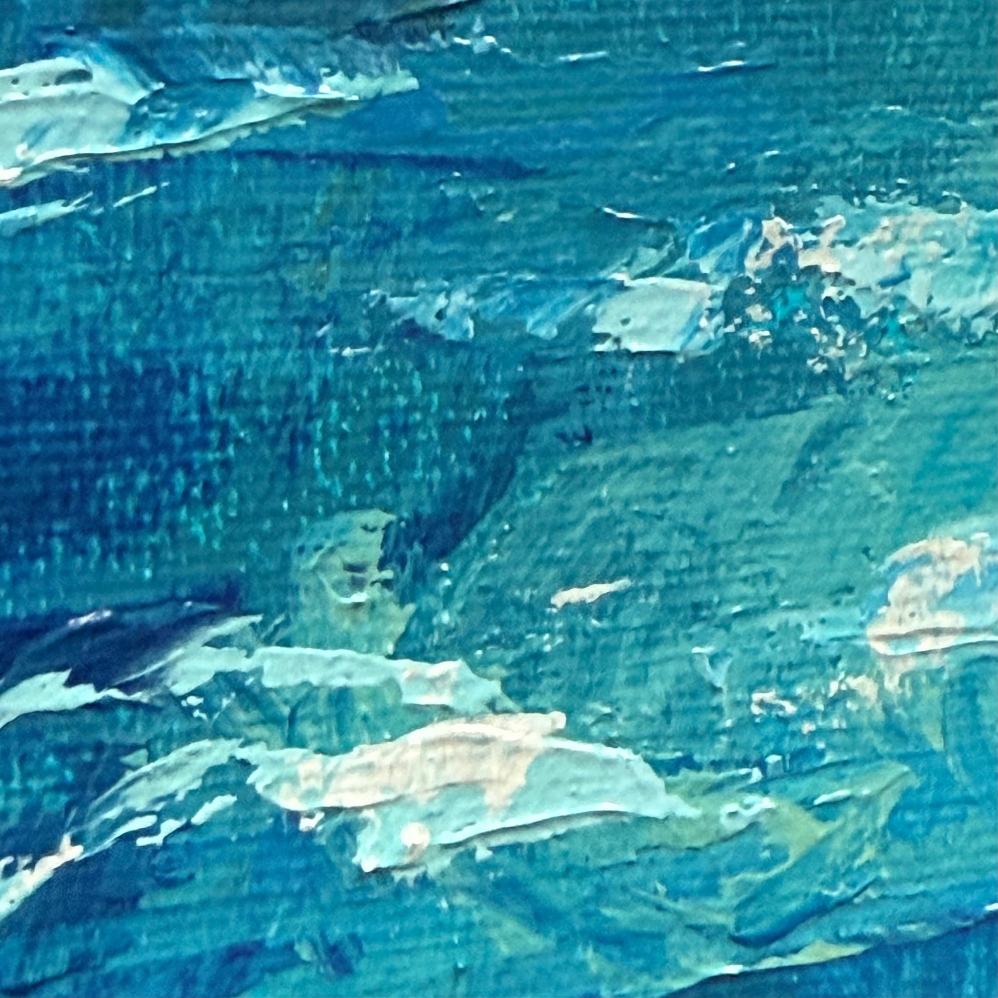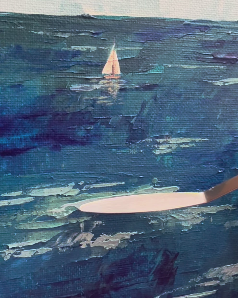 A peaceful sailboat gently rests on tranquil teal waters beneath soft, drifting clouds casting delicate shadows- a quiet sense of movement and calm, offering a meditative moment captured on canvas.