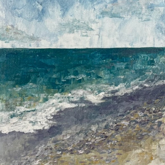 A serene shoreline painting in gentle lavender and teal hues, accented with tiny pebbles that bring texture and quiet elegance.