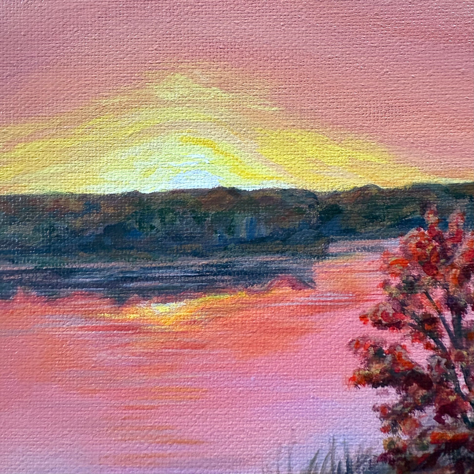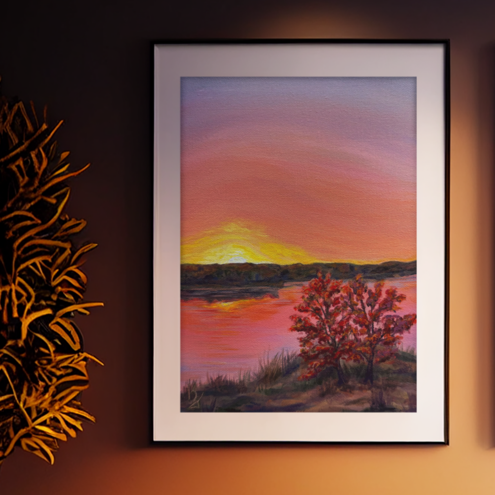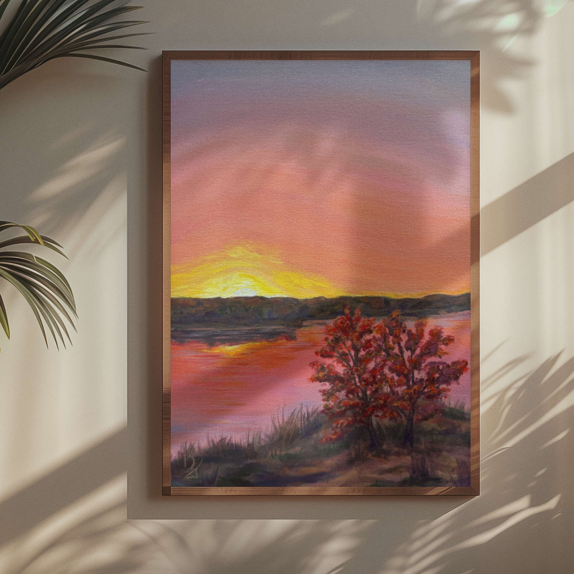 This artwork captures a serene lakeside moment as the day gently slips into night. Two red oaks stand silhouetted against the deep, glowing sunset. Rich, warm tones blend along the horizon, filling the scene with quiet emotion and peaceful light.