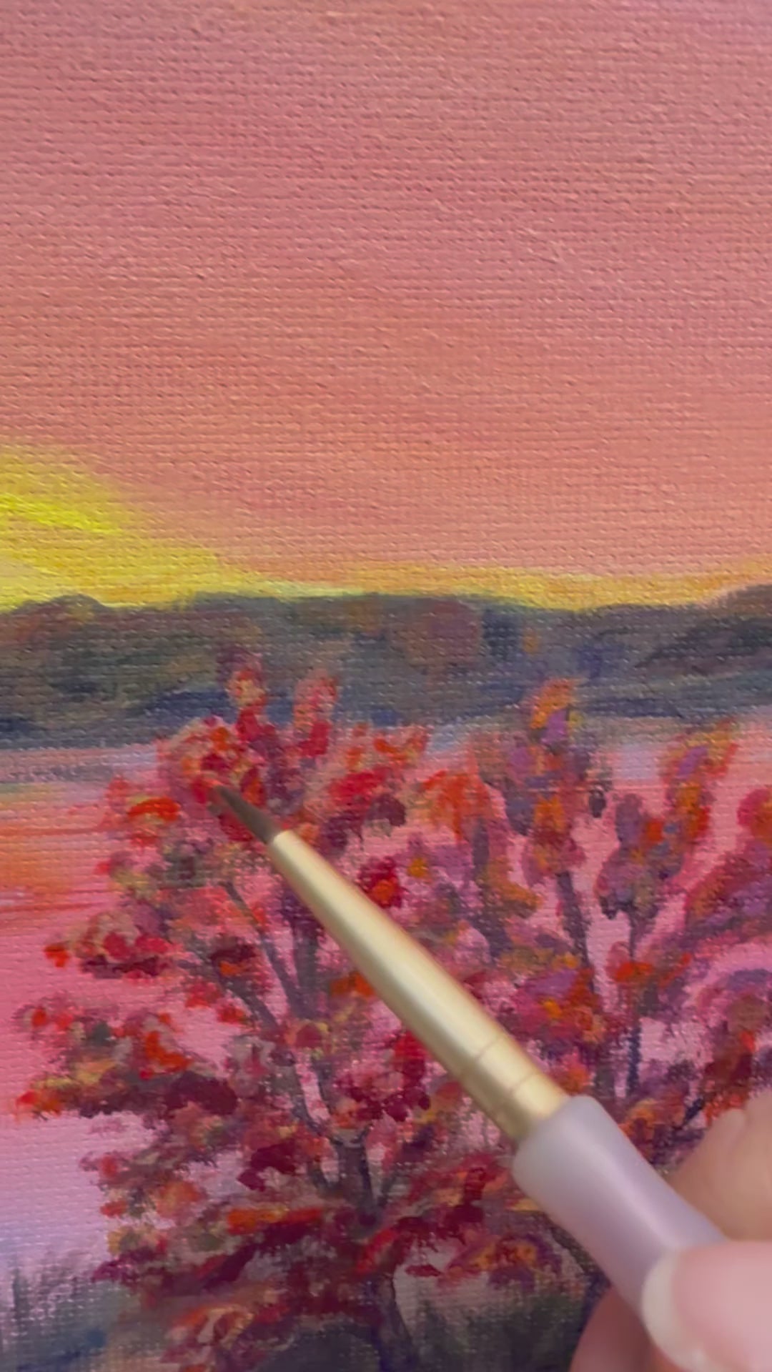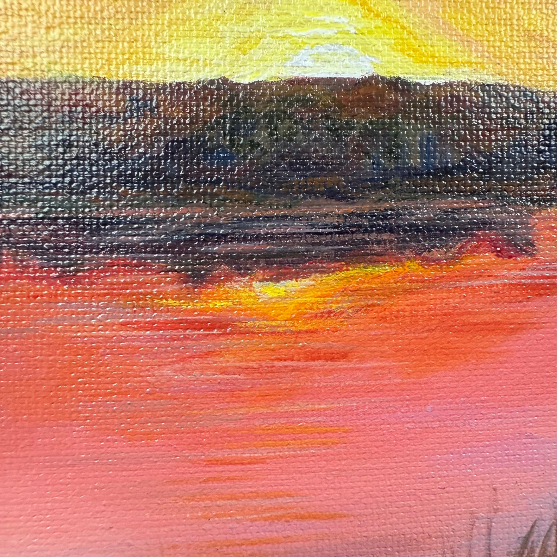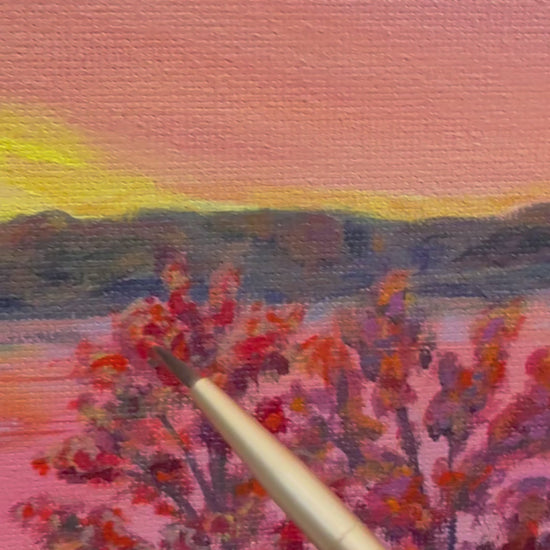 This artwork captures a serene lakeside moment as the day gently slips into night. Two red oaks stand silhouetted against the deep, glowing sunset. Rich, warm tones blend along the horizon, filling the scene with quiet emotion and peaceful light.