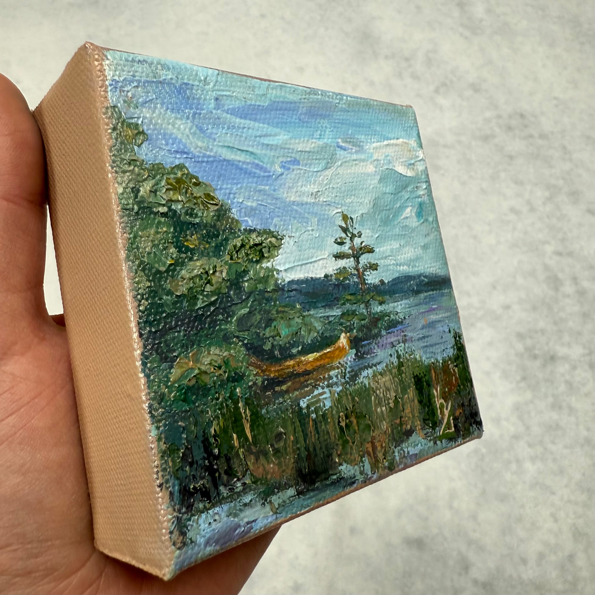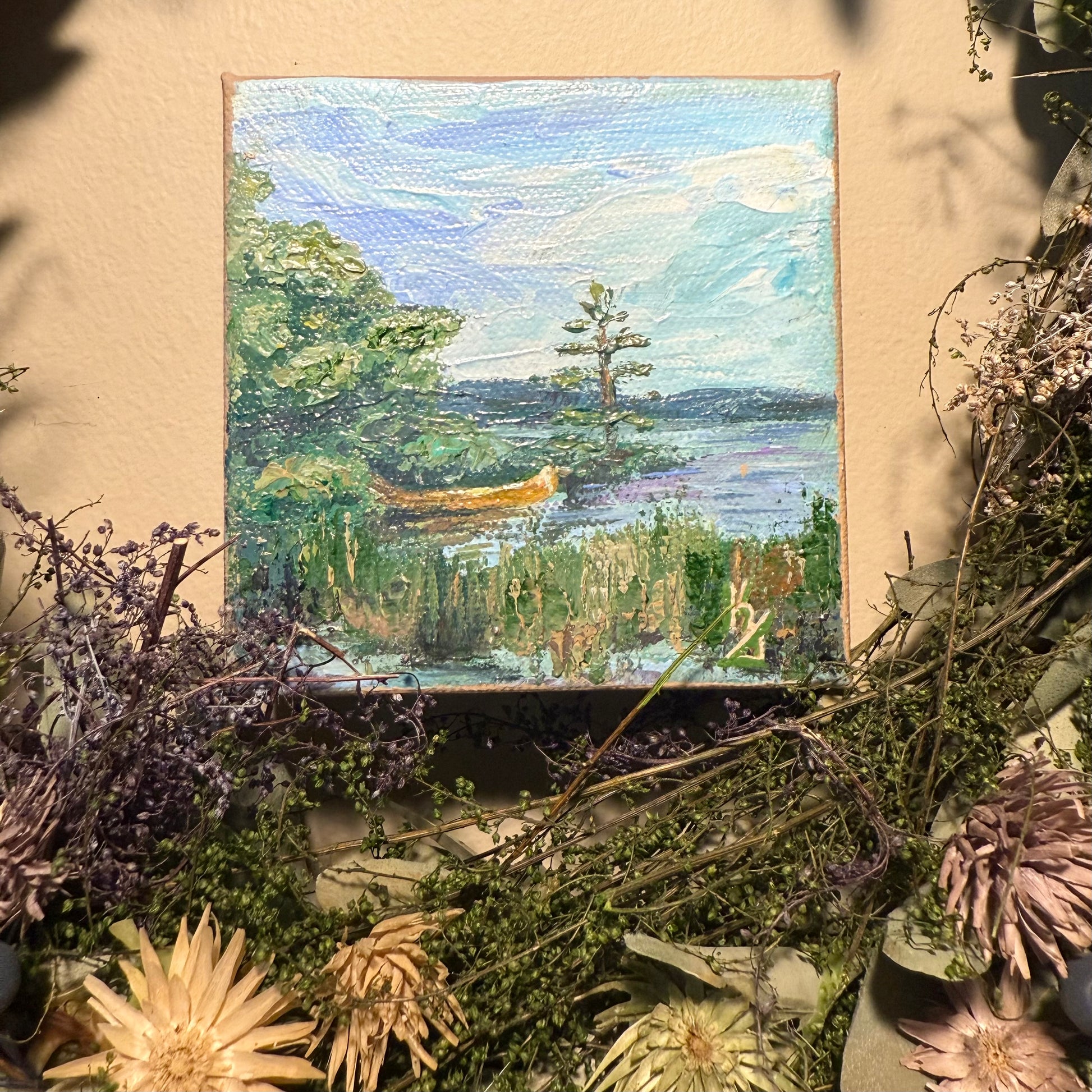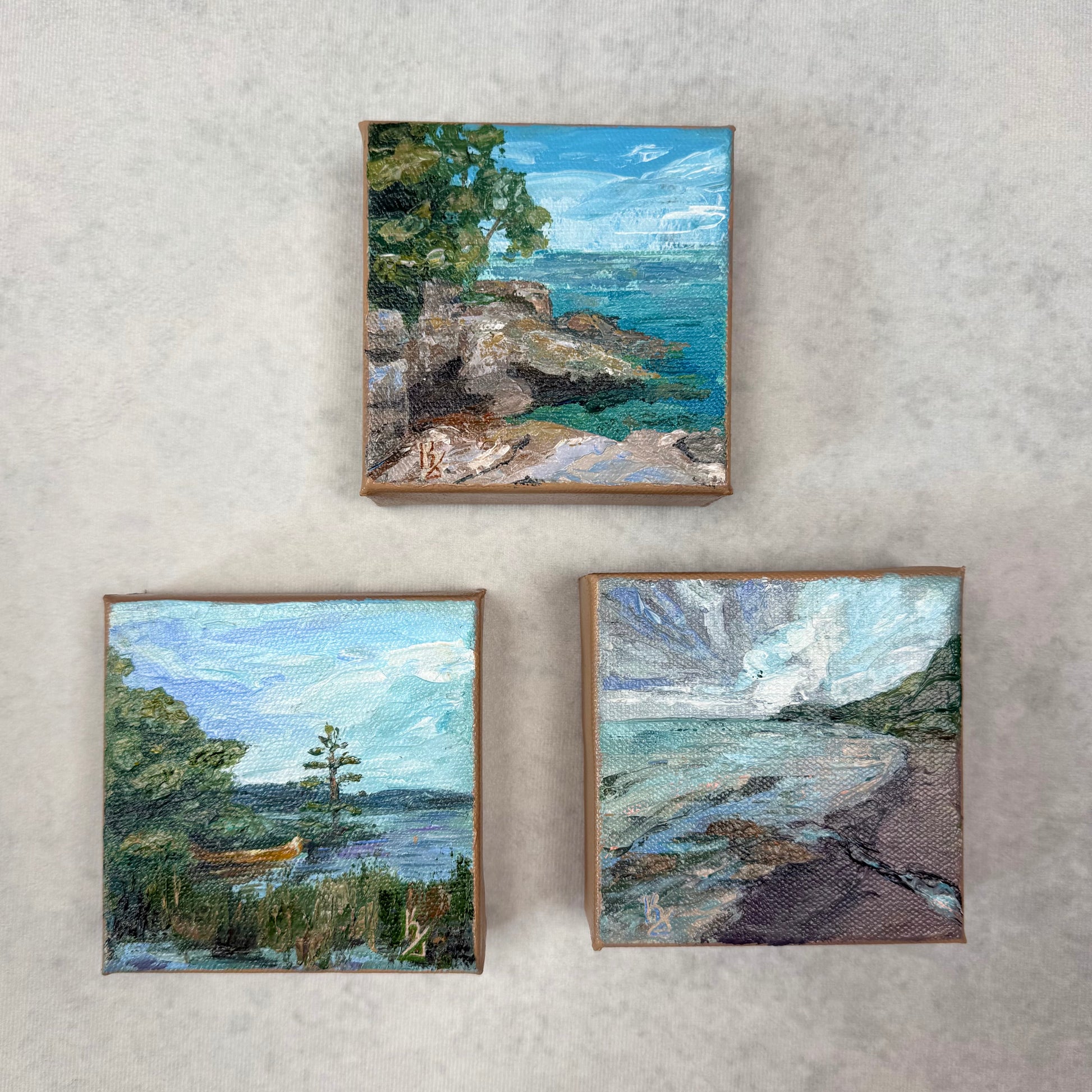 Original acrylic paintings with textured palette knife strokes, capturing moments from a Voyageurs National Park trip.