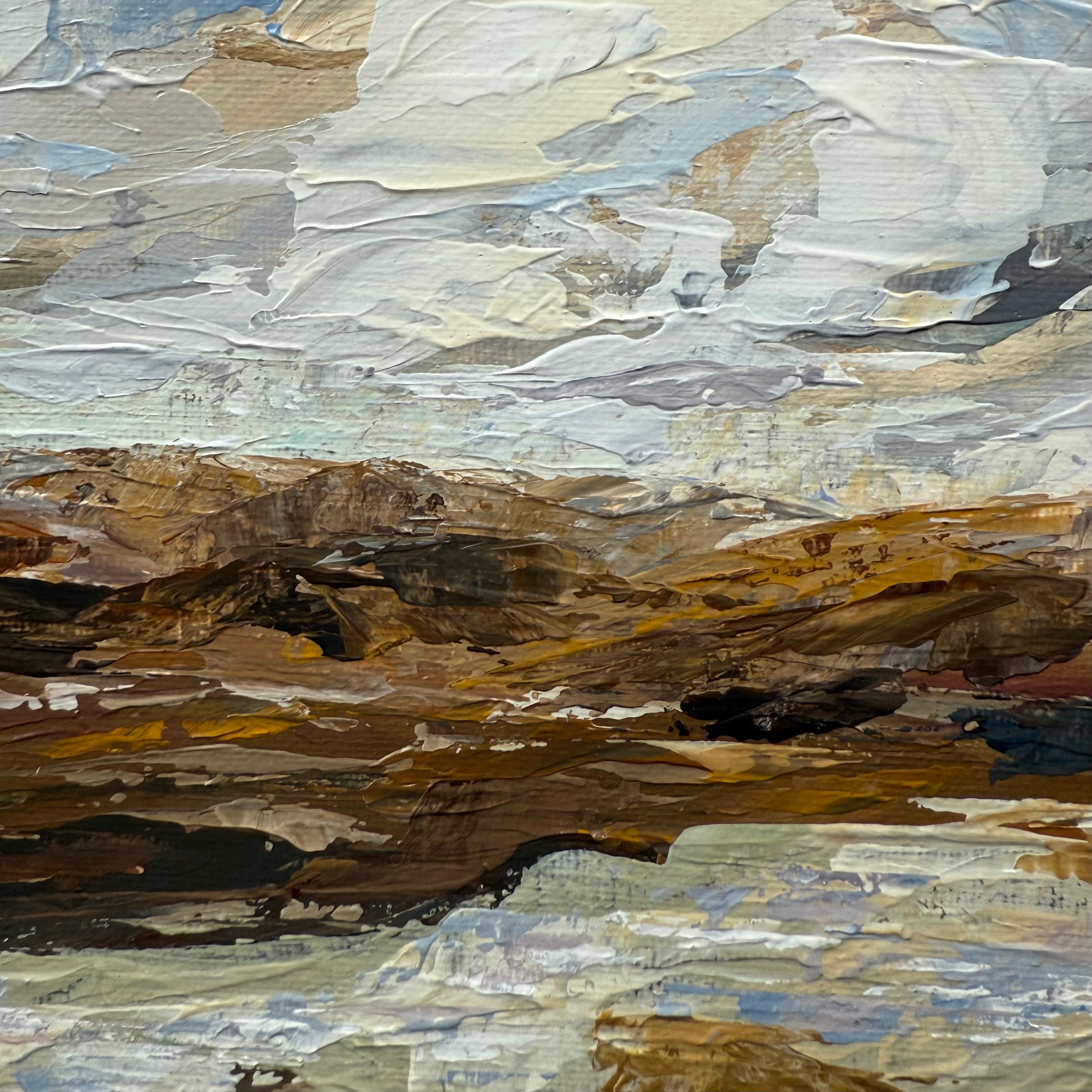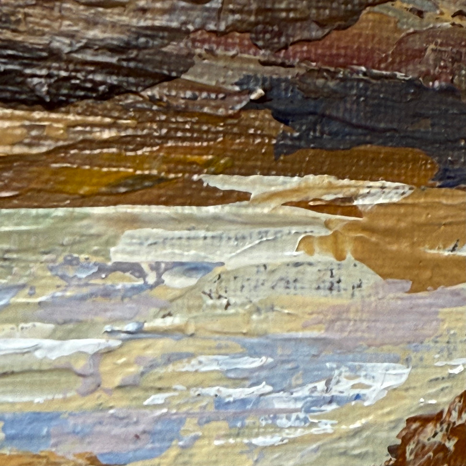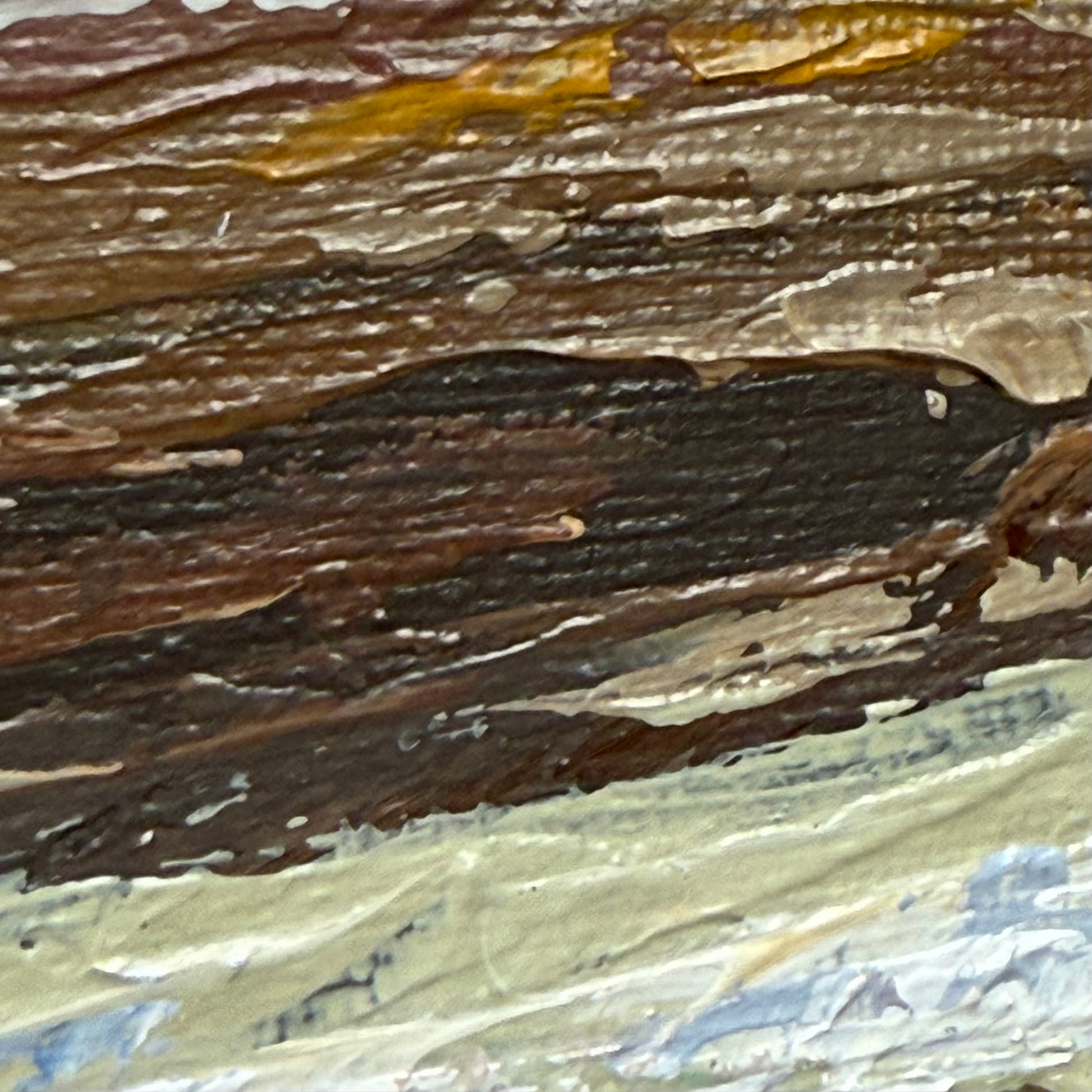 An abstract landscape painting with textured palette knife strokes in golden browns and blue-violet waters — a warm, calming piece of grasses and water that brings depth and harmony.Overall print size includes a 0.25-inch white border for easy framing and to preserve the full image.