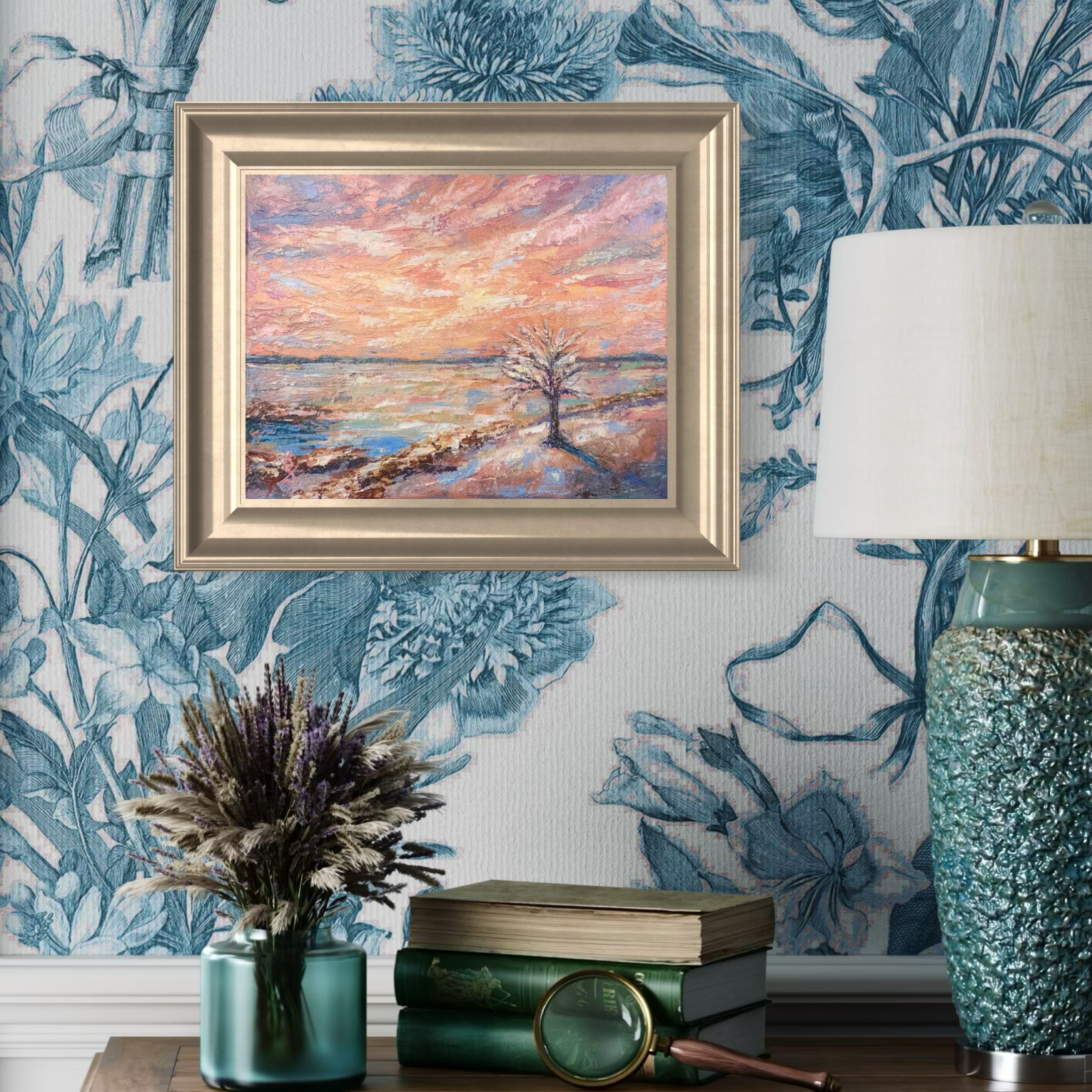 Inspired by winter sunsets, this painting features soft pink tones glowing over a solitary tree beneath the sun. Warm shadows stretch across the grasses, while textured acrylic palette knife strokes create depth, light, and quiet movement—a winter that embraces you with warmth from within.